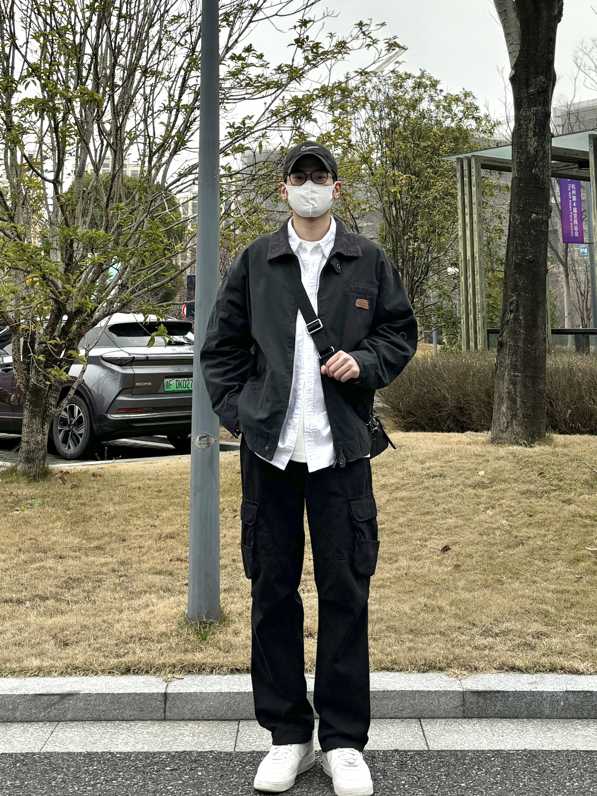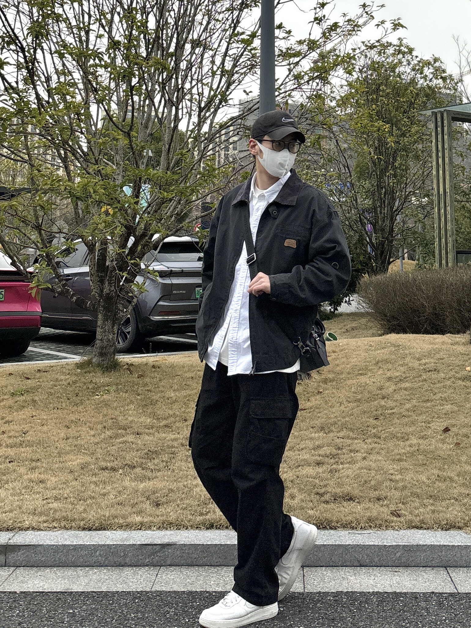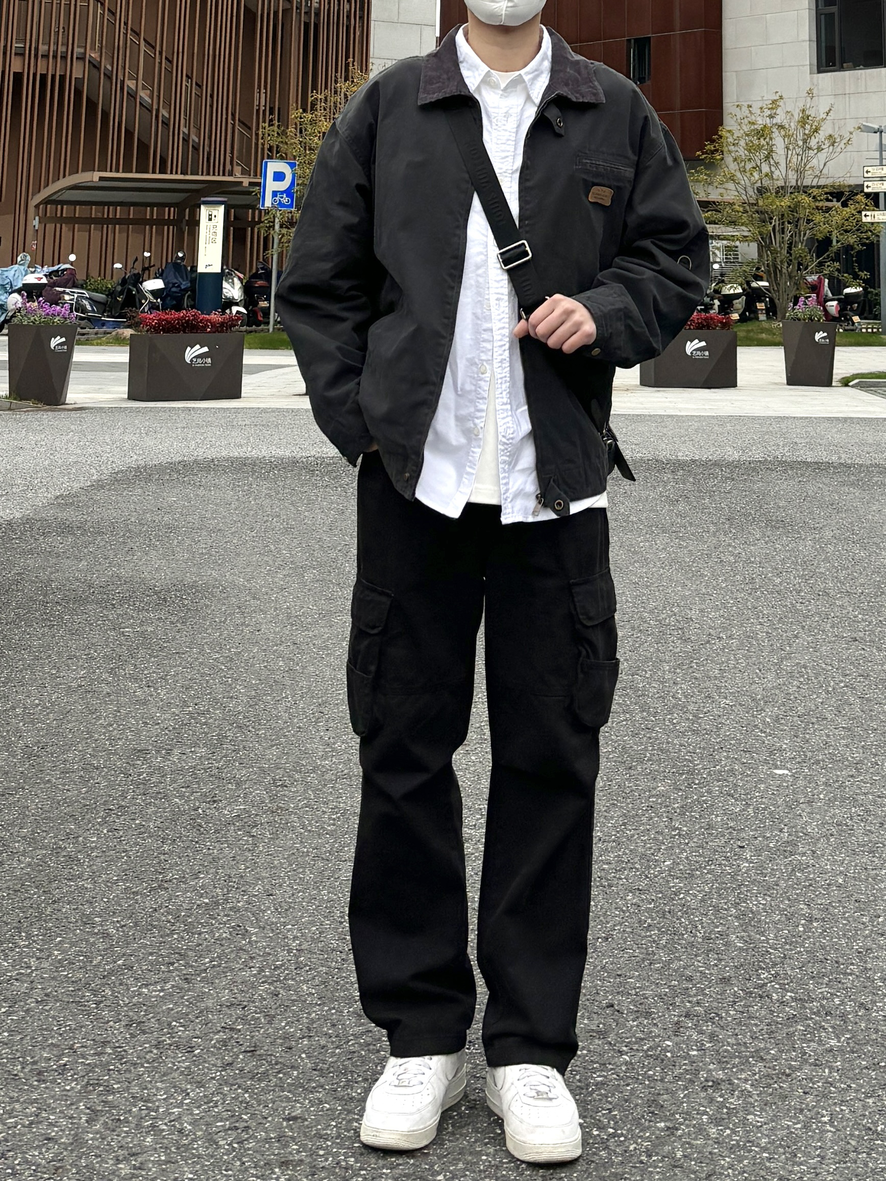 今天这套先用清爽干净的白衬衫做内搭,裤子选择简约大方的黑色直筒做旧多口袋工装裤,鞋子上脚经典百搭的纯白色af1,接着套上深灰色宽松阔版重磅复古猎装夹克,最后背一个精致的皮质斜挎包,OK,出门看看搭配效果吧! - 今日穿搭 衣服裤子:NICE LILI 鞋子:AF1纯白