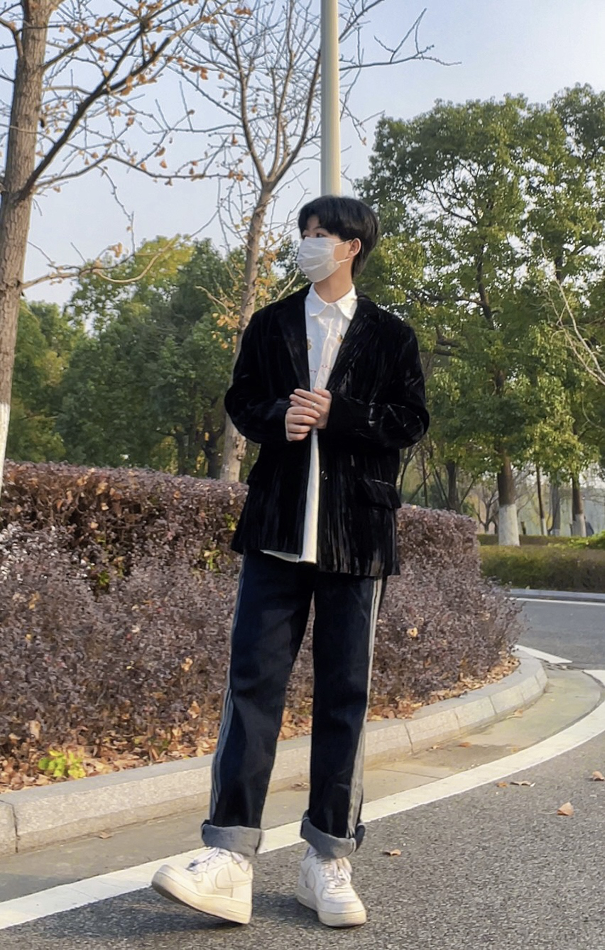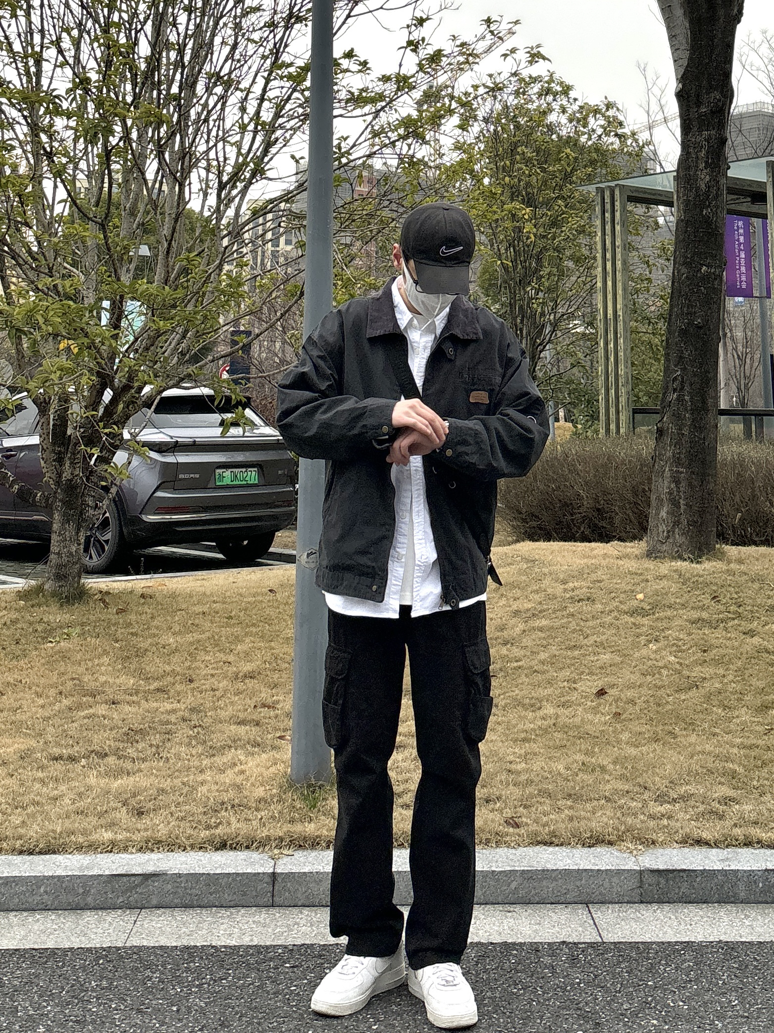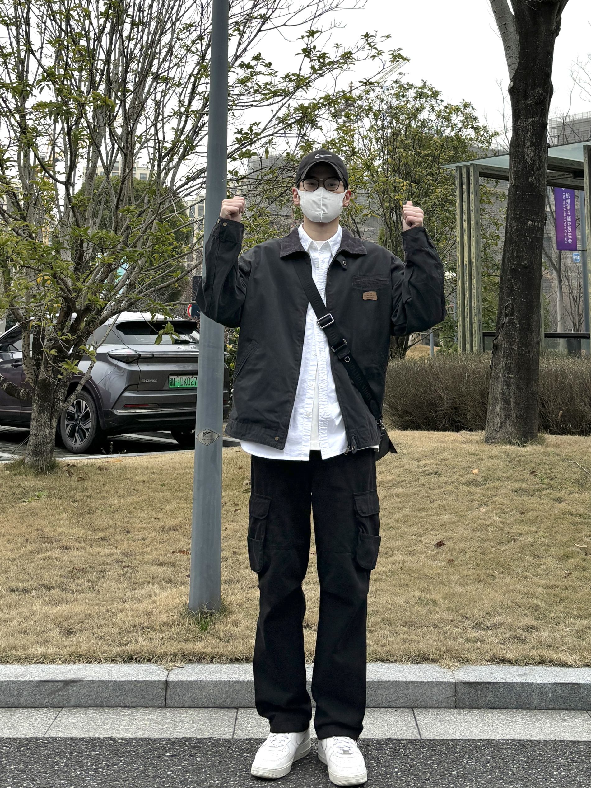 今天这套先用清爽干净的白衬衫做内搭,裤子选择简约大方的黑色直筒做旧多口袋工装裤,鞋子上脚经典百搭的纯白色af1,接着套上深灰色宽松阔版重磅复古猎装夹克,最后背一个精致的皮质斜挎包,OK,出门看看搭配效果吧! - 今日穿搭 衣服裤子:NICE LILI 鞋子:AF1纯白