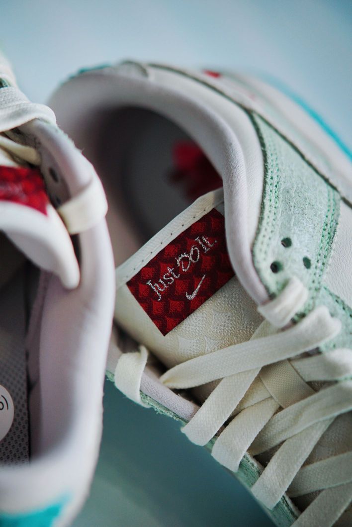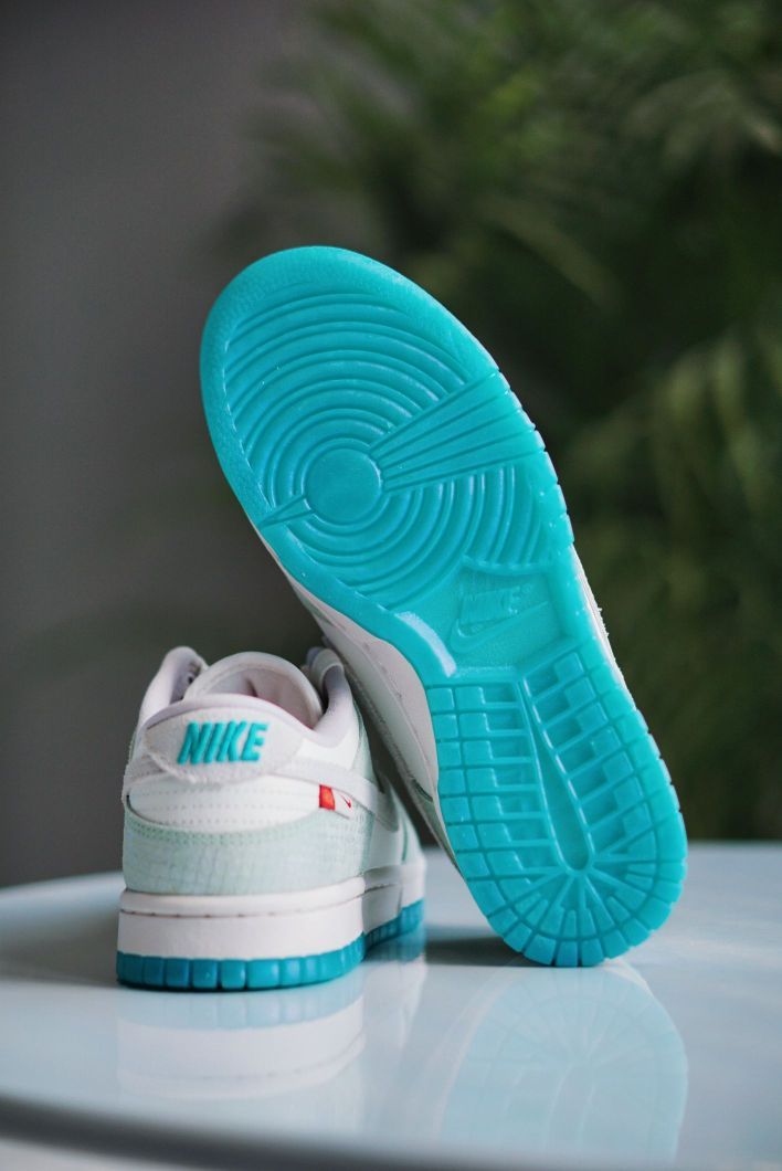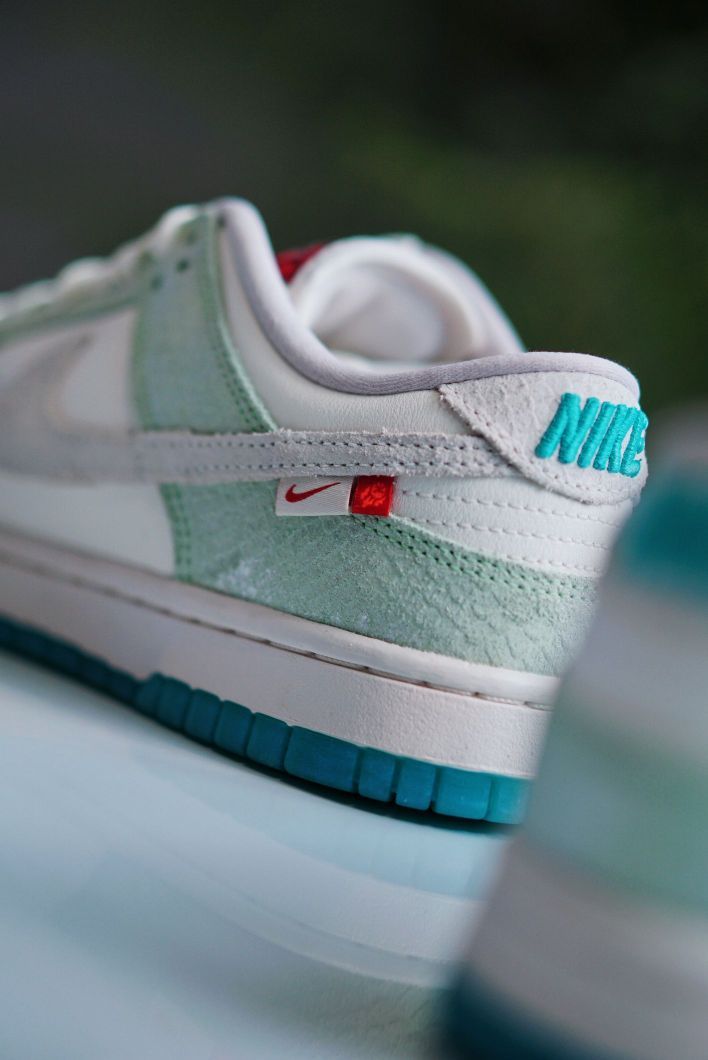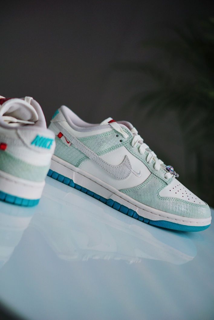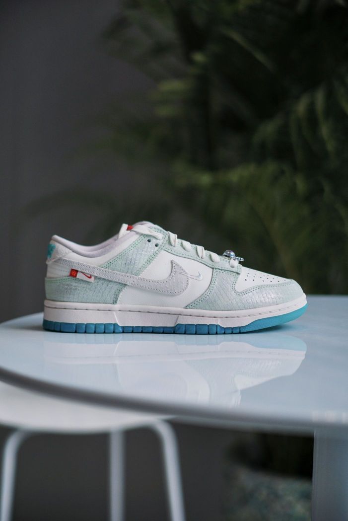 今年的新年限定颜色真的好绝 每一款都有自己的特色 这双女生专属的DUNK也是丝毫不逊色 白蓝色的清新搭配 龙鳞图案的暗纹 龙爪和龙珠样式的鞋带扣 再辅以水晶透明大底 构成这双颜值超高的龙年DUNK 感觉又会成为一双曝款