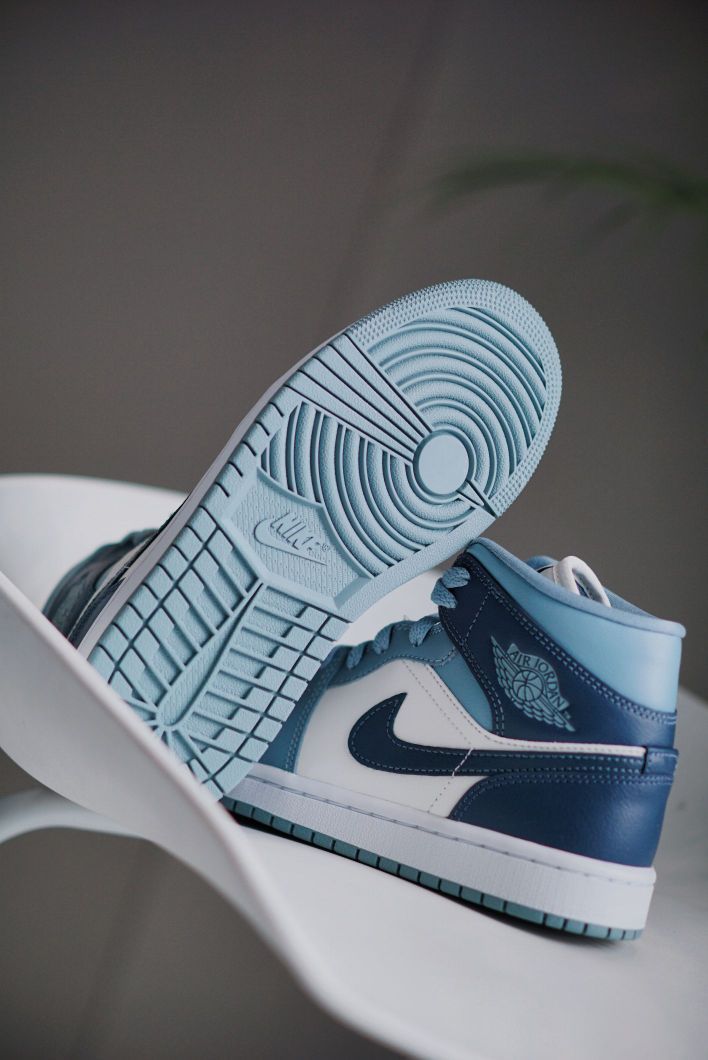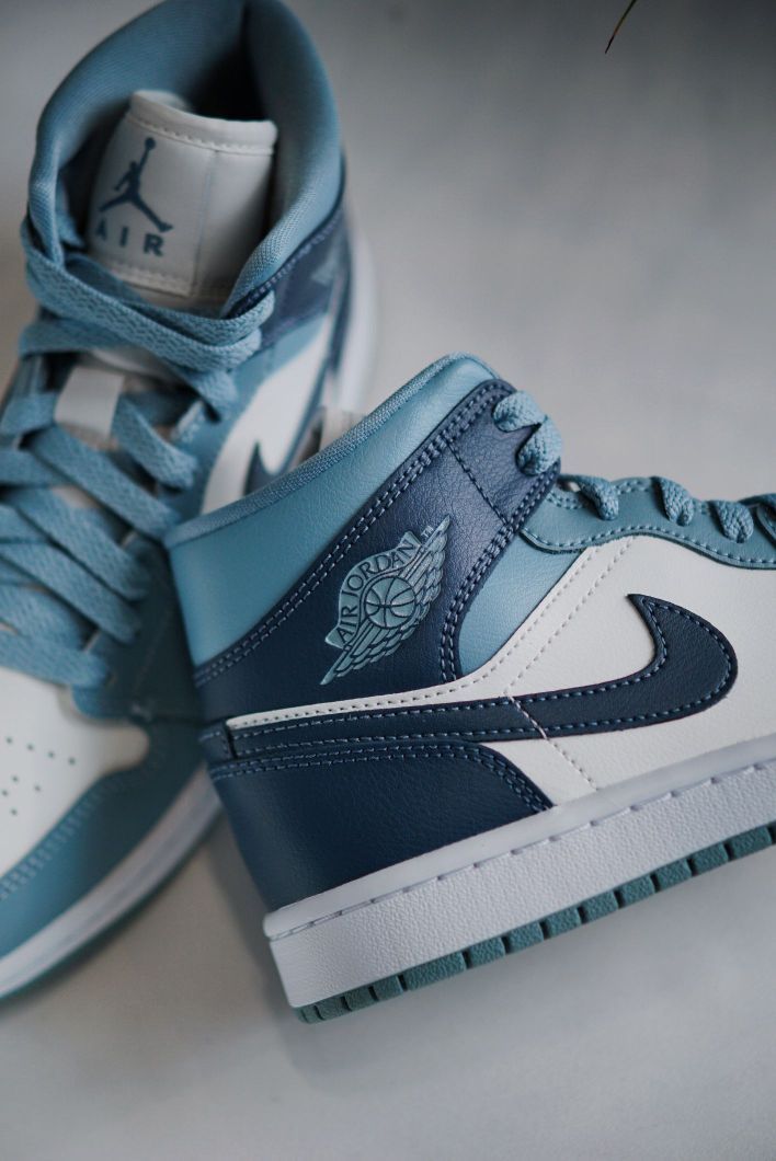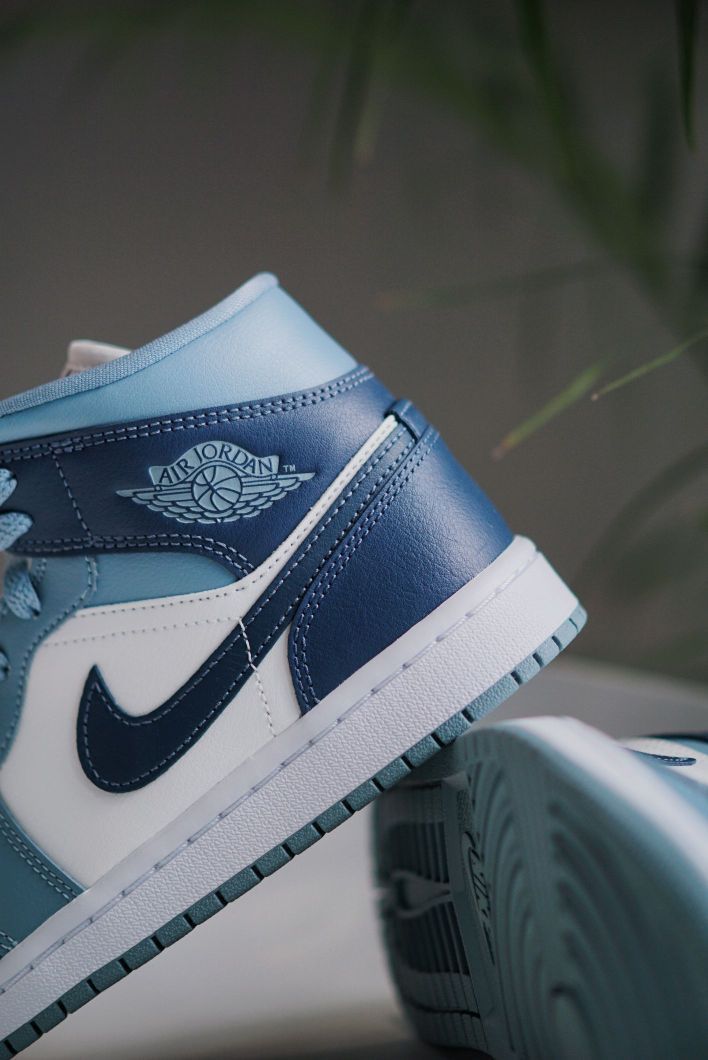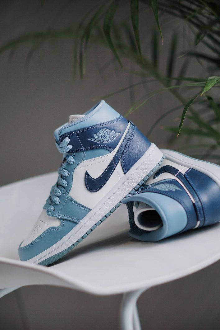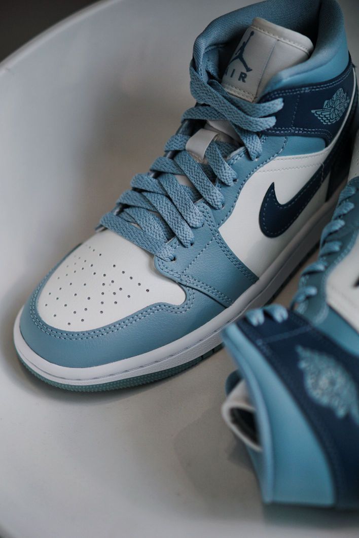 这抹蓝色还挺少见的 新配色的AJ1MID个人觉得算很好看的了 两种不同深浅的蓝色组合 虽然现在AJ1不像之前那么火了 但是本身是一双很适合搭配的鞋子