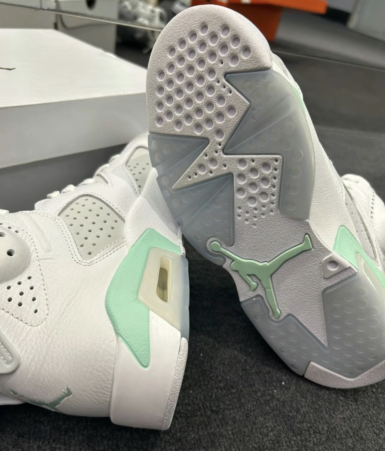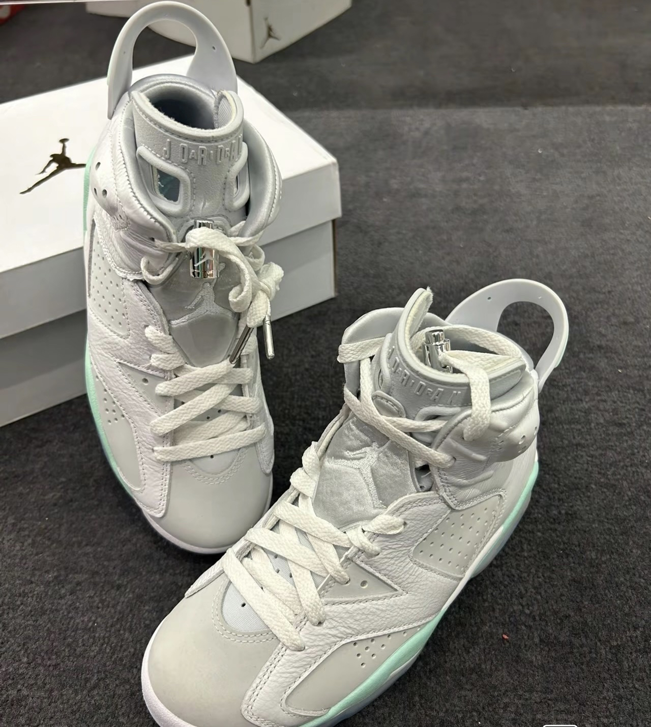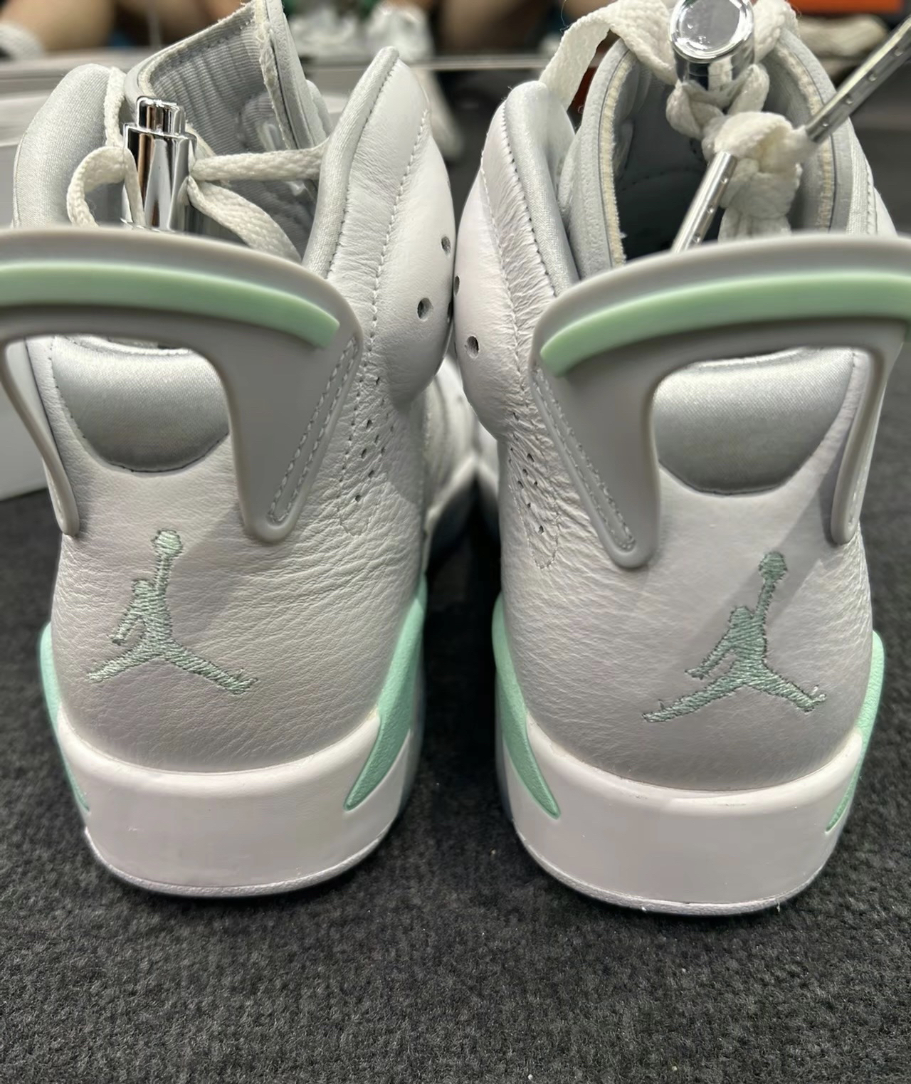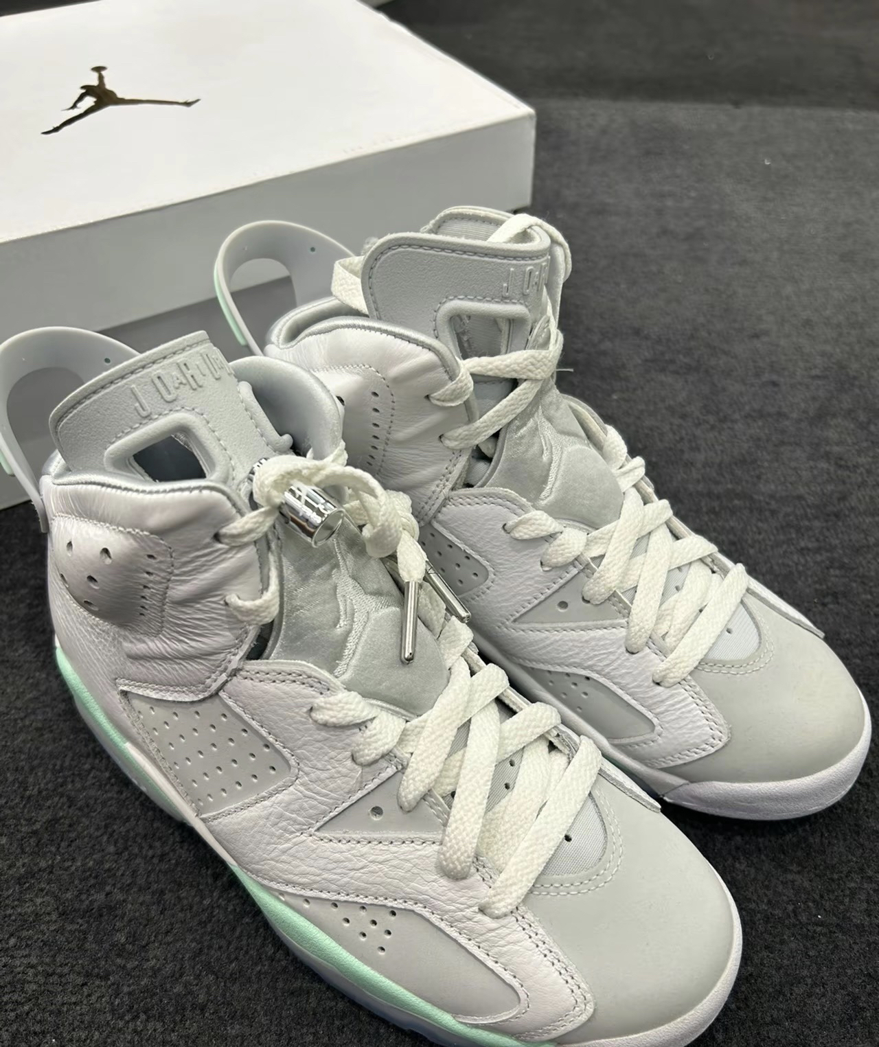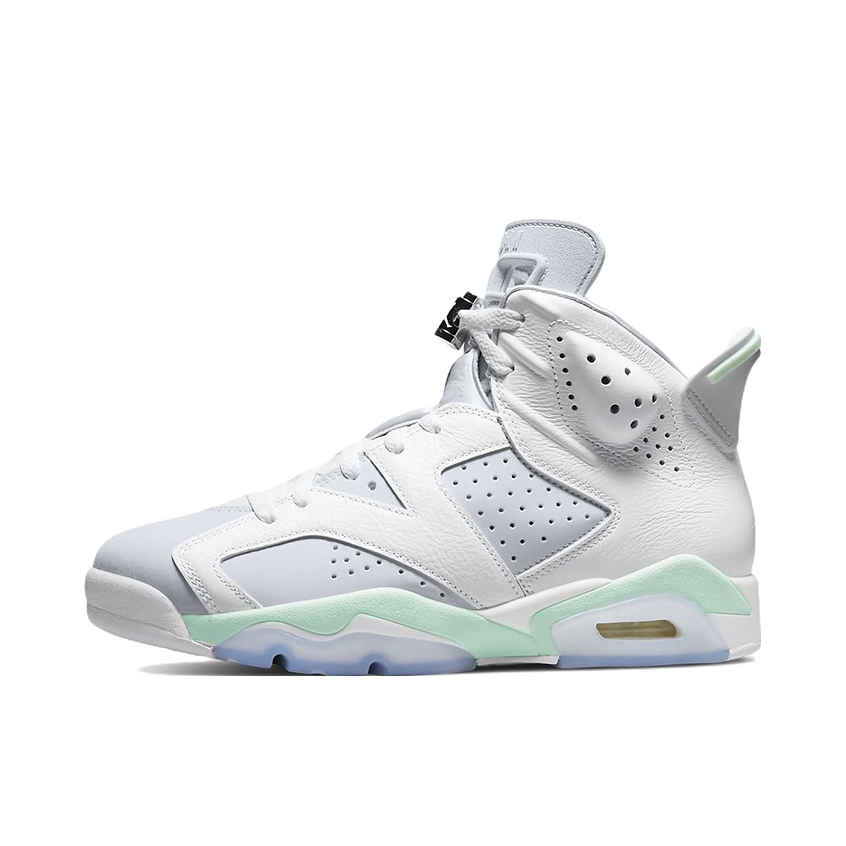 AIR JORDAN 6薄荷泡沫,白灰绿 整体采用简约白灰色设计,中底、鞋后跟和鞋垫 处分。 别饰有薄荷绿点缀,同时搭配冰感半透明外底,清爽 利落,夏季配短裤超好看!