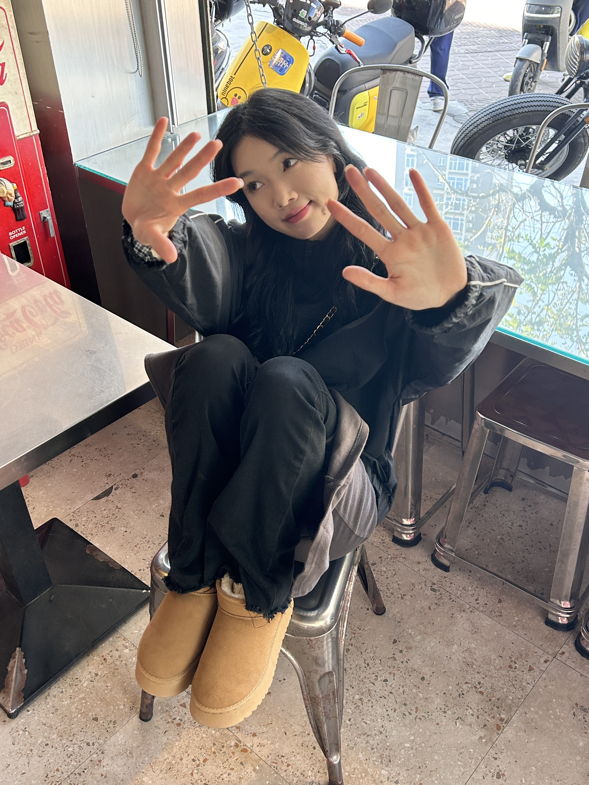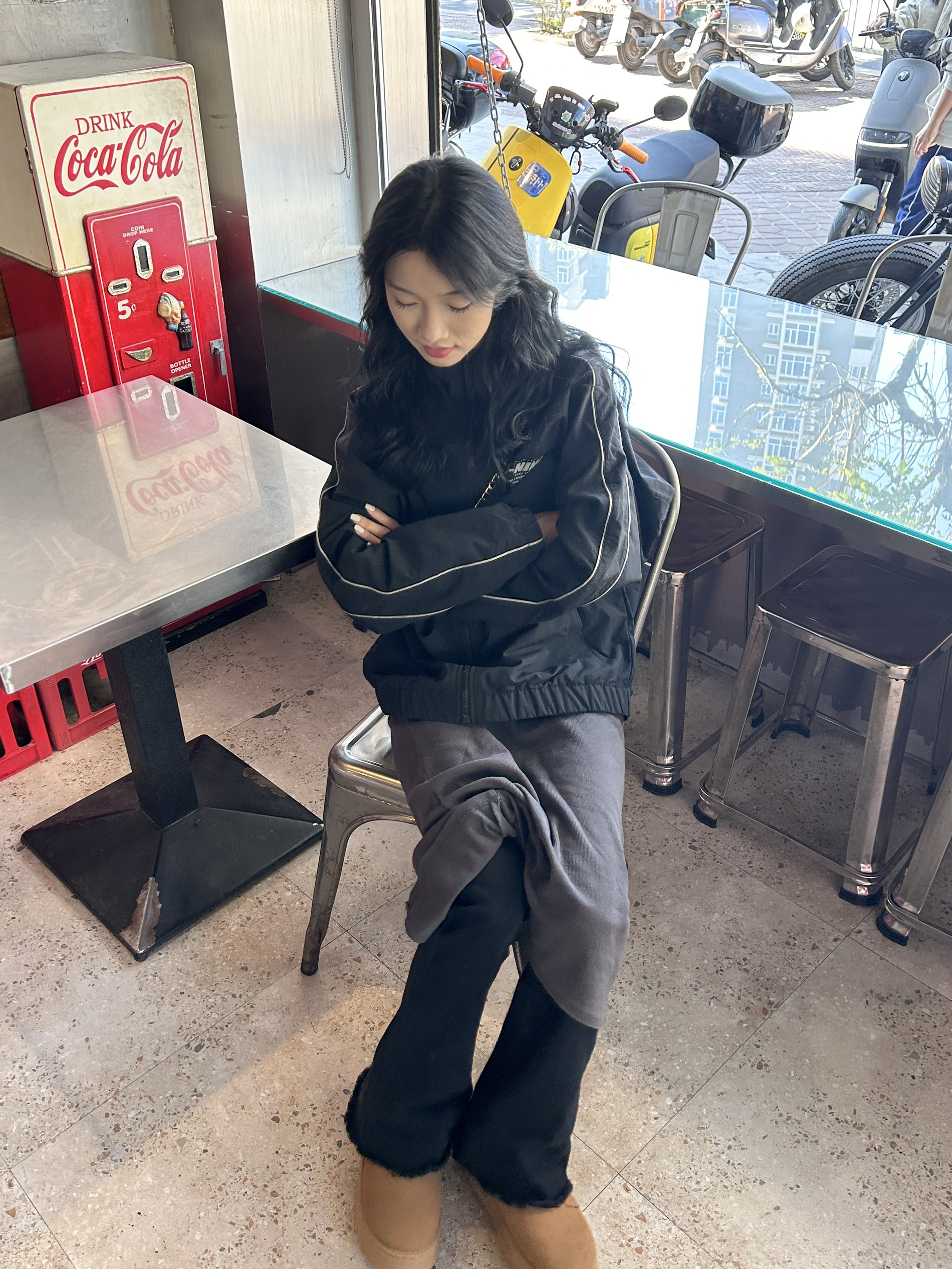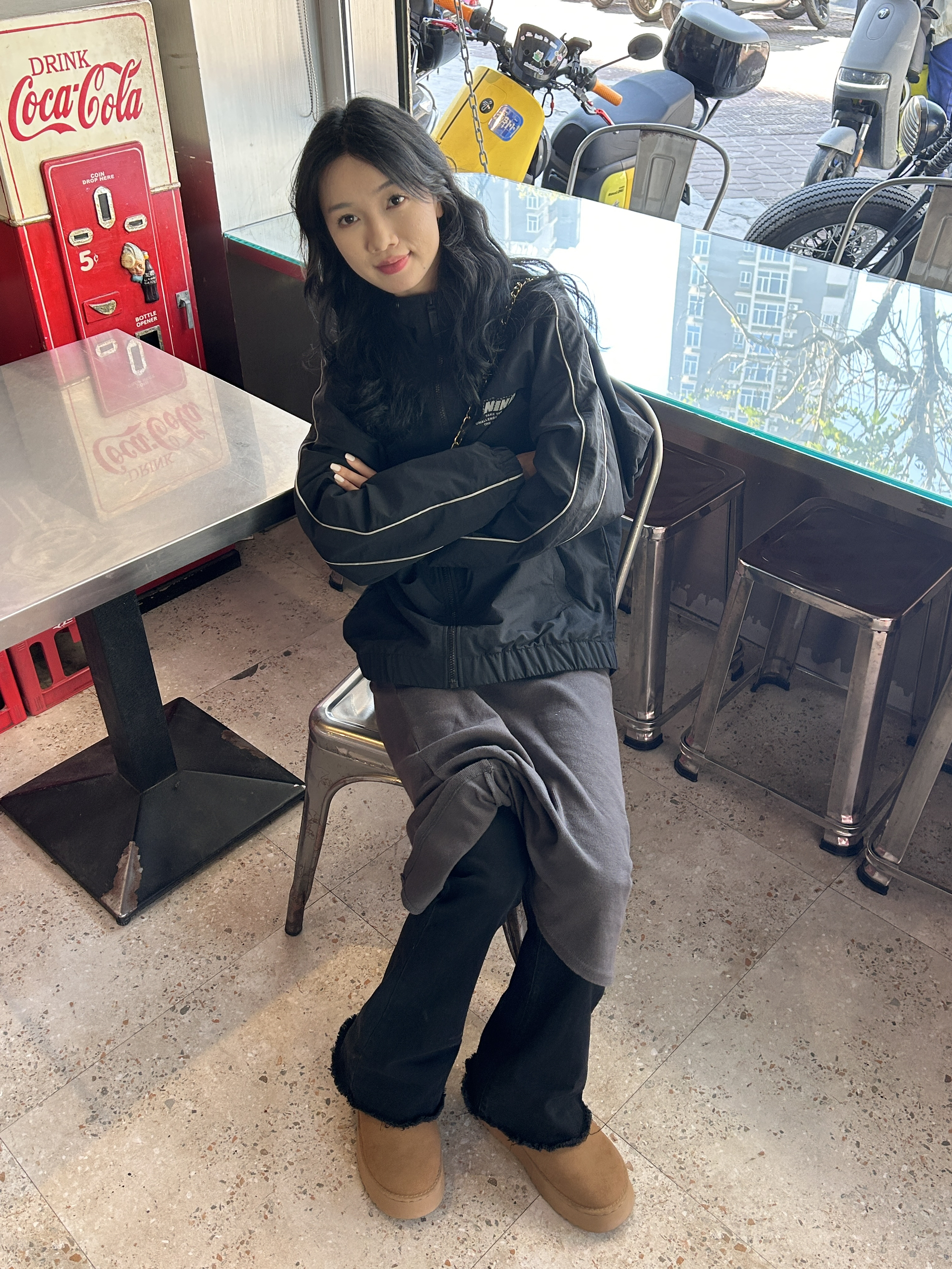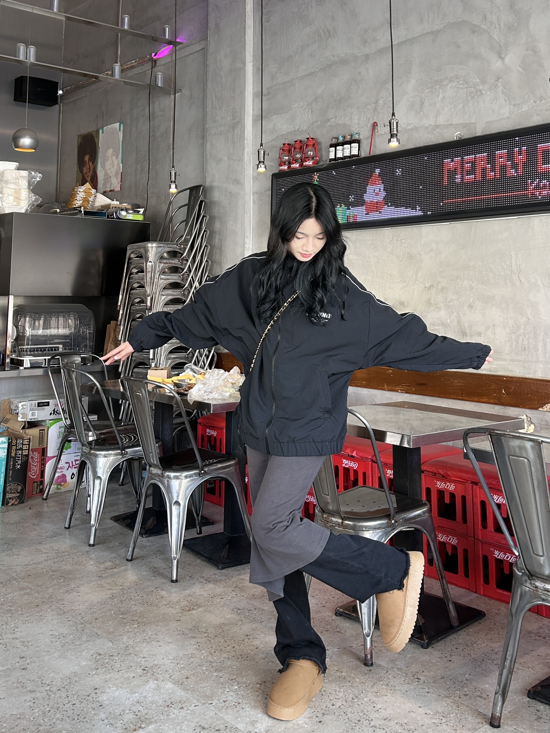 160/42 好冷啊这两天 出门探店穿搭 李宁黑色的冲锋衣,这件衣服好酷百搭 里面搭配一件裙子,黑色牛仔裤百搭日常 搭配粽色的雪地靴保暖又舒服😌