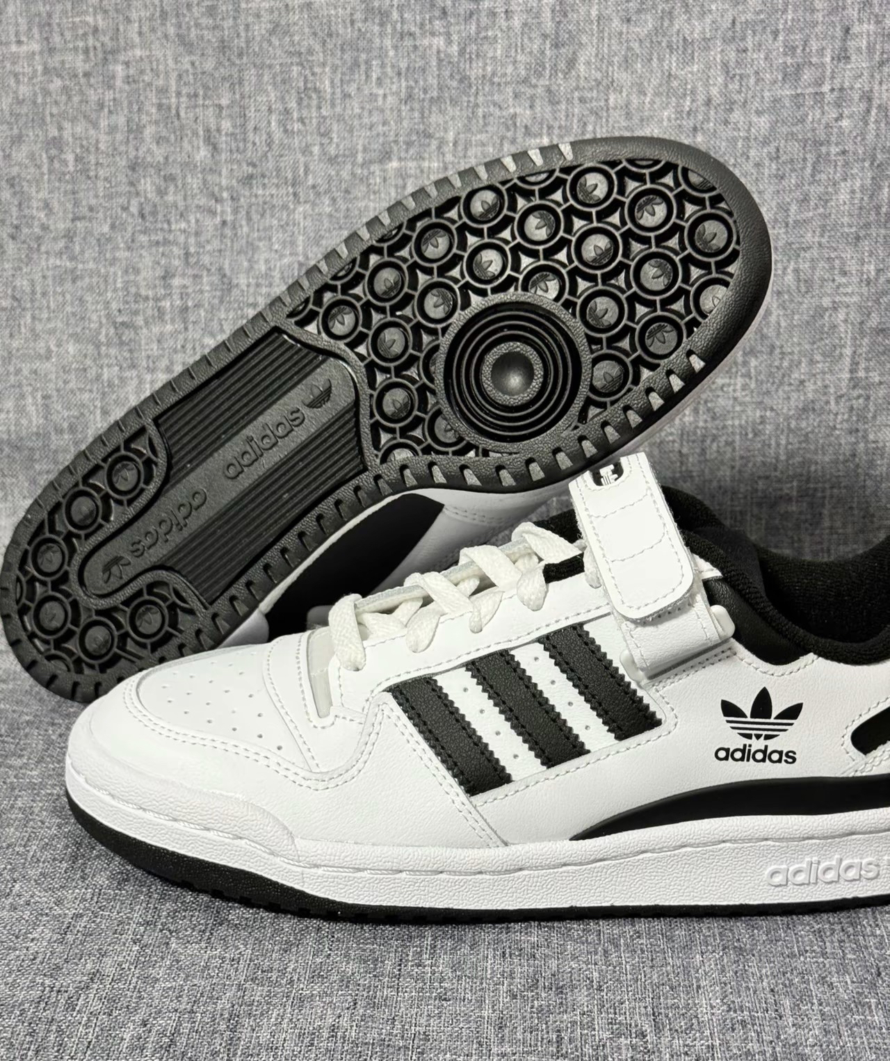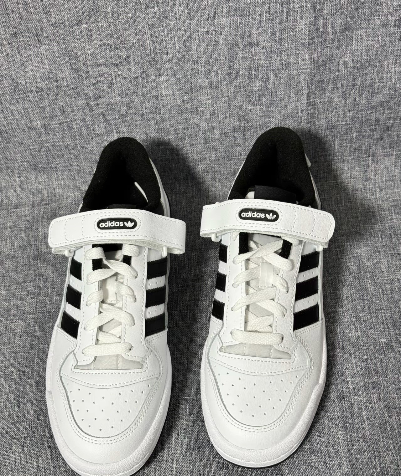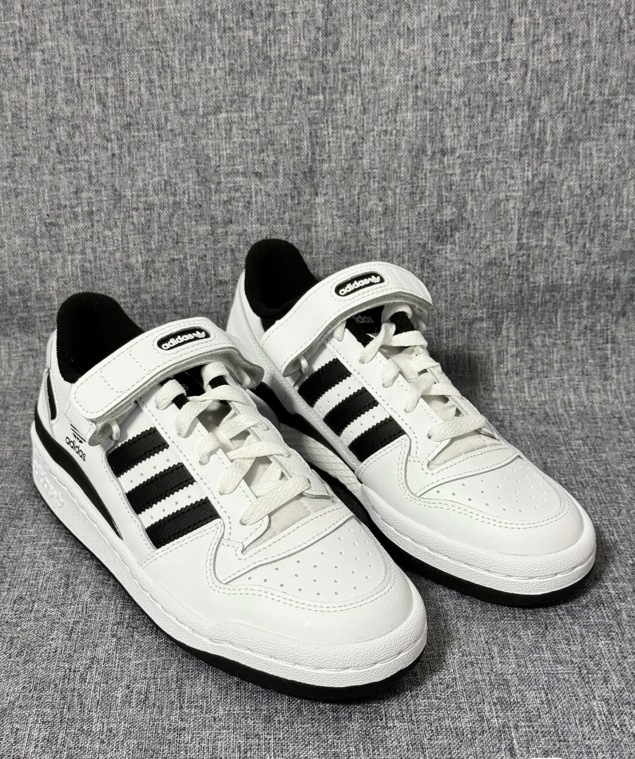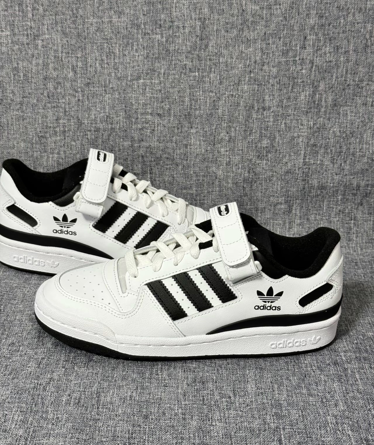 Adidas Originals Forum Low“白黑” 鞋面材质:采用了合成革,质感很不错,魔术贴的点缀很凸显层次感 鞋身配色:大面积的白色加上些许黑色,经典的 配色就很耐看,颜值外观也很在线 尺码方面:不偏码,选择正常尺码就可以啦