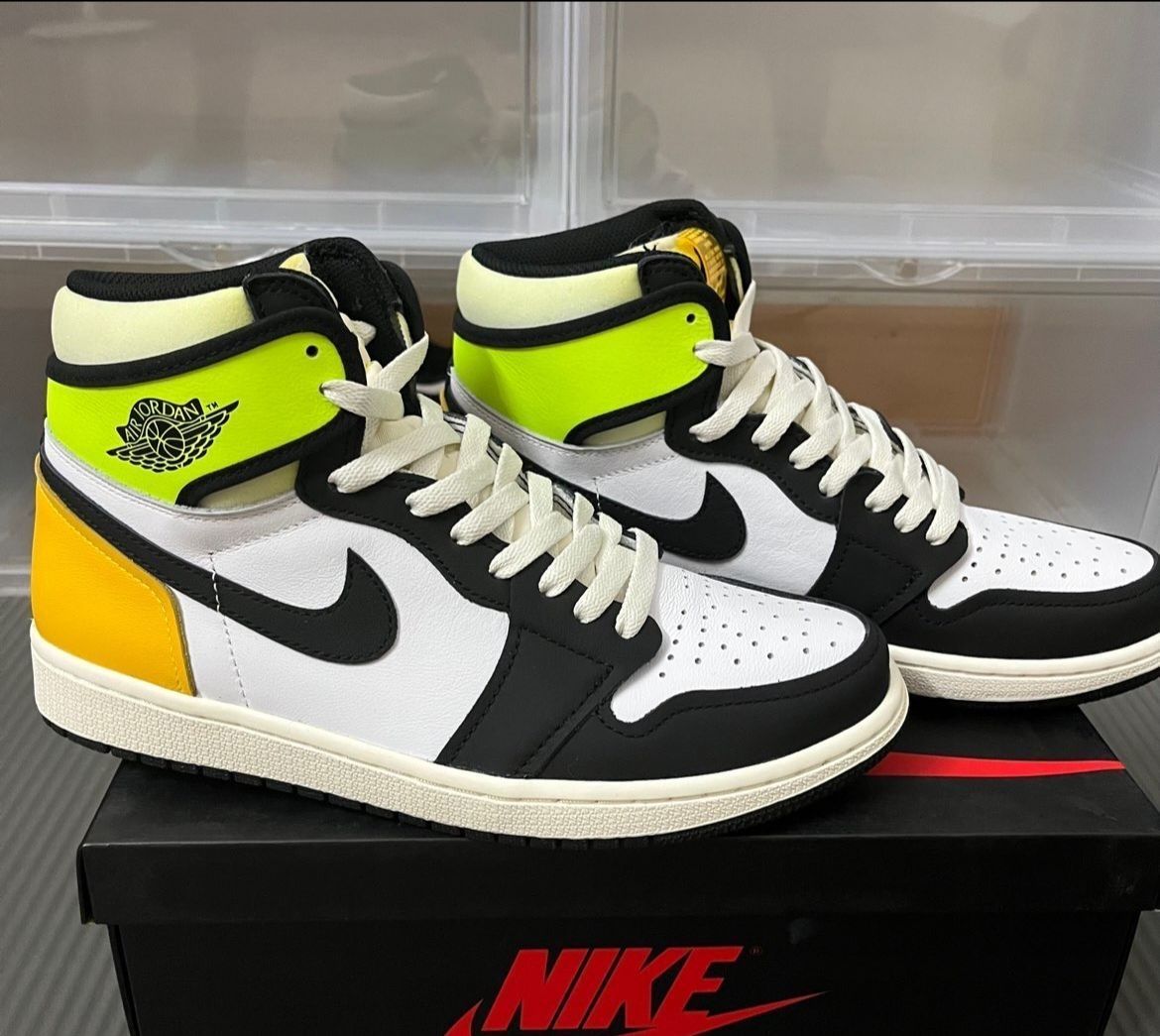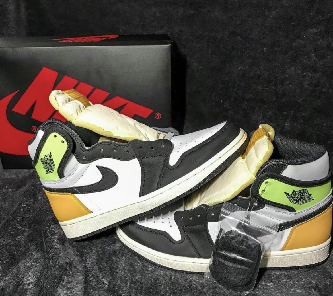以白黑荧光绿和橘黄色拼接呈现,鞋帮处和后跟以荧光土黄色点缀,十分跳脱视效。鞋头用黑脚趾配色,乳白色的中底和黑色橡胶外底作为结尾。明亮大胆看起来更加年轻。鞋舌部位的“Nike Air”标签被反转,采用可拆线设计。 分离式鞋帮绑带、鞋舌上突出的泡棉、反转的鞋舌标签以及三种色调的搭配,荧光黄与橘黄色还有帆白色组成后跟向经典的Black Toe配色致敬!