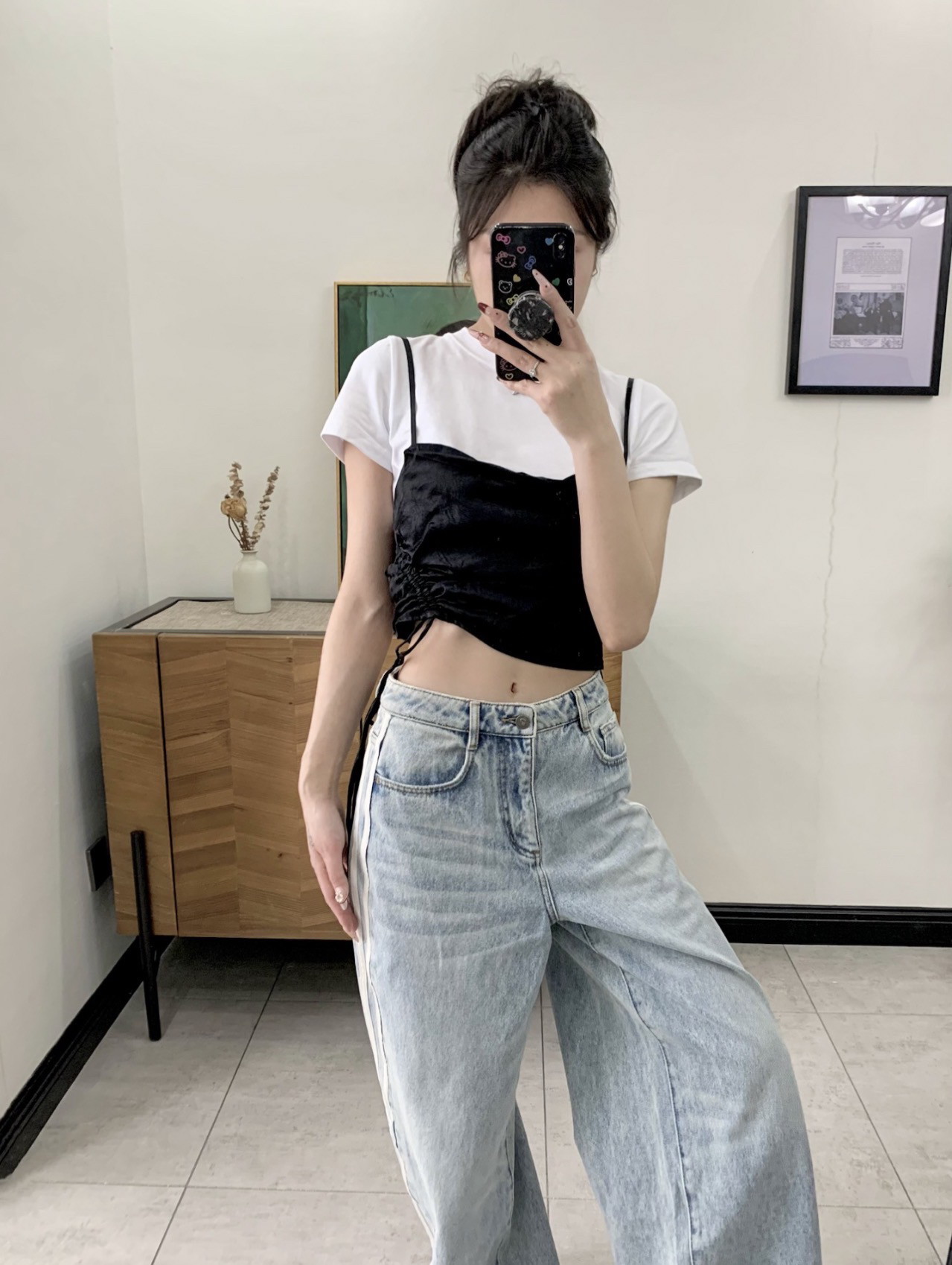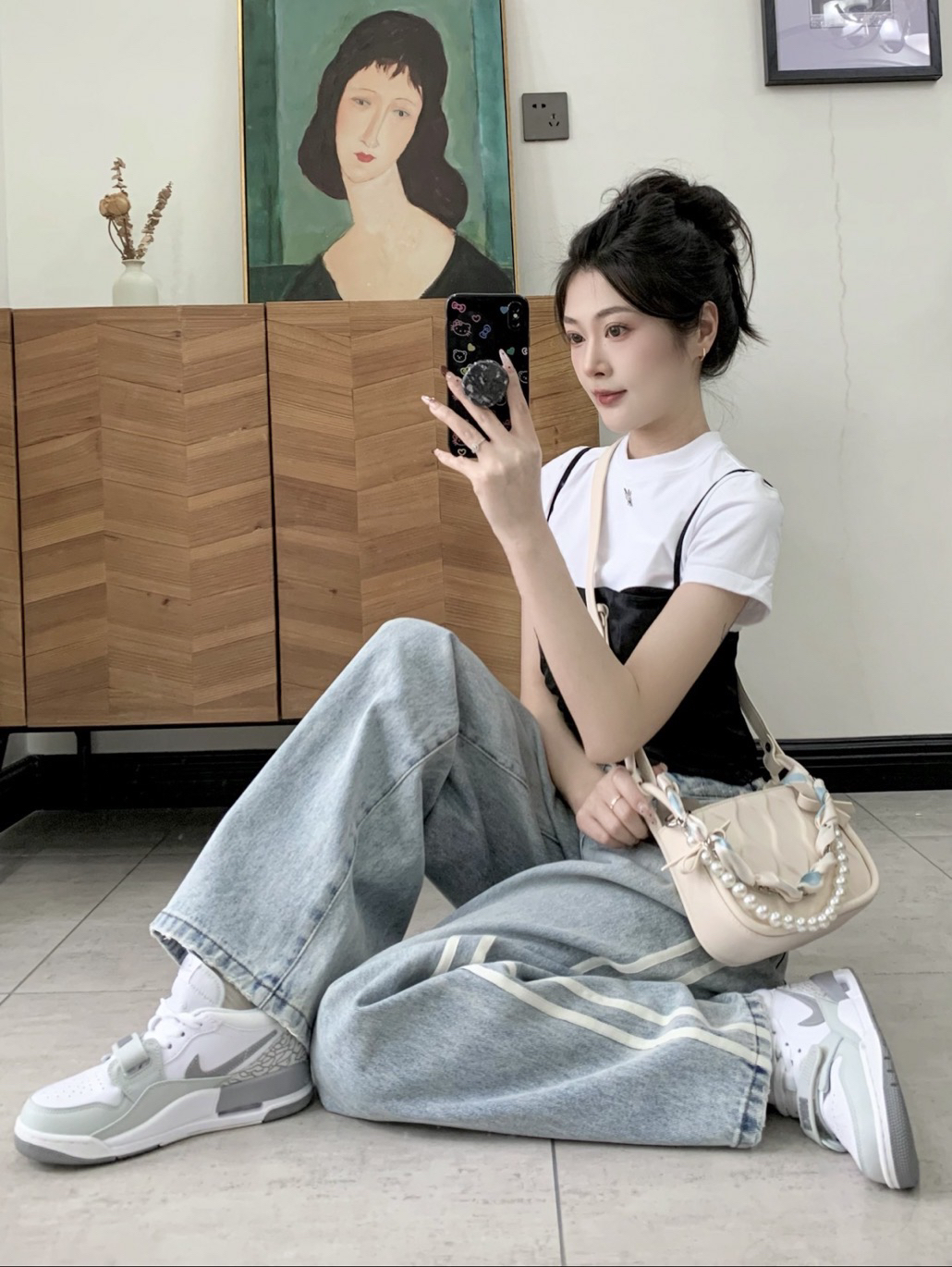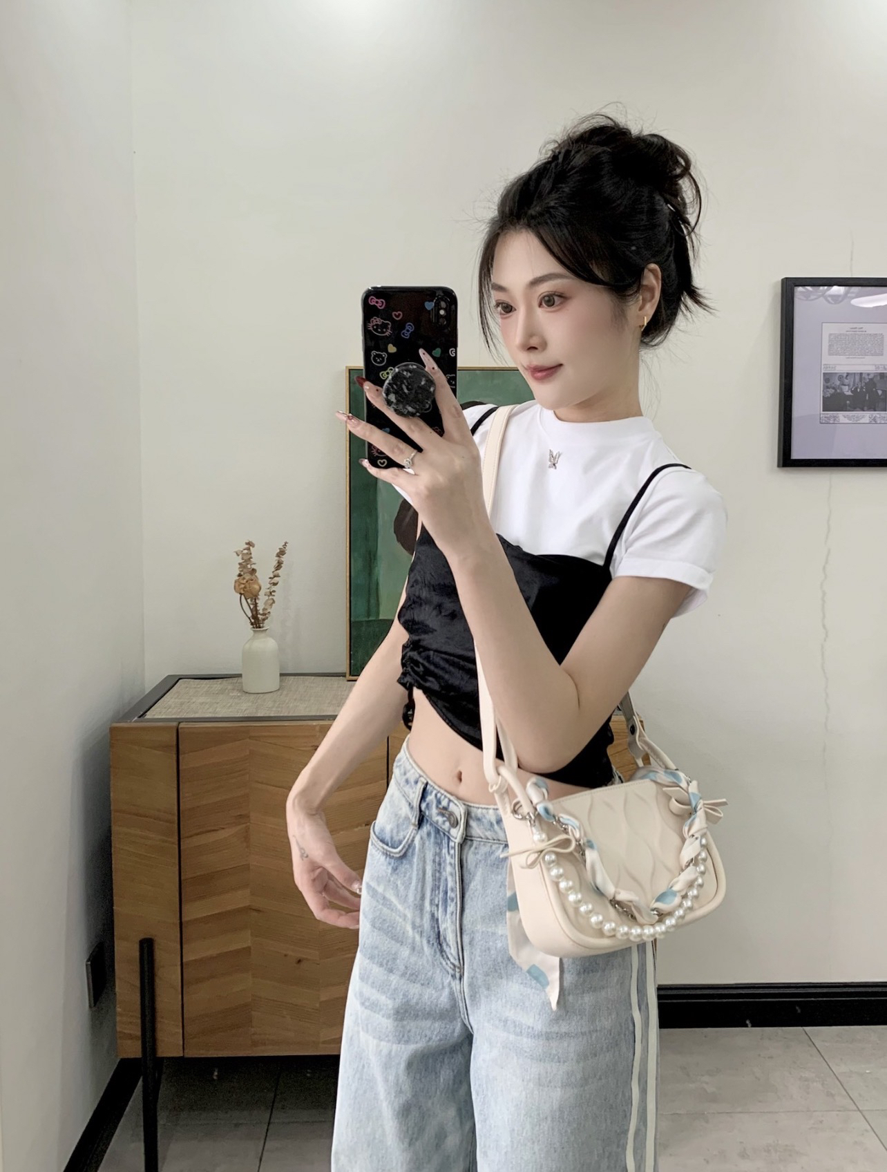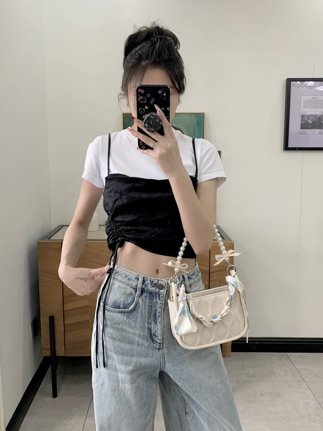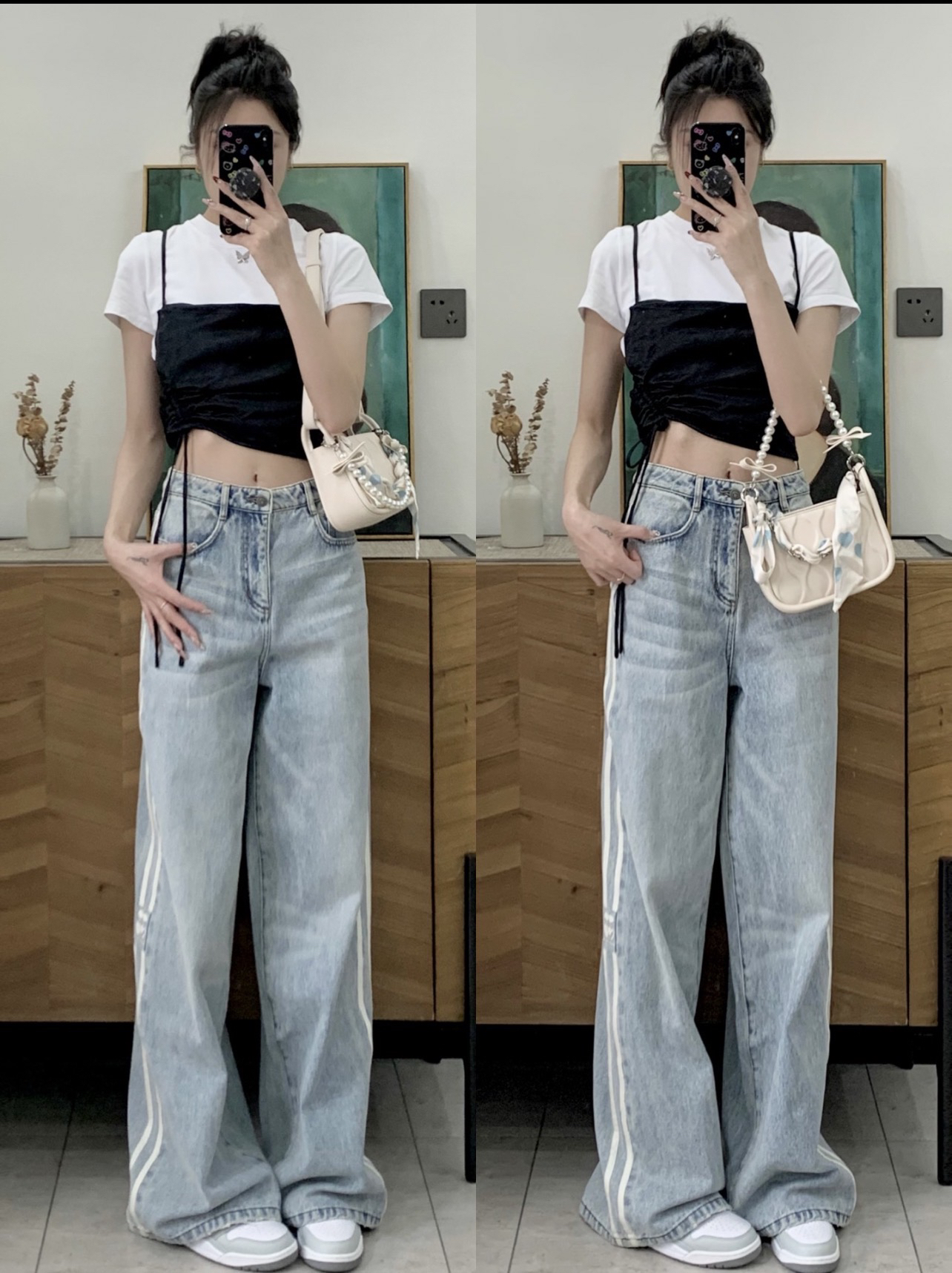 今日份穿搭来啦~今天都是基础色系地素的这一套简约又时髦 两件套的短袖T不费力的精致黑白搭配不出错 也可以单穿白t短款的话下面搭配宽松的裤子最好啦浅蓝色系的牛仔裤春夏搭配好清爽 裤长高个子也完全ok中腰的设计会hin显瘦哦164/88 m搭aj312低帮灰白 背TOUTOU的腋下包夏天喜欢背小包喜欢链条的多样化手提单肩斜挎都可以 还配有丝巾可以穿在链条上也可以diy在穿搭上米白色好搭配