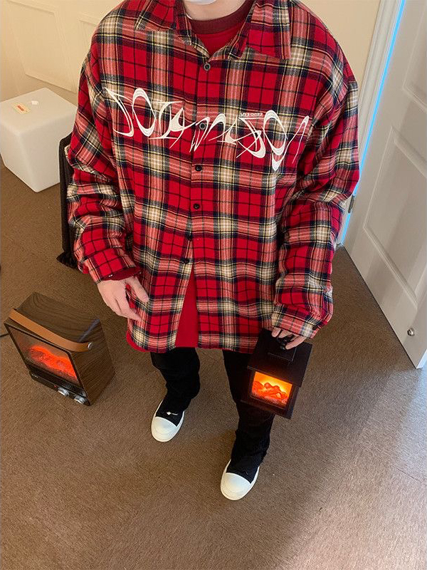 👔美式复古刺绣红色格子衬衫 👖黑色修身微喇vibe风牛仔裤 👟百搭帆布板鞋 美式街头风一整个拿捏住了🤏