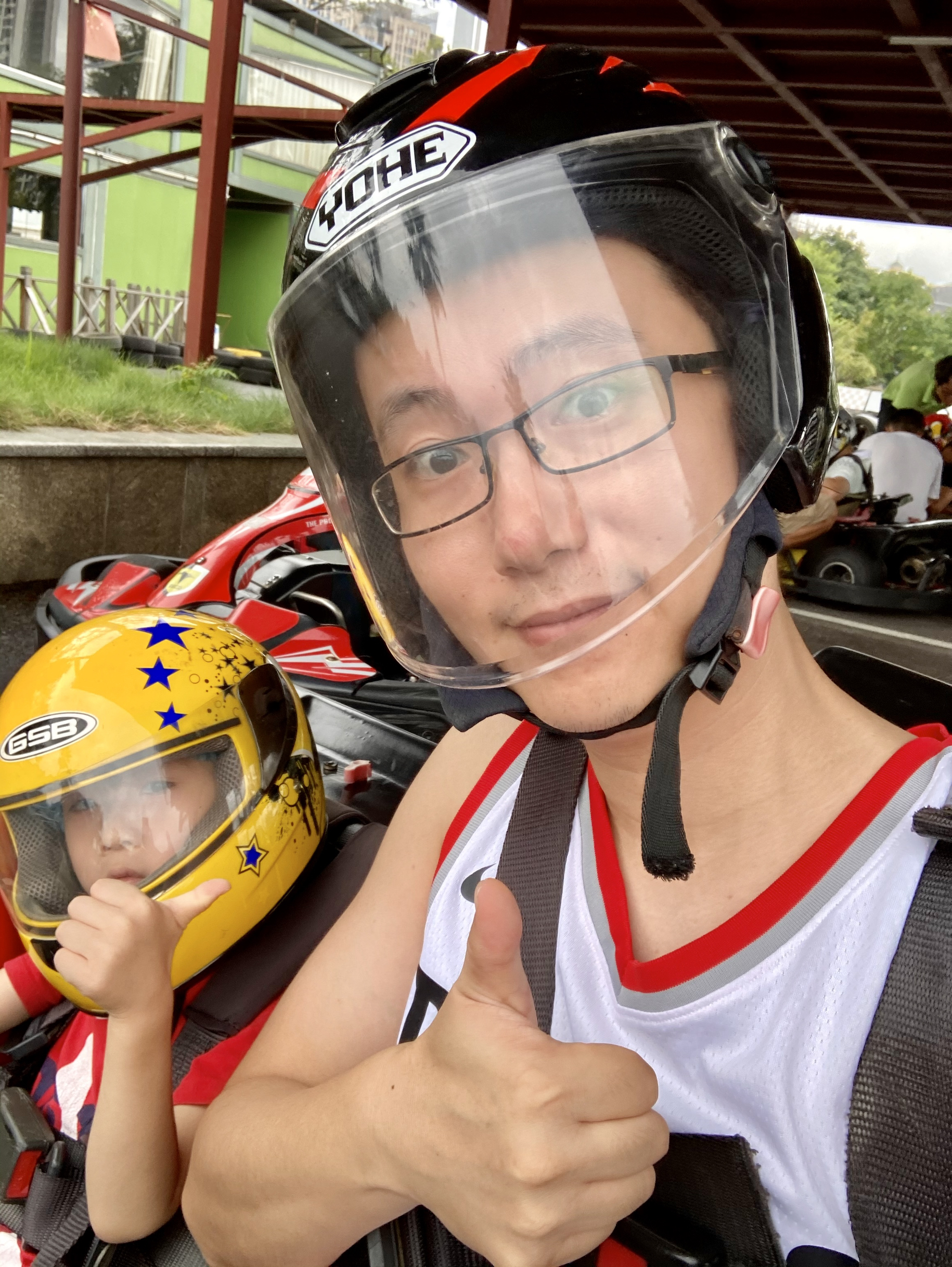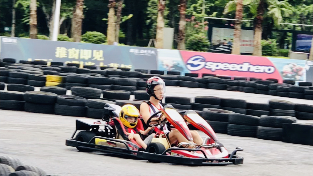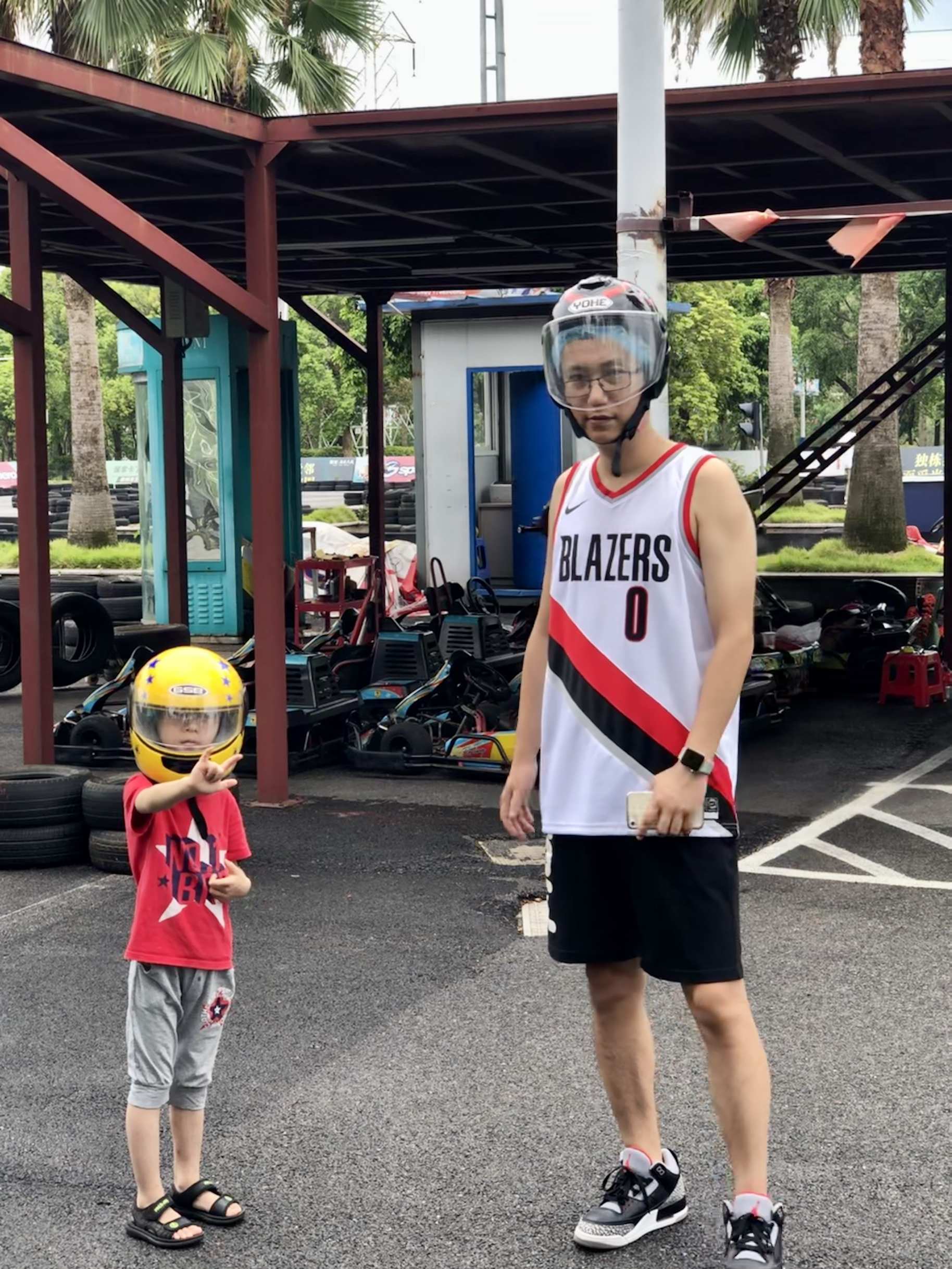 王老师身着“表哥”利指导的经典开拓者主场白红球衣,搭配aj3黑水泥,带崽去玩卡丁车真是不亦乐乎~🏎️🎽👟🎈