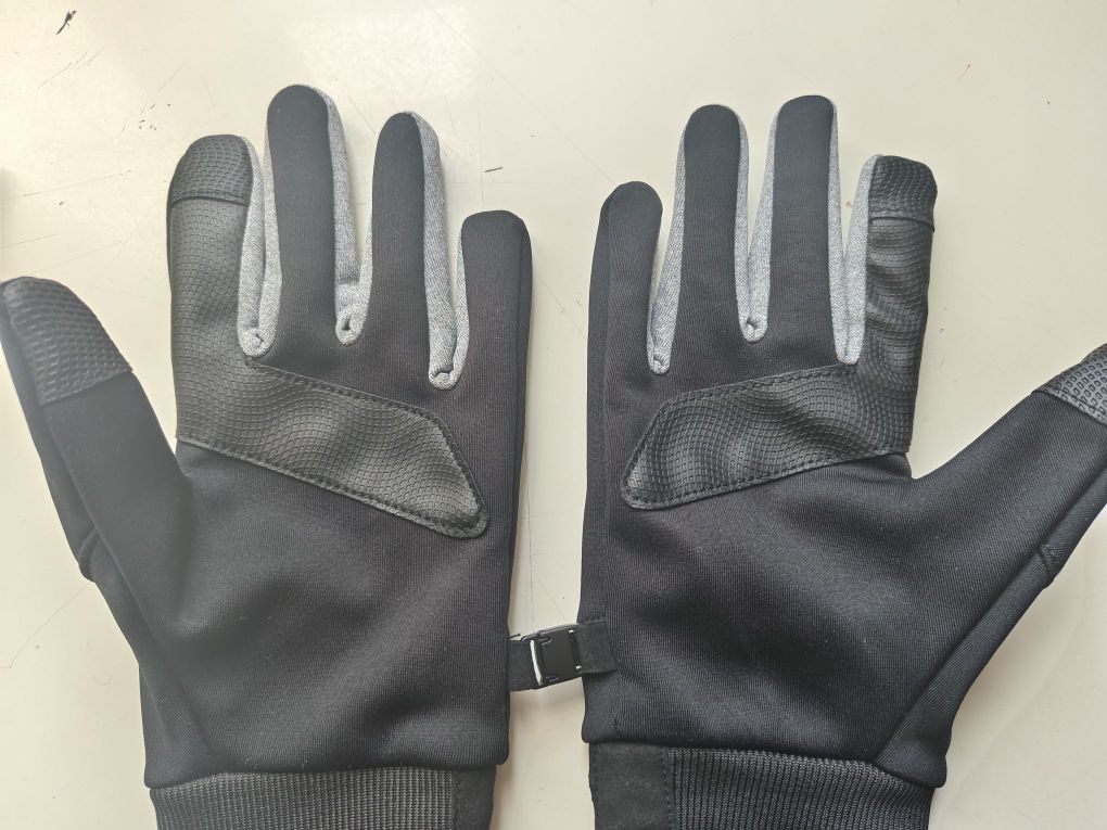 多面拼接手套口为螺纹松紧更加贴合手臂防风御寒,内部加绒防风十分保暖。两个手套下方都加了可以挂的地方手掌侧边还有卡扣,扣在一块收纳起来也十分方便。左右手的手掌上方和大拇指食指做了加厚的皮面,使得大拇指和食指可以触控手机屏幕。手套整体带上去非常紧实手背还有夜光logo标识