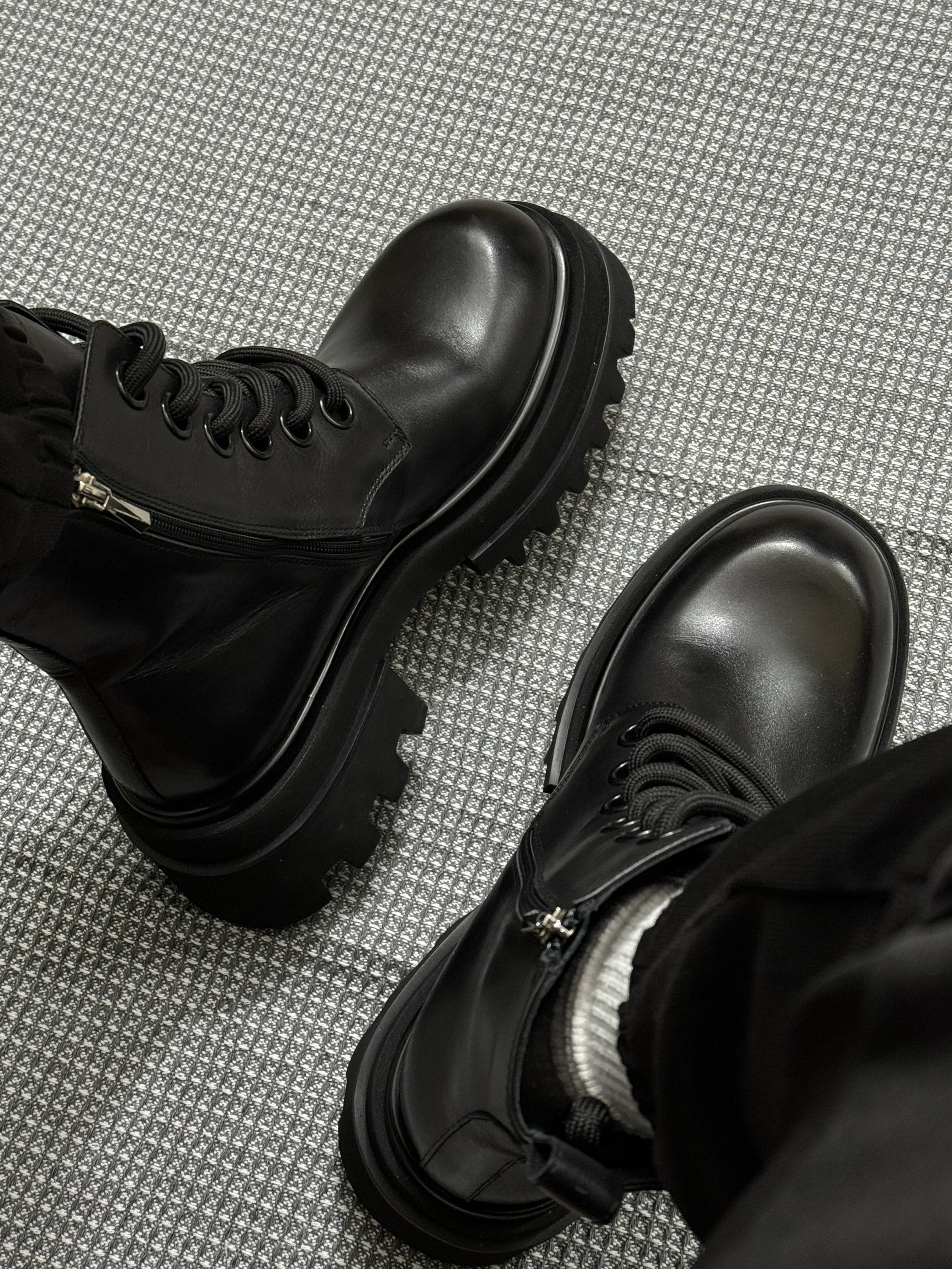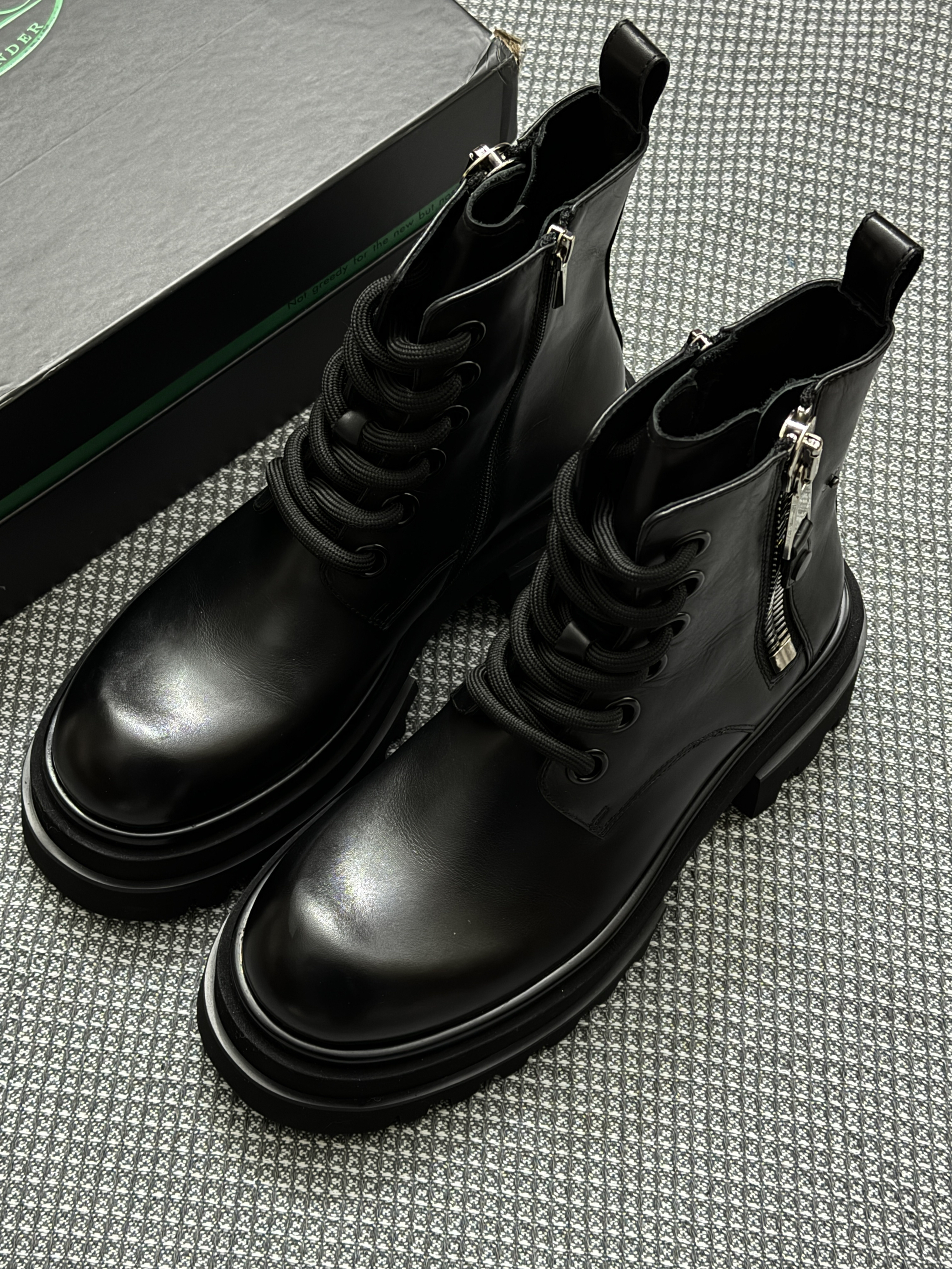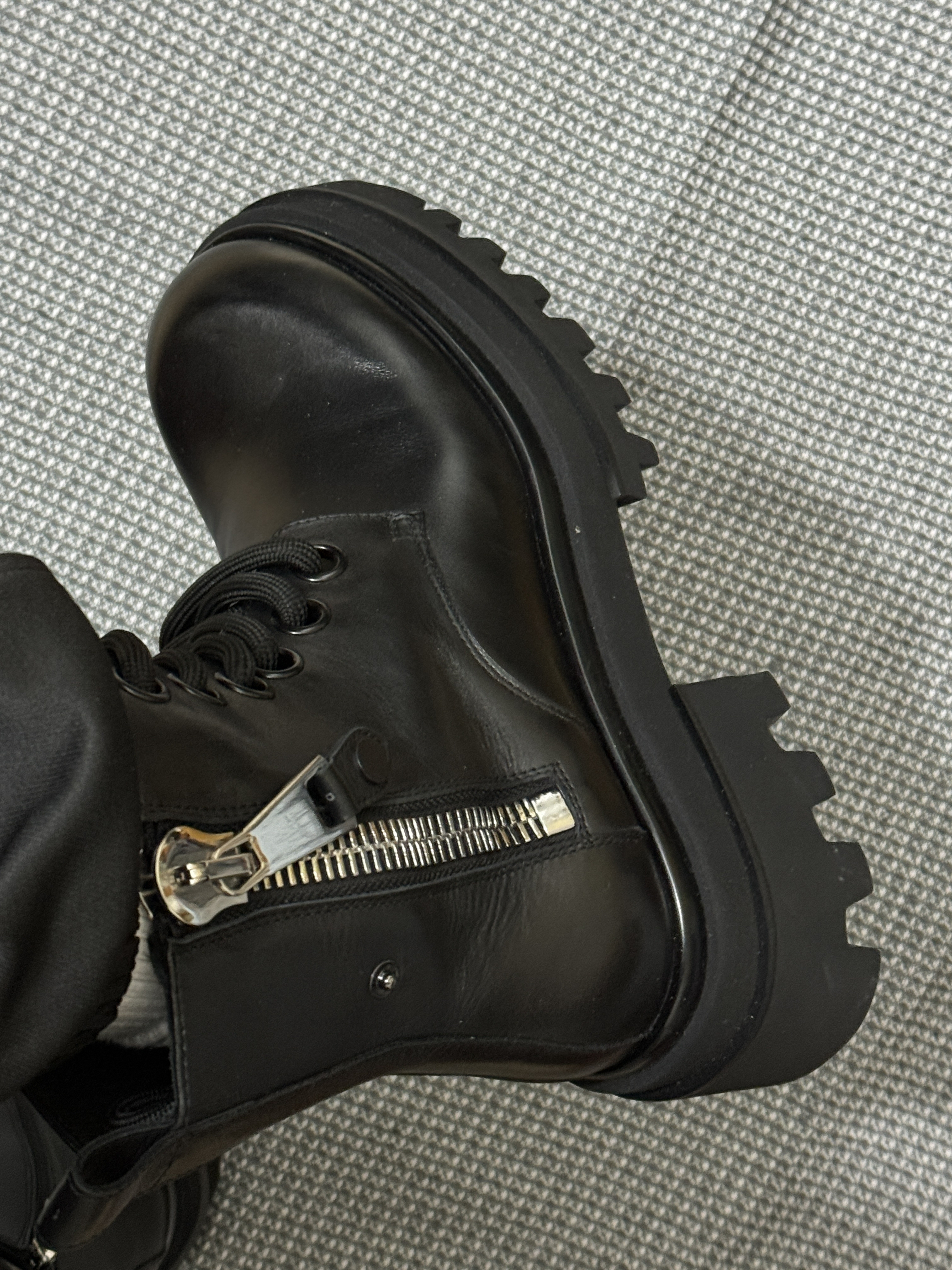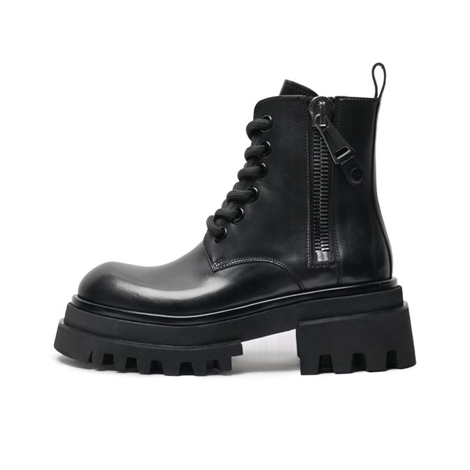 马丁靴还得是黑面更有感觉 又雅素又百搭 裤子搭黑灰牛仔裤效果很不错 鞋面的皮质用料很到位 整体的舒适性可以 另外不得不说双面拉链太方便了 穿脱不费力,这点对我真的很重要 (码数不偏的