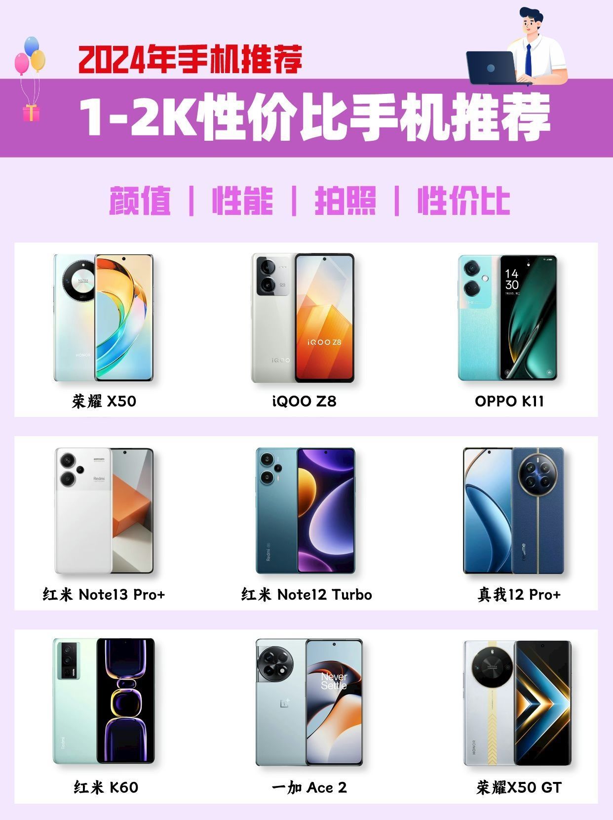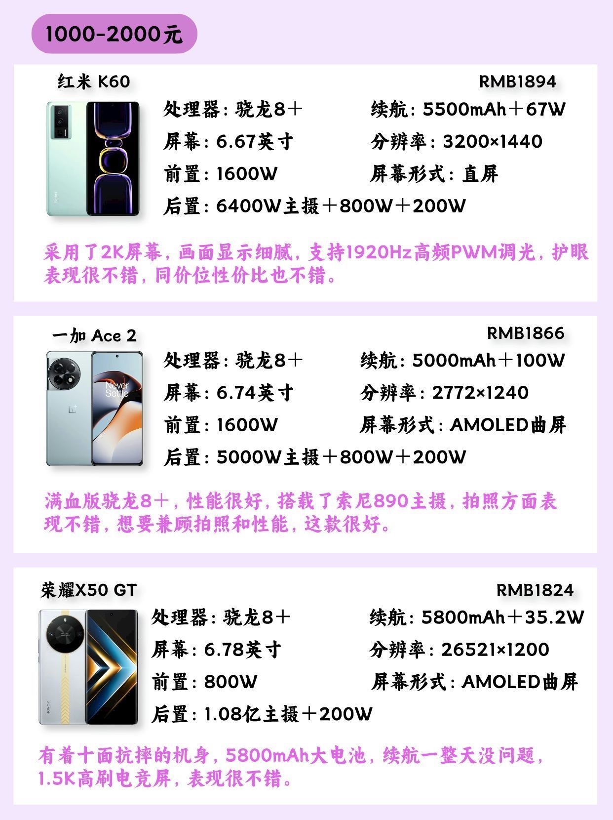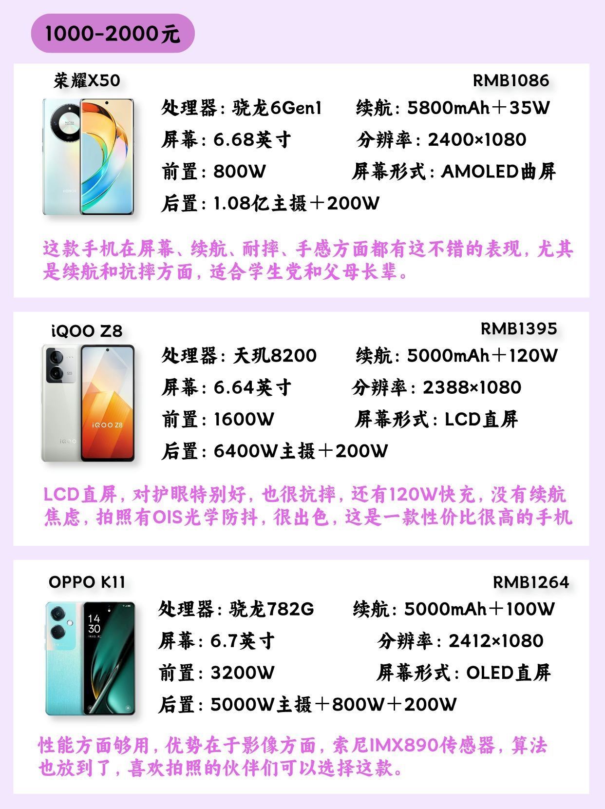 🎉Hello宝子们~本期给大家带来一篇千元机的笔记推 荐,谁说千元机不能追求性价比、拍照、性能、颜值,我偏要,总共有9款手机供大家参考。 - 🔥荣耀 X50 这款手机在屏幕、续航、耐摔、手感方面都有这不错的表现,尤其是续航和抗摔方面,适合学生党和父母长辈。 - 🔥iQOO Z8 LCD直屏,对护眼特别好,也很抗摔,还有120W快充,没有续航焦虑,拍照有OIS光学防抖,很出色,这是一款性价比很高的...