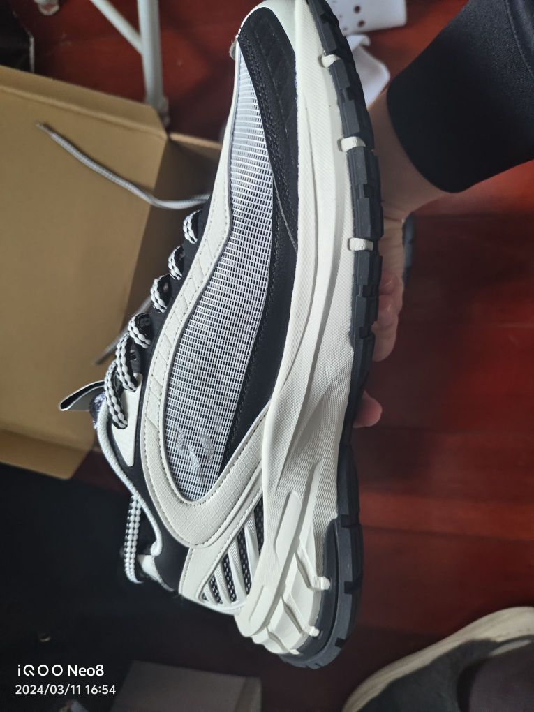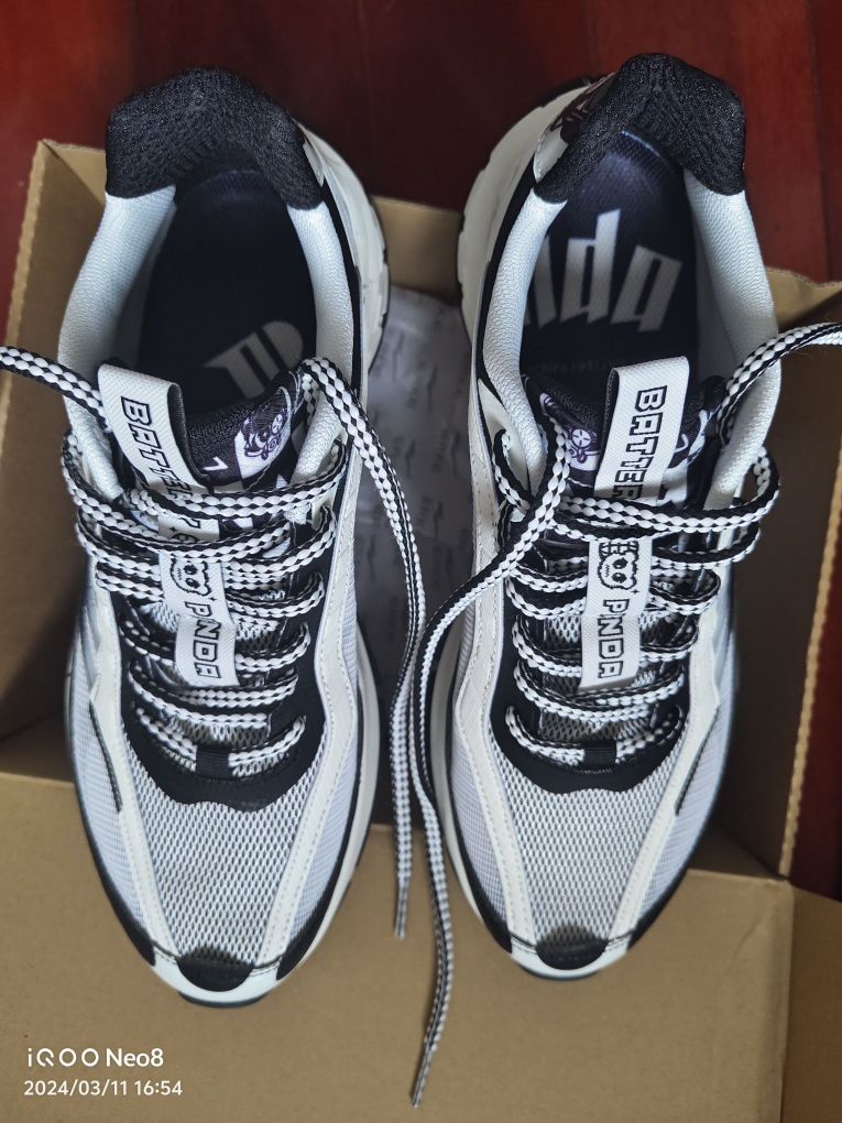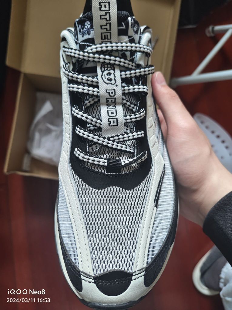 鞋子整体是以黑白搭配为主,设定是尔克的电池熊猫IP系列。 比起普通款它的设计和用料都多有不同 1:鞋带的外观形状和材料(黑白扁平富有编织感) 2:在鞋舌后跟和鞋垫处丰富了熊猫的元素,还有鞋尖那块黑色的半圆形其实是向上翘起的从鞋的正面看起就像是一只熊猫🐼 3:鞋面和侧身的网眼采用了轻薄网面比起普通款要更加透气,缺点可能就是比起普通款的鞋面缺少了一些质感和分量 4:鞋身的线条设计用黑白进行主题营造,鞋...