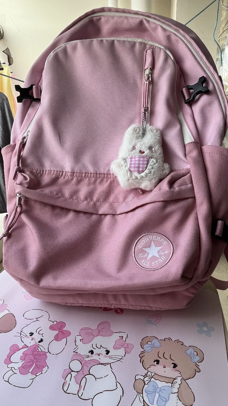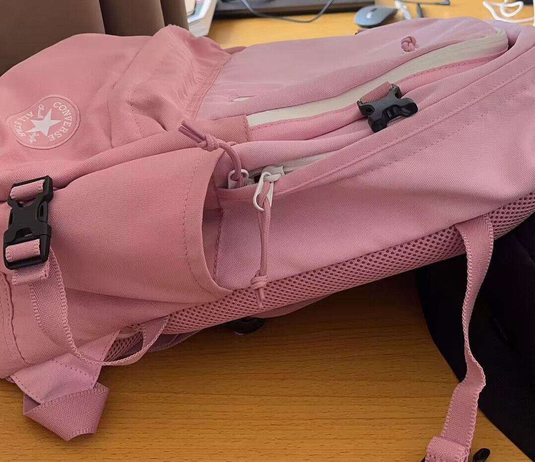 🎒单品介绍(品牌|款式):匡威书包 💰价格参考:180 🛒尺寸容量:容量特别大 我16.7寸的电脑放进去都绰绰有余 🔍设计细节:粉色超级好看 手机拍不出的好看啊啊啊 🧍♂️ 搭配技巧(风格|场合):上课 日常