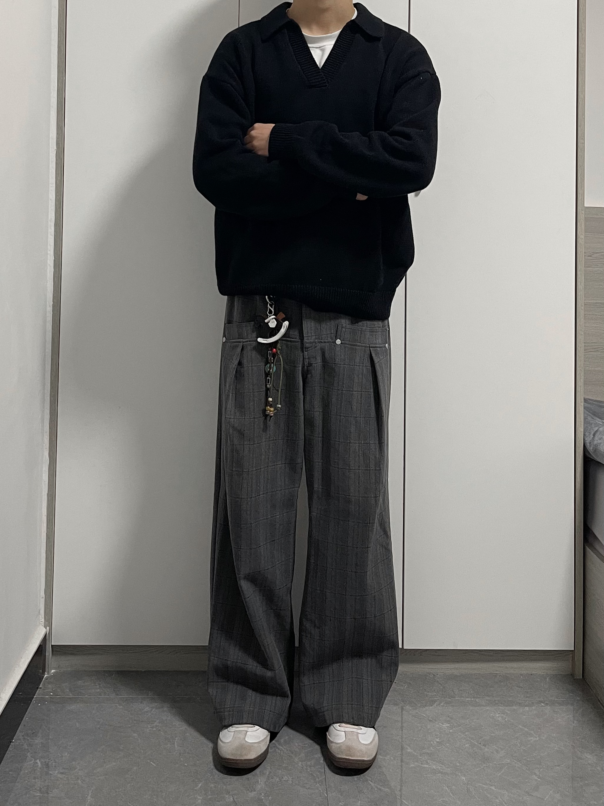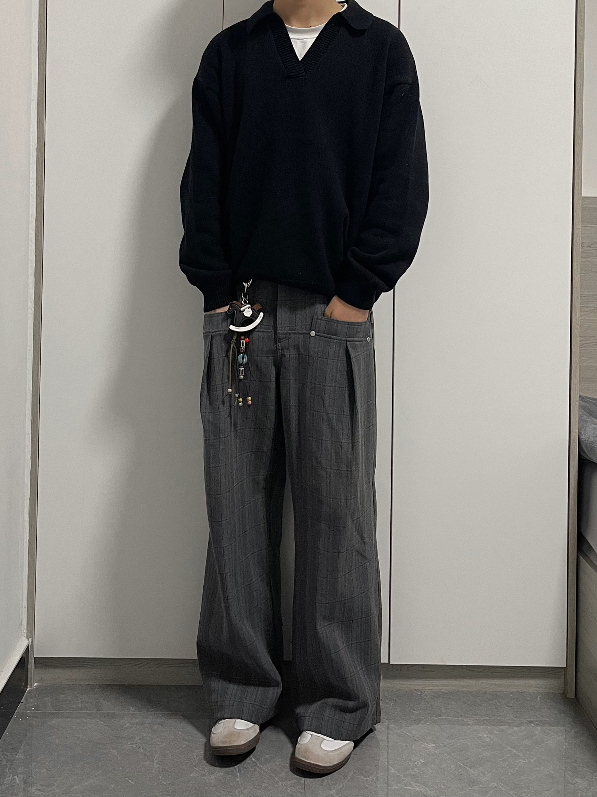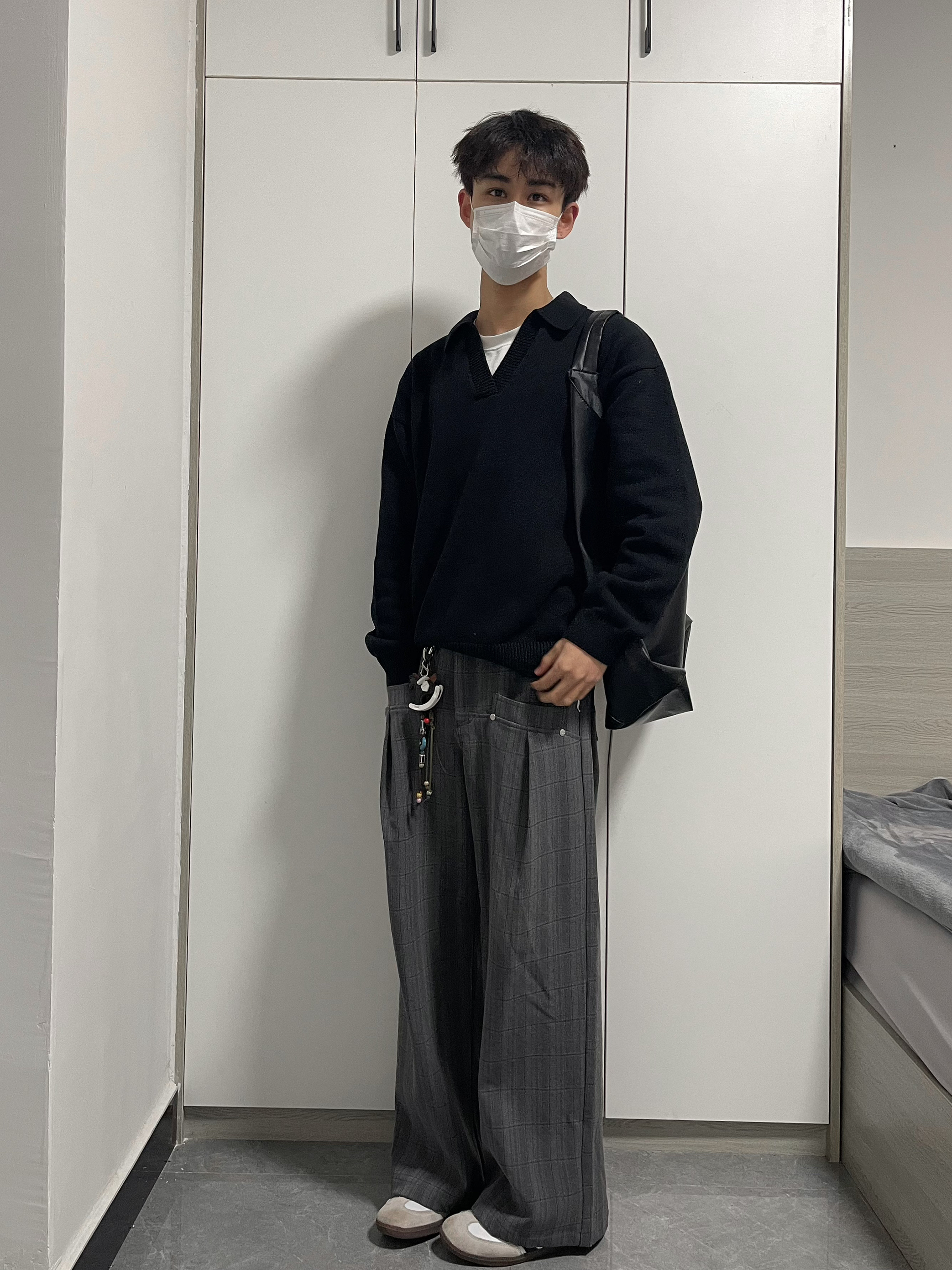今天上身遇见v领POLO衫,干净利落的版型和软糯的质感在早春很适合搭配,下身搭配一条西裤,鞋子选择的是一双smaba。