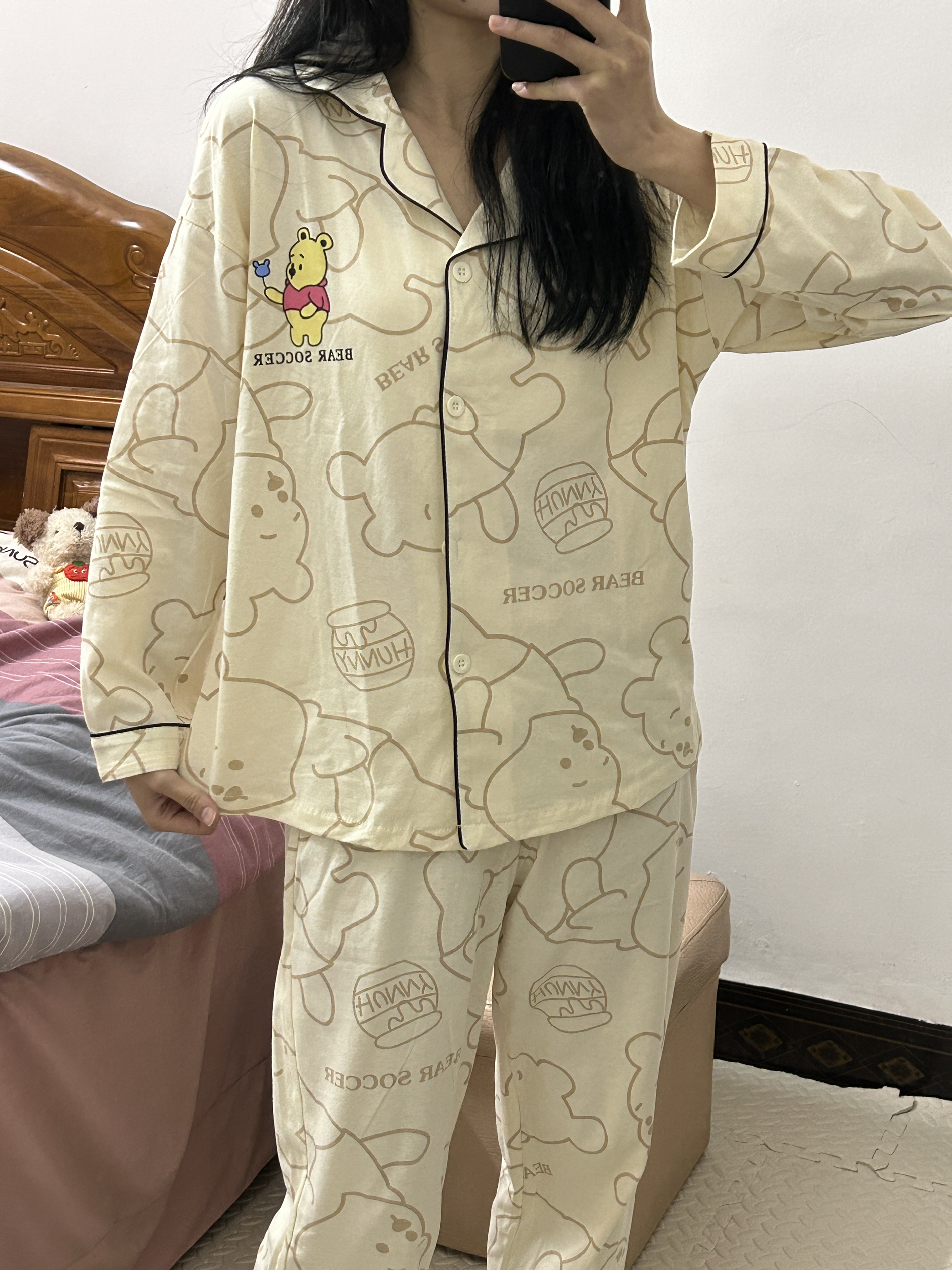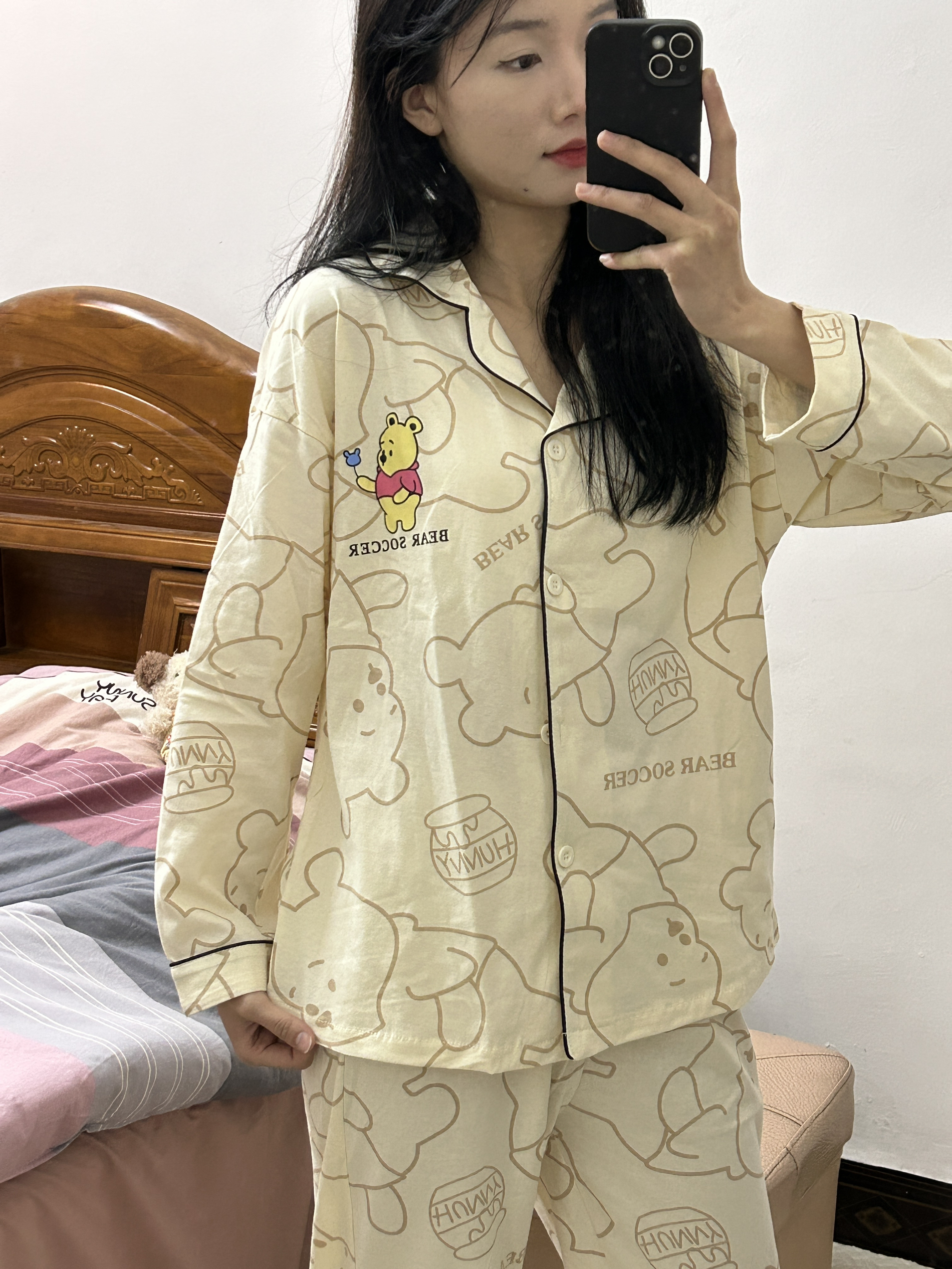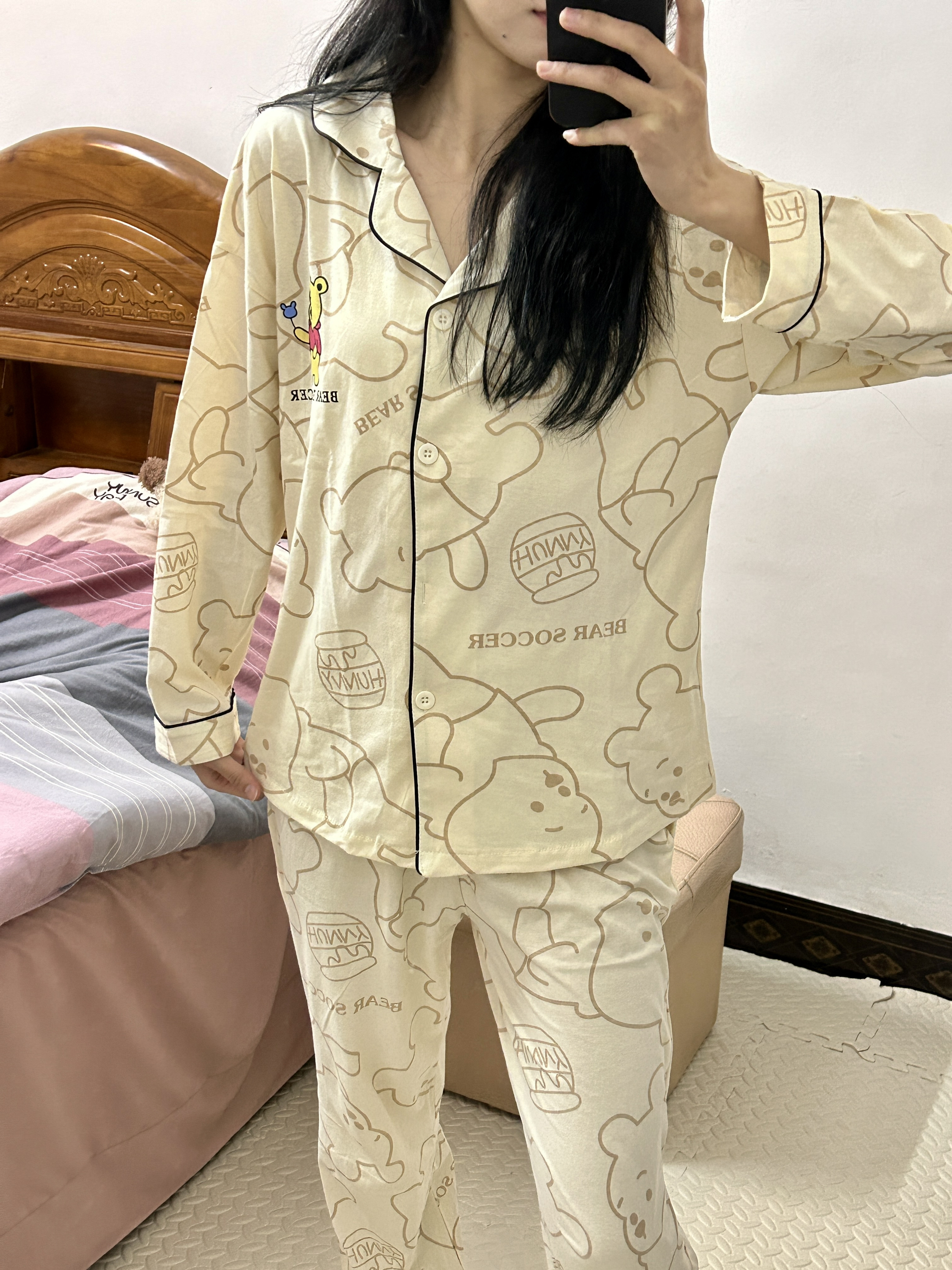 OOTD 160/42 姐妹们分享我的春天可爱睡衣 🐻 是迪士尼维尼小熊睡衣可可爱爱 🥰我入手的是m码 纯棉面料很舒服 小熊印花扣子设计