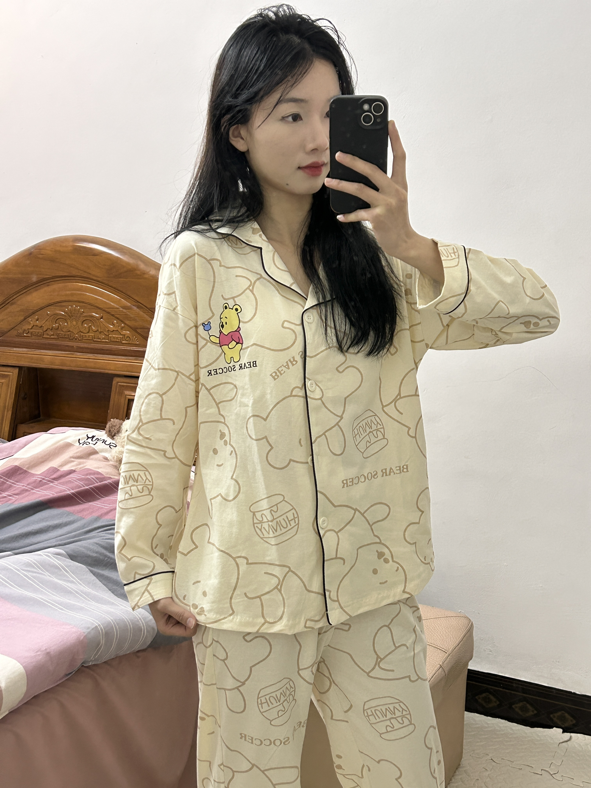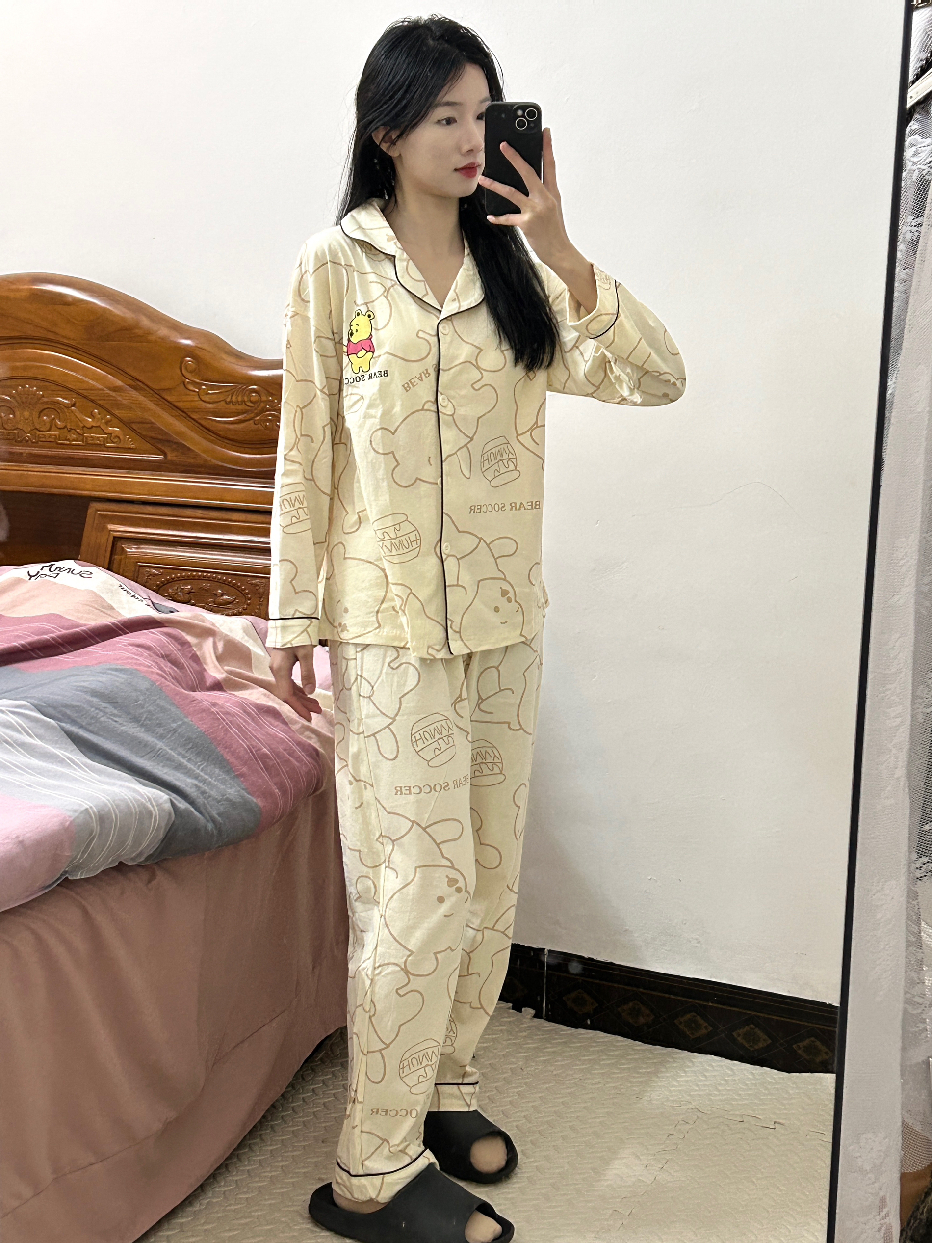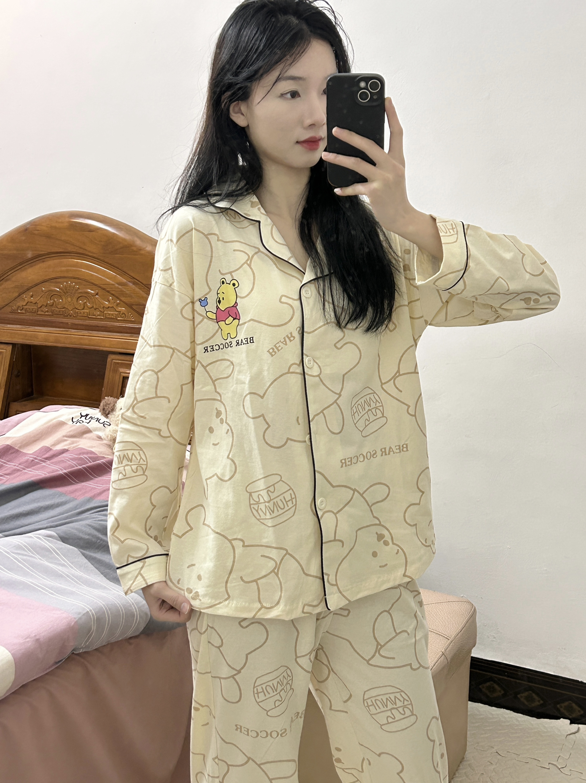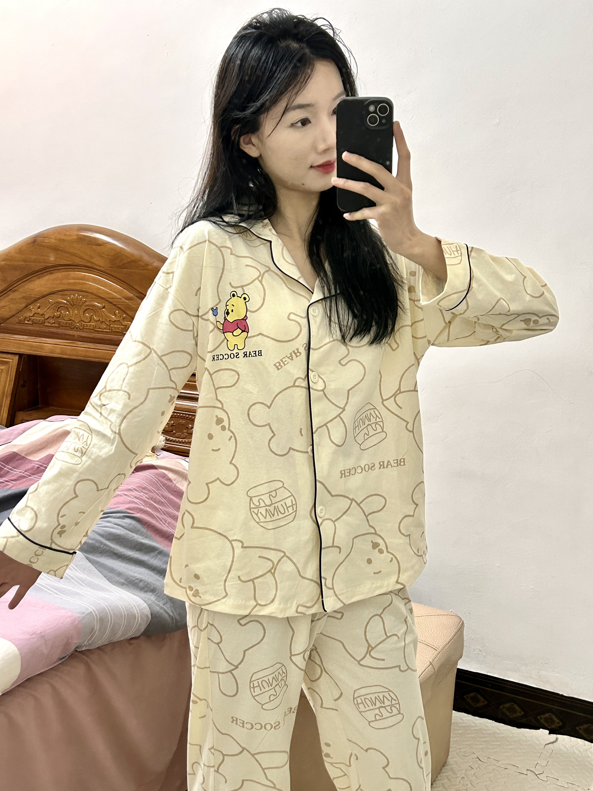 OOTD 160/42 姐妹们分享我的春天可爱睡衣 🐻 是迪士尼维尼小熊睡衣可可爱爱 🥰我入手的是m码 纯棉面料很舒服 小熊印花扣子设计