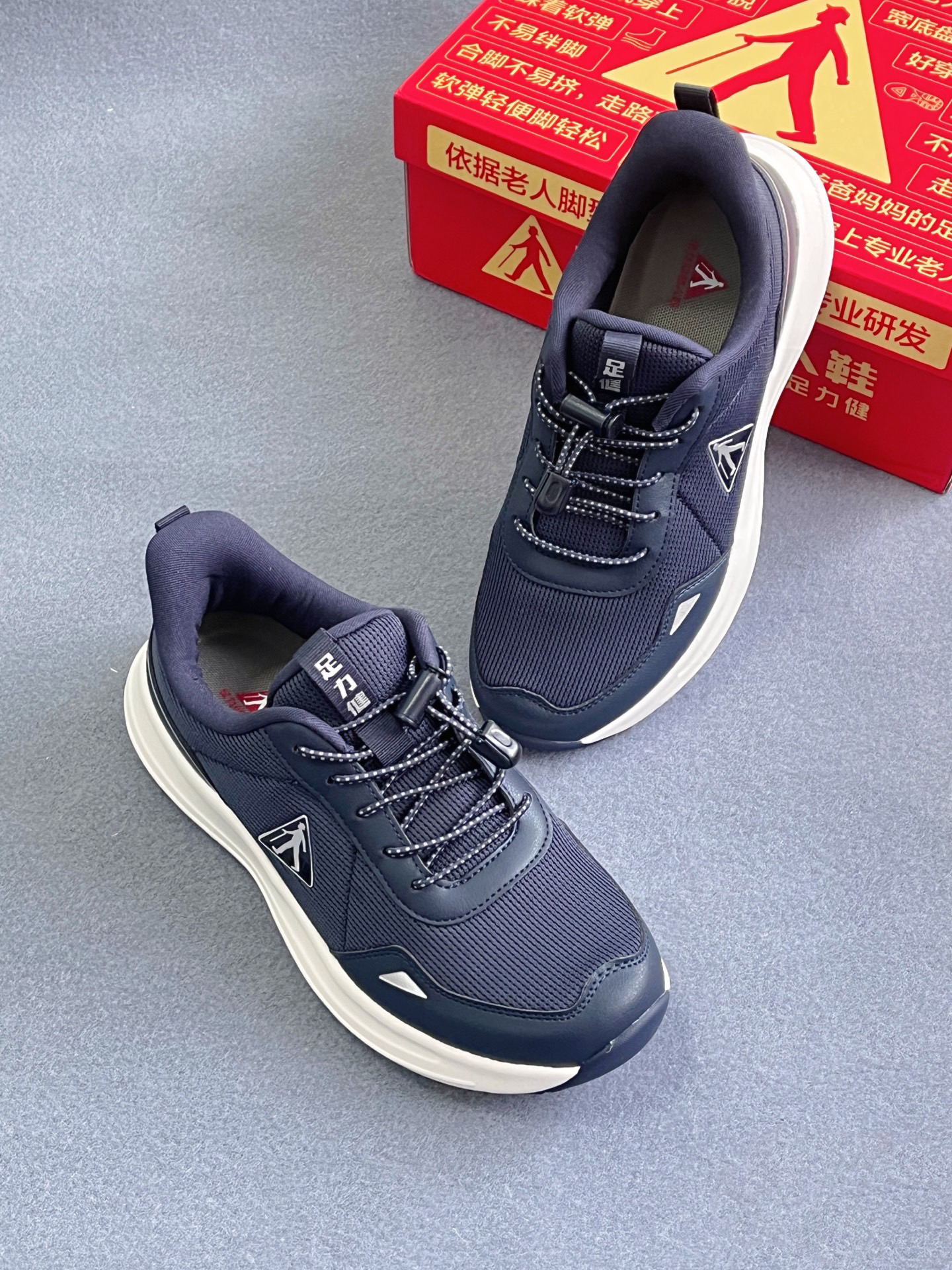 👟足力健 老人生活休闲鞋蓝藏蓝的配色 稳重大方很适合长辈们! 关键还耐脏!皮质鞋面好打理! 鞋头加宽的设计给脚趾保留了空间 不会出现挤脚硌脚的情况~ 发泡的中底脚感轻盈软弹!走路不会累~免系鞋带的设计很人性化~不用弯腰就可以穿脱~鞋底做了橡胶的抓地耐磨不错的! 个人觉得尺码正常就可以不偏码