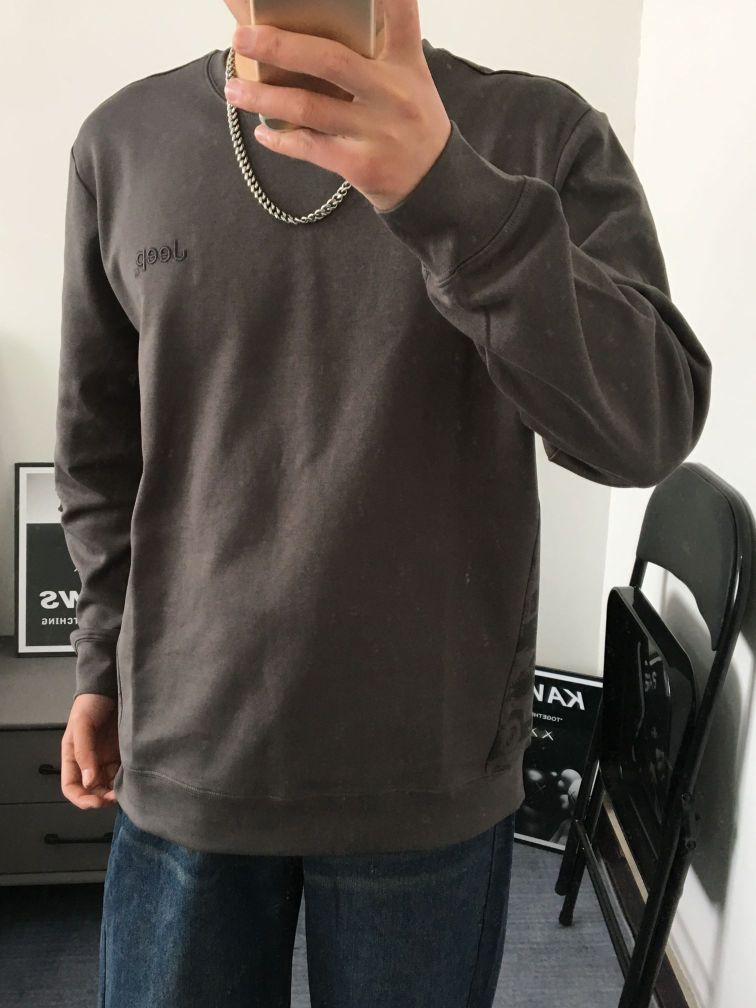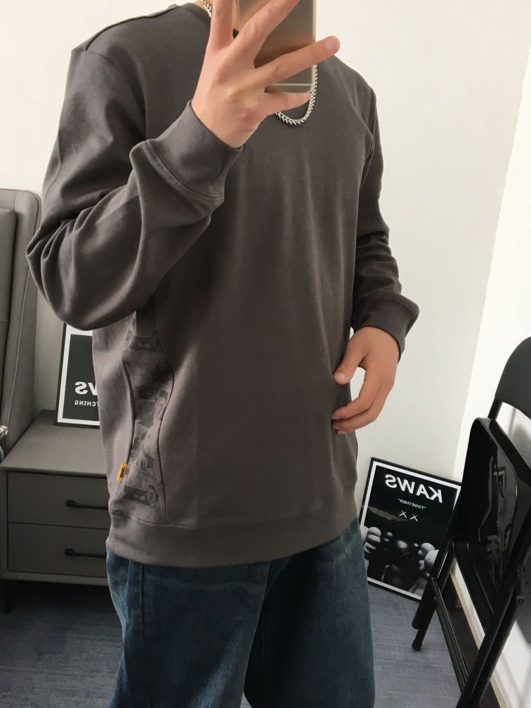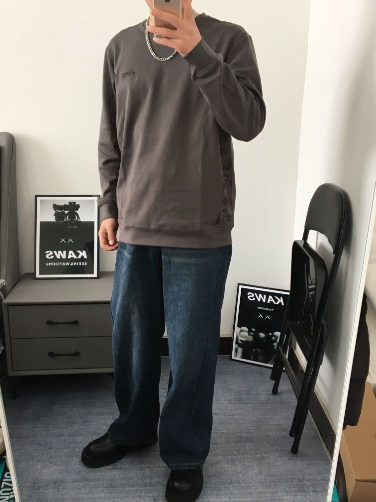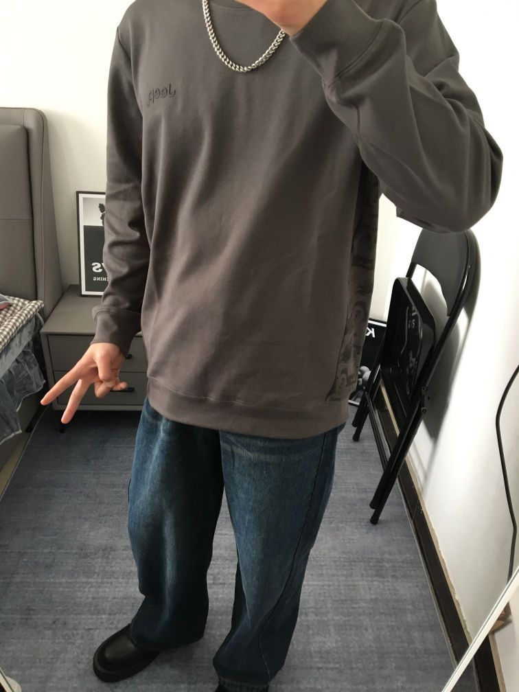 春天来了,又可以单穿卫衣啦! 卫衣是不易出错的单品 百搭又显高级感上身选择一件灰色圆领卫衣 裤子搭配一条蓝色系的牛仔裤 宽松的版型,修饰腿型显瘦好驾驭! 很喜欢这种深色系的穿搭 纯色基础款的设计卫衣两侧的印花图案与品牌相呼应,而且深色系还显瘦 上身嘎嘎帅!