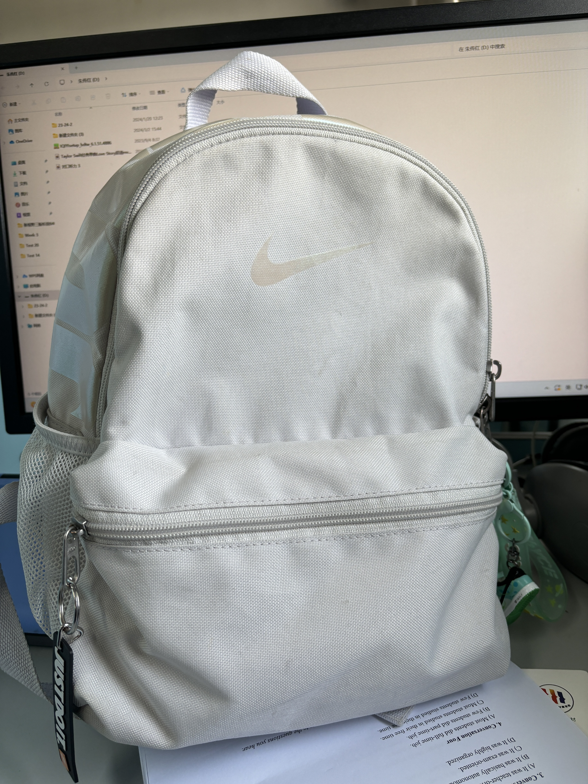 此款nike包包好比较适合女生背,我一般拿来装书上课,日常旅游也可以背,内部容量很大,装满的话(毛概来说)可以装十本左右,大一点的书也可以装下,旅行的话也能装很多必需品。 建议: 这款白色的镭射包包不是很耐脏,如果有需要可以换个别的颜色哦。内部容量很大,可以背着上课。是不错的选择。