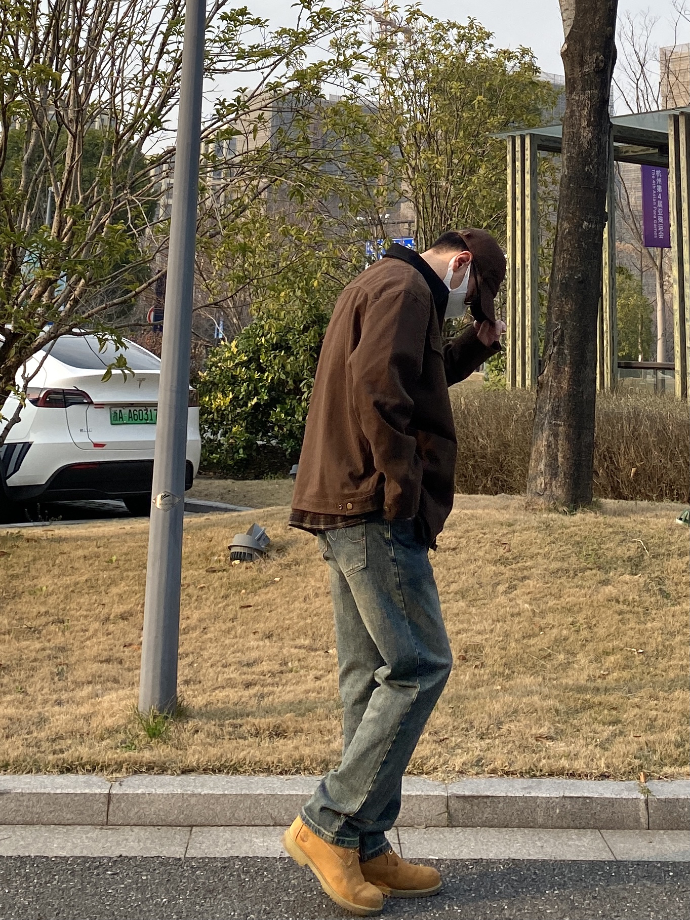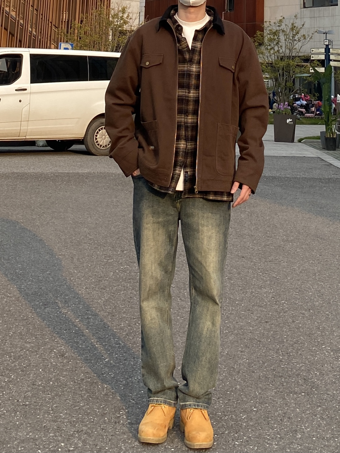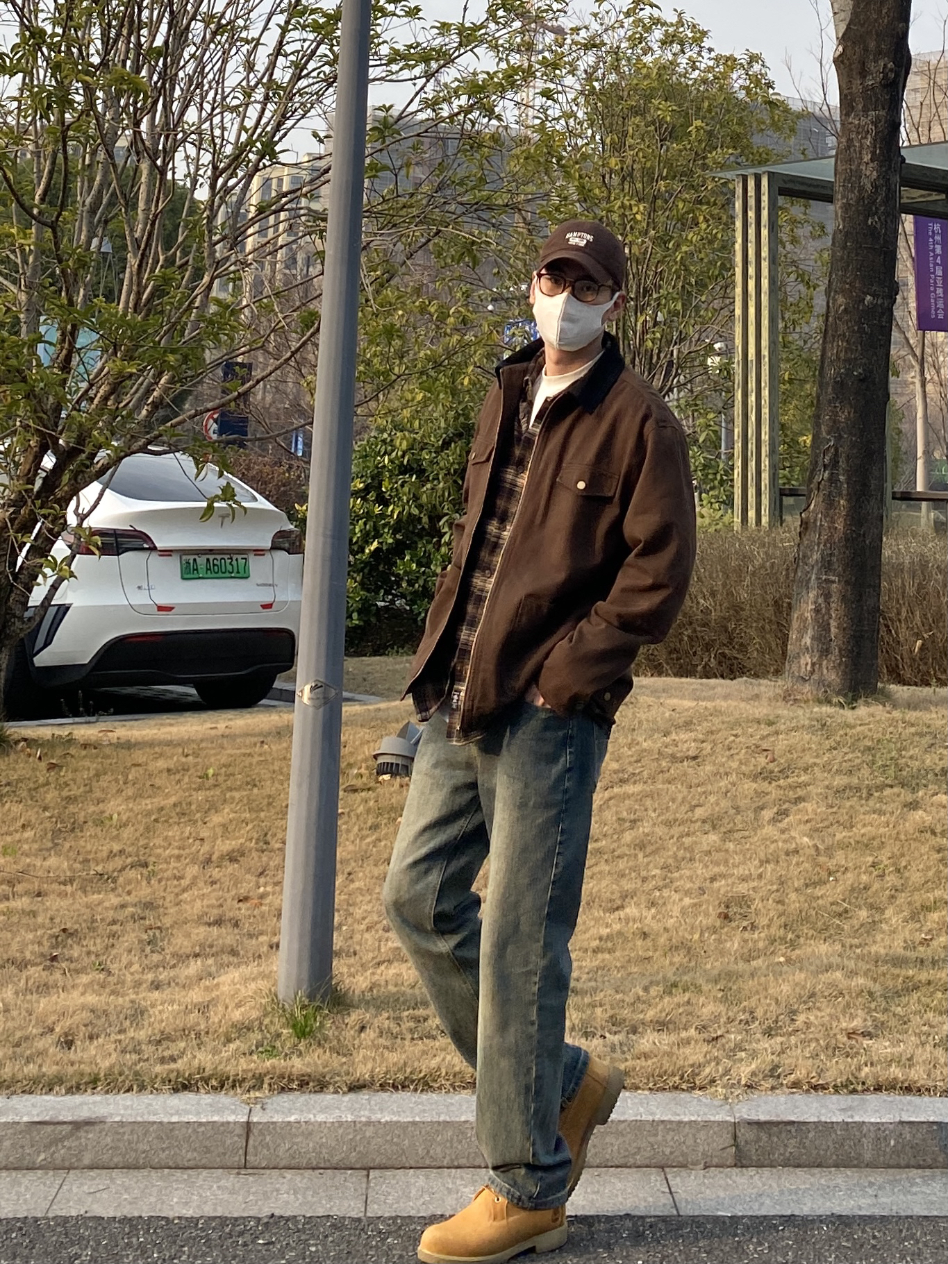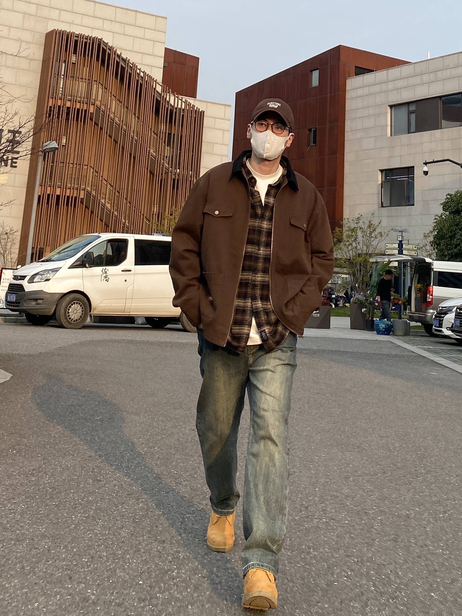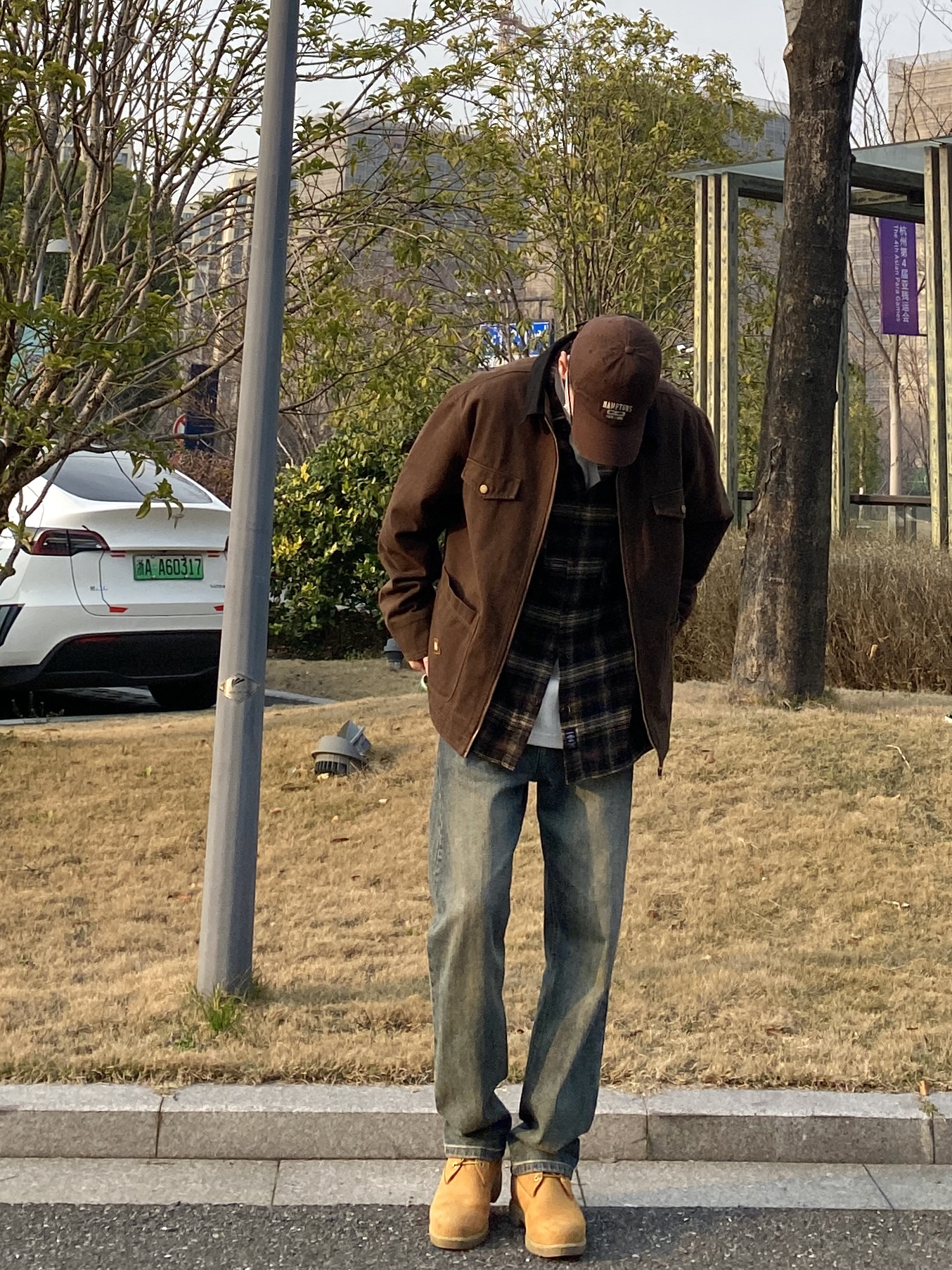 阿kong的春季穿搭分享 - 今天这套先用咖啡色磨毛格子衬衫做内搭 ⬇️ 裤子选择不挑腿型的水洗直筒牛仔裤 ⬇️ 鞋子上脚硬汉必备的timberland工装靴 ⬇️ 接着套上棕色宽松阔版复古多口袋猎装夹克 ⬇️ 最后戴一顶棒球帽呼应下衣服的颜色 - 今日穿搭 衣服裤子都来自:NICE LILI 鞋子:timberland
