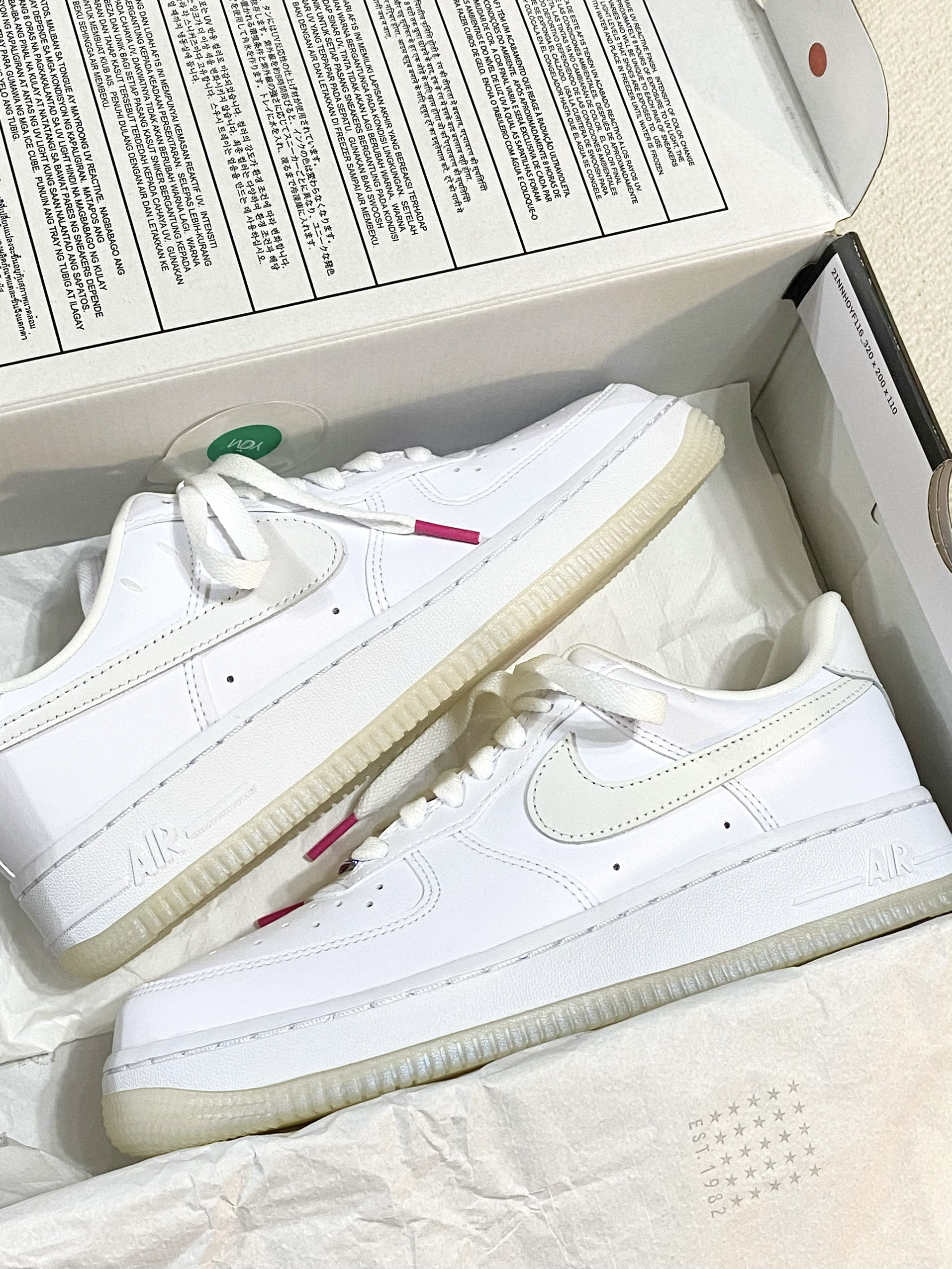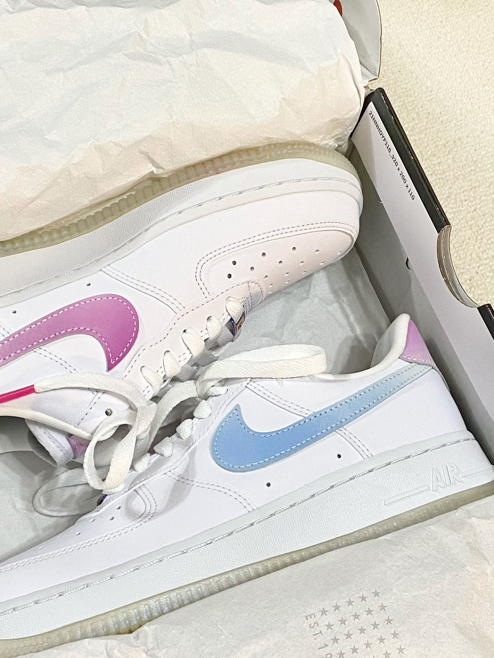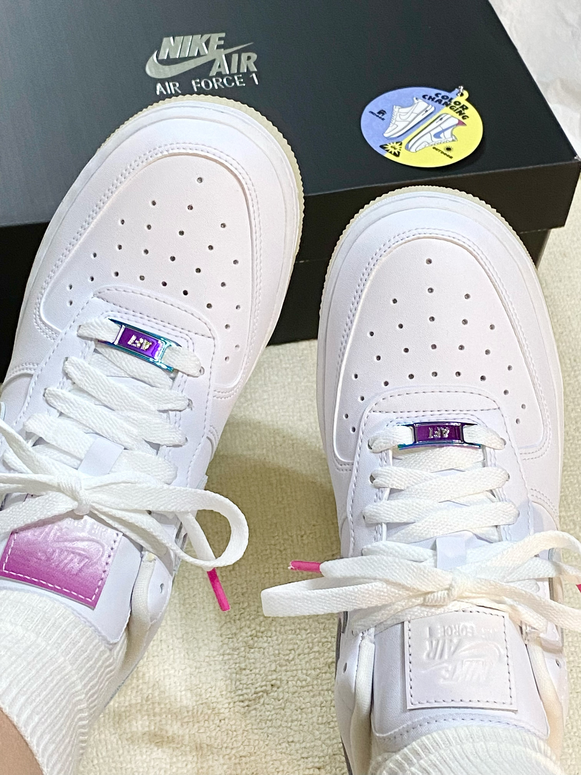 感觉好久都没有看到这种热感应的空军了 在室内你以为它只是一双纯白af1 但是一走出去!!燃起来了朋友👋🏻 我很喜欢它的鞋底 好有趣嘿嘿 它不变色也挺好看的 鞋带粉色点缀💖 变色后两个勾勾颜色不一样 酷诶🕶️ size可以正常选~变不变色都百搭 就是给人一种又低调又特别的感觉🥳