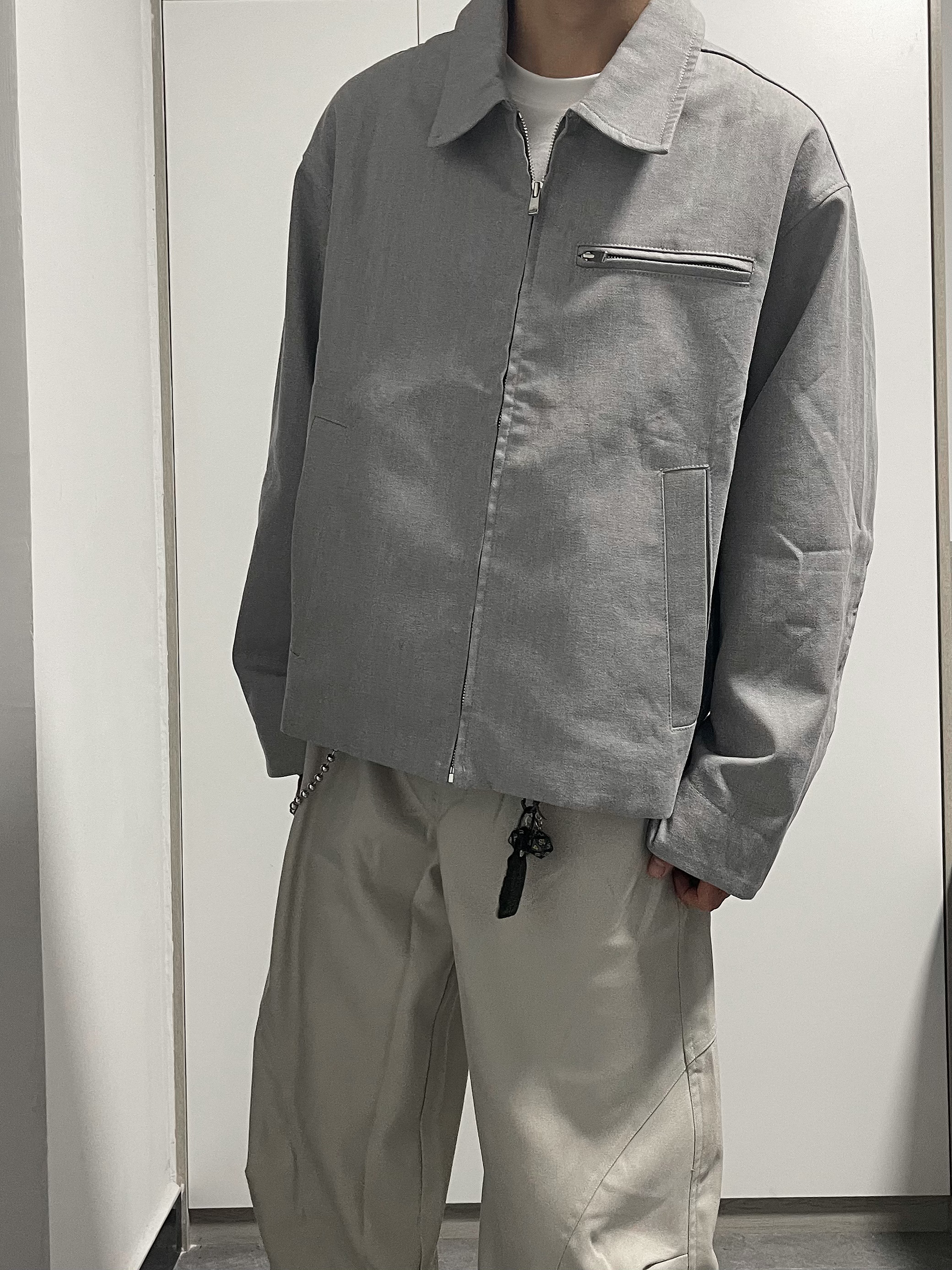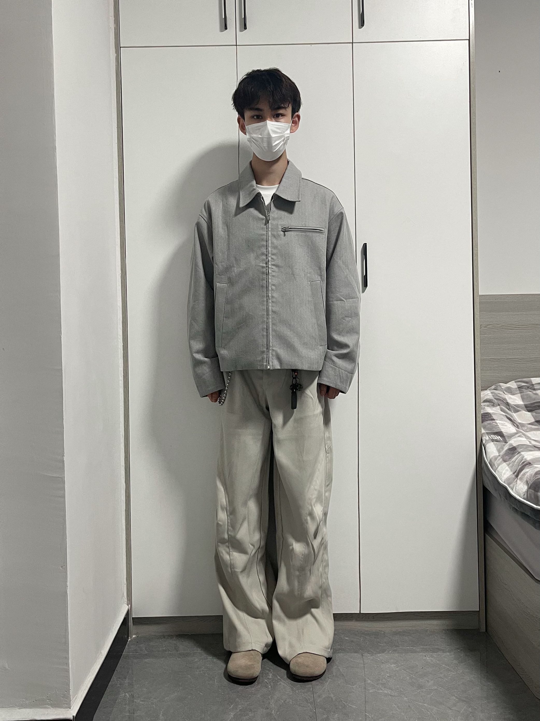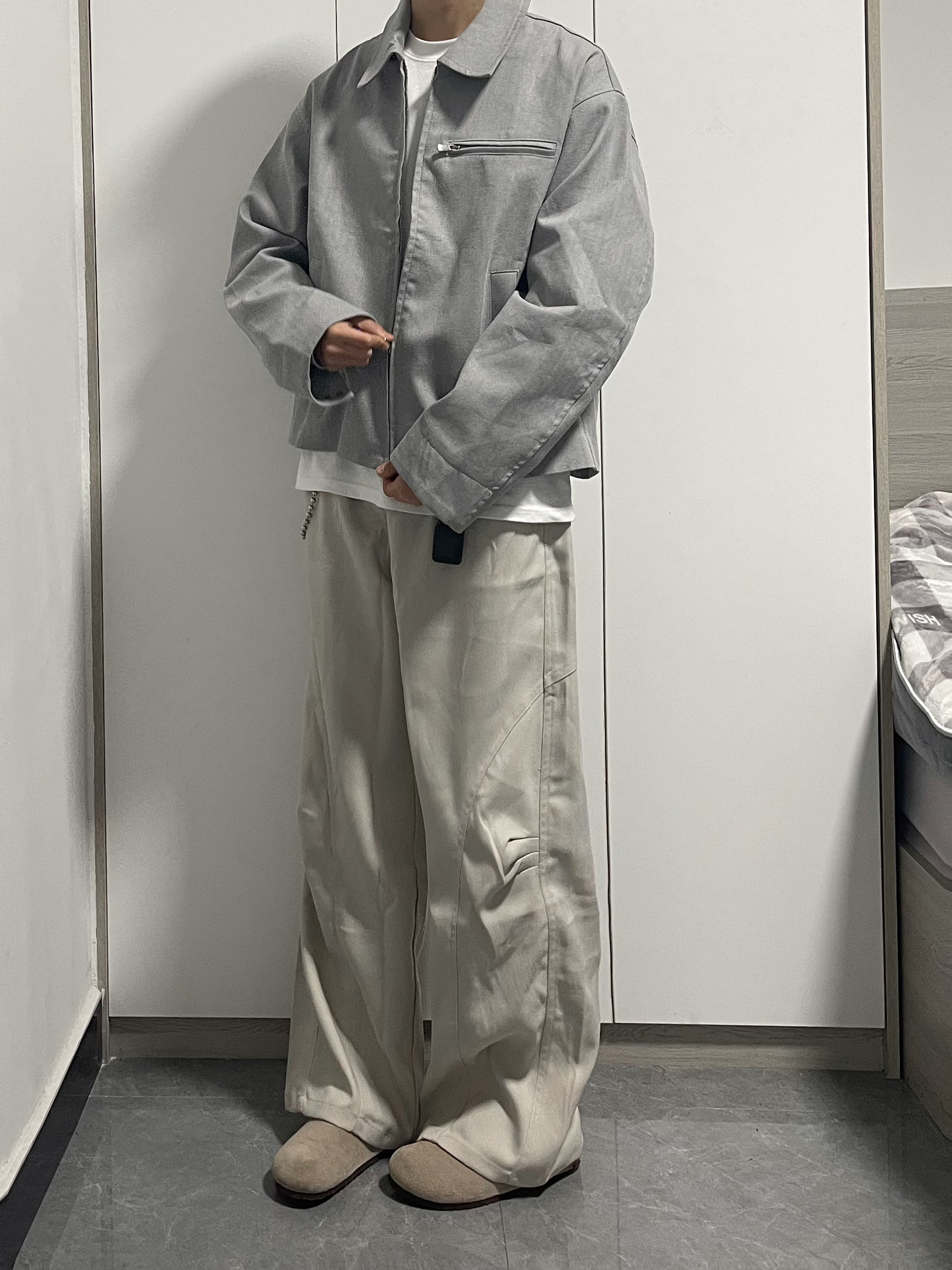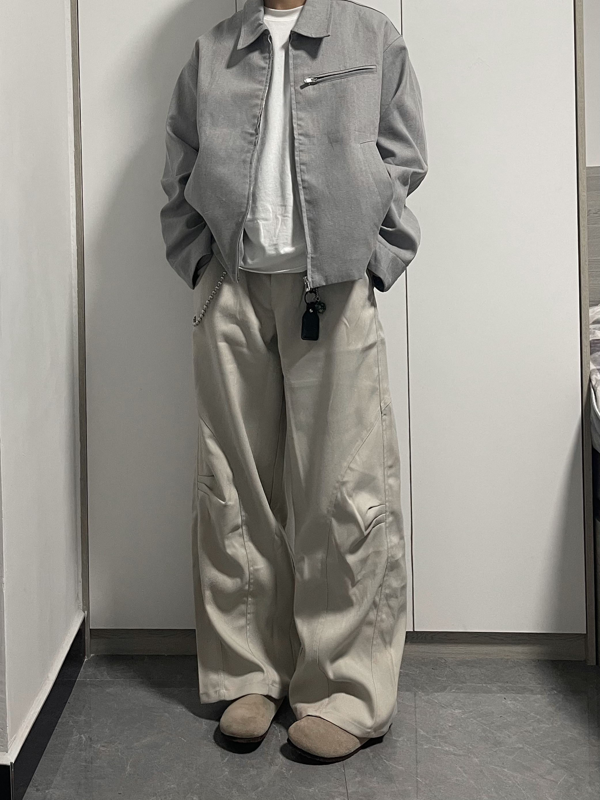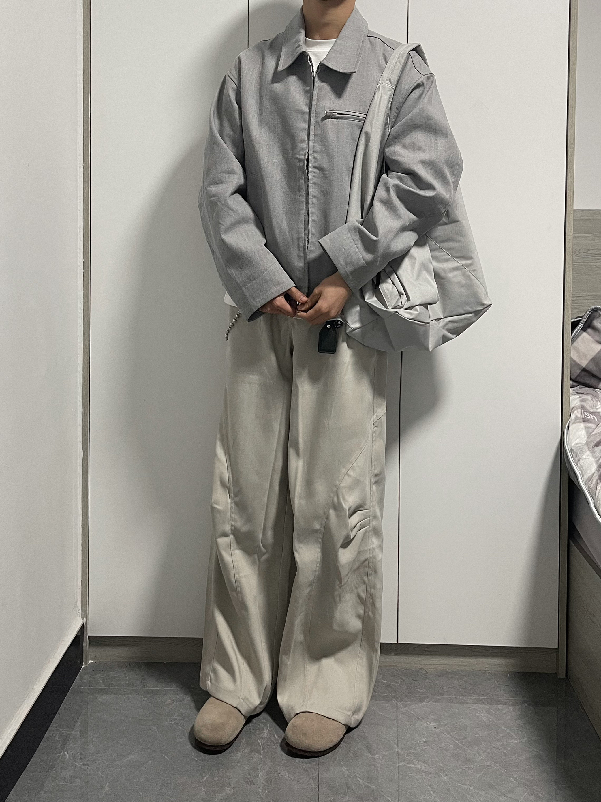 简单搭配一件白色夹克初春穿 下身搭配宽松微喇杏色西裤 鞋子搭配勃肯鞋 通勤早春搭配,男生不会搭配对着抄~