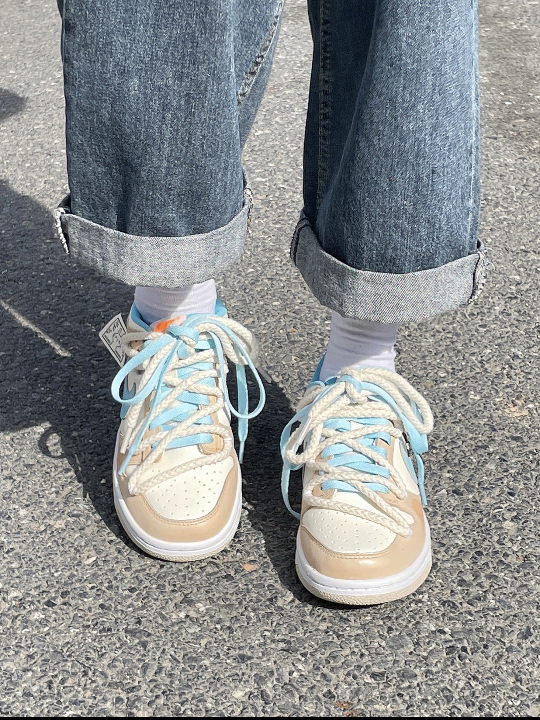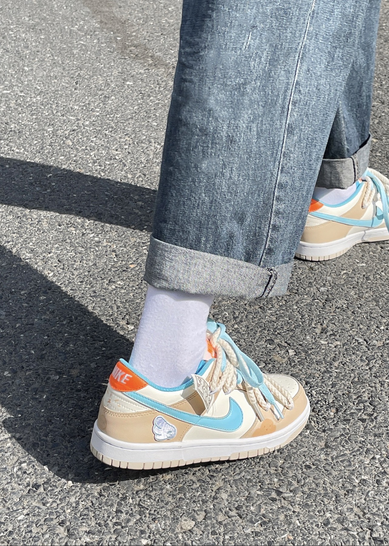 这个配色一秒入春~ 低饱和度的蓝色咖色太好看啦!! 鞋子厚度刚好不闷脚,初春穿再合适不过啦日常搭和我一样搭牛仔裤也好好看!