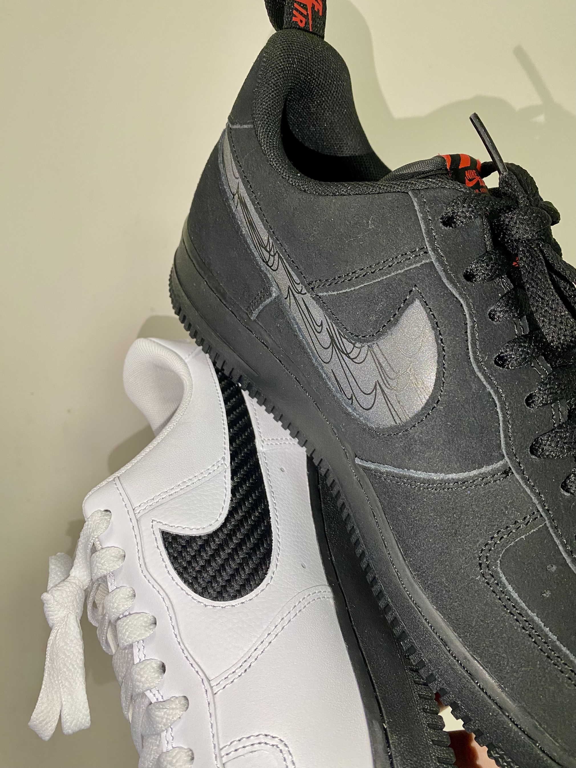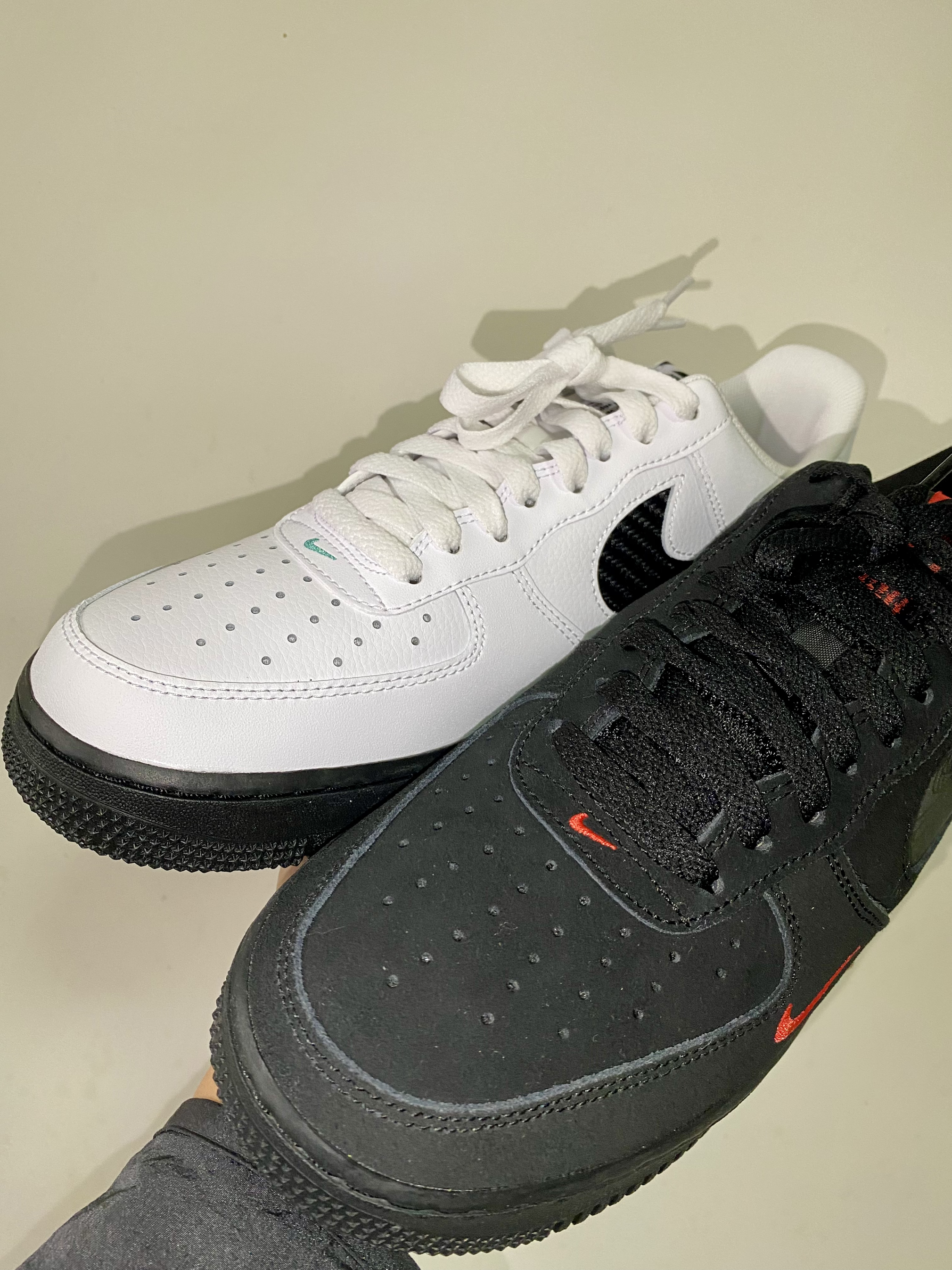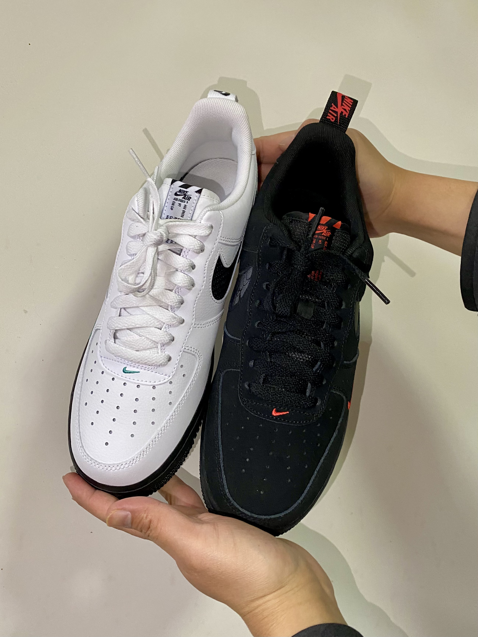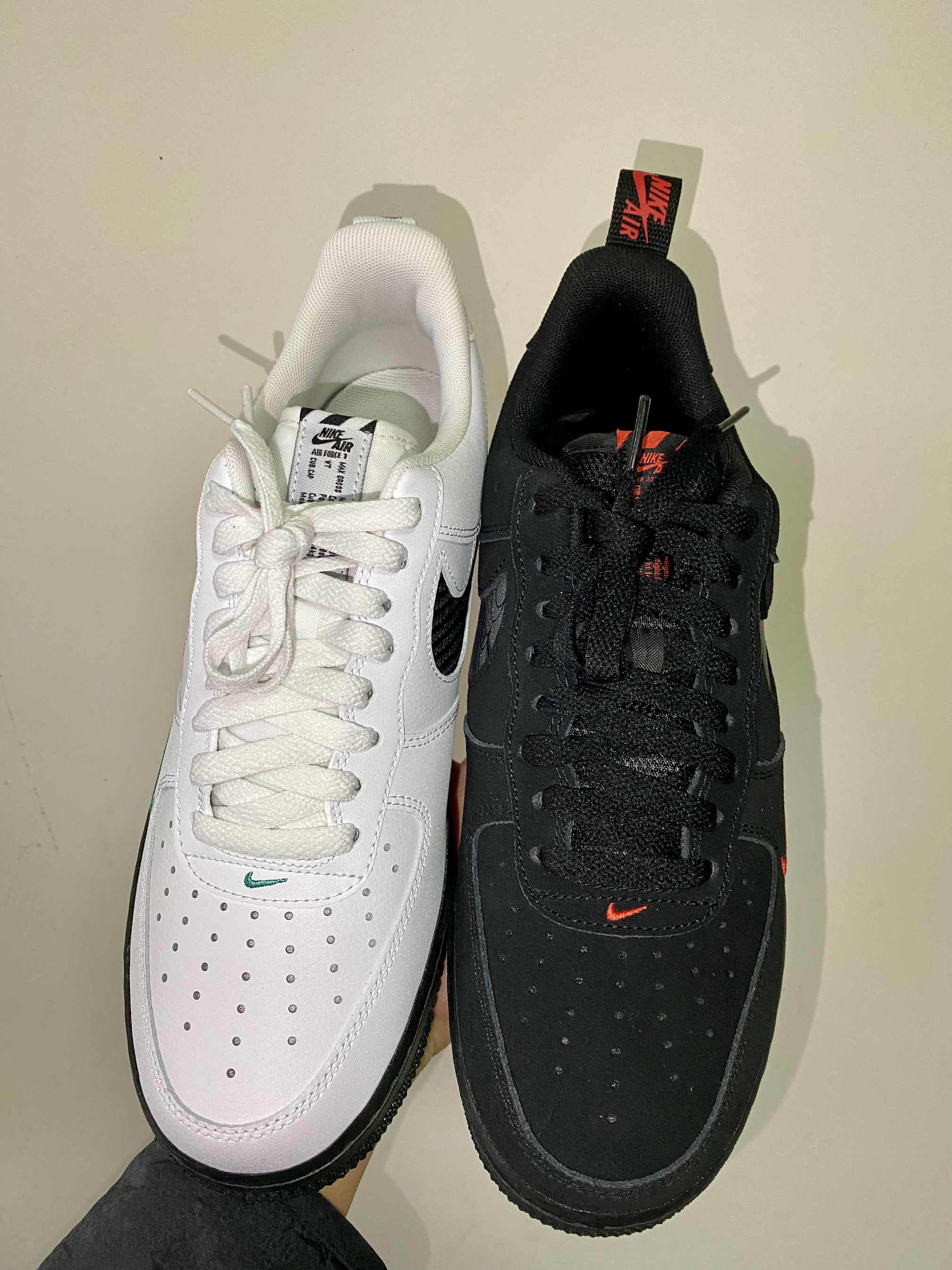 🔥分享两双同款不同配色的小众高质感空军一号,虽说走同样的设计路线,但是细节有所不同。 只说不同点: 1️⃣swoosh用料不一样,白色款用的是涤纶面料,黑色用的是塑料片,有点像碳纤维一样。 2️⃣鞋身面料差别大,白色用的是人造皮革➕牛皮革,黑色用的是麂皮面料。 3️⃣尺码不一样,同为42码,白色款更长,会大半码,其实两双穿起来都会偏长一丢丢🤏🏻。 质感很好的两双鞋,简约不简单,跟其他空军相比这两双...