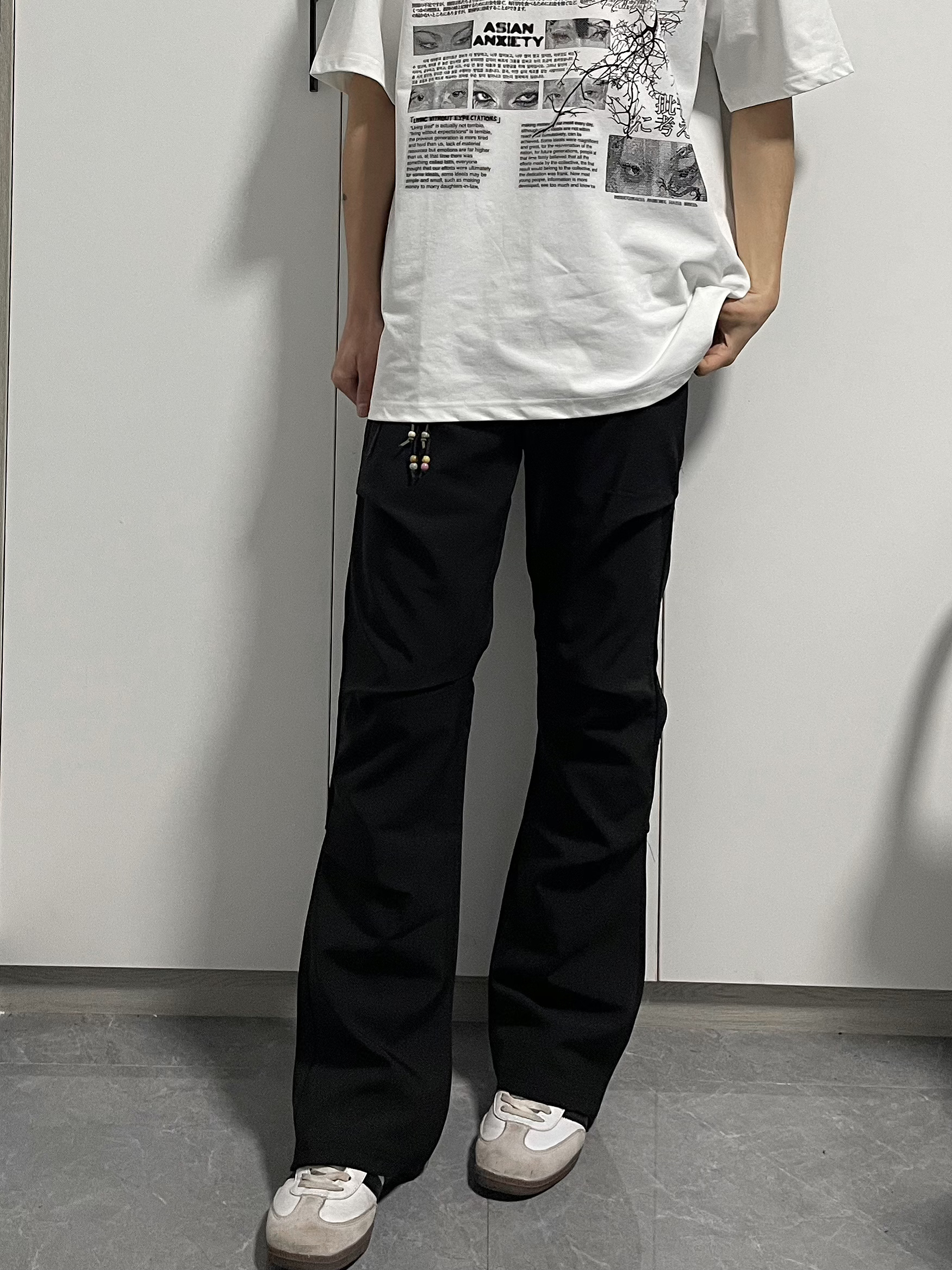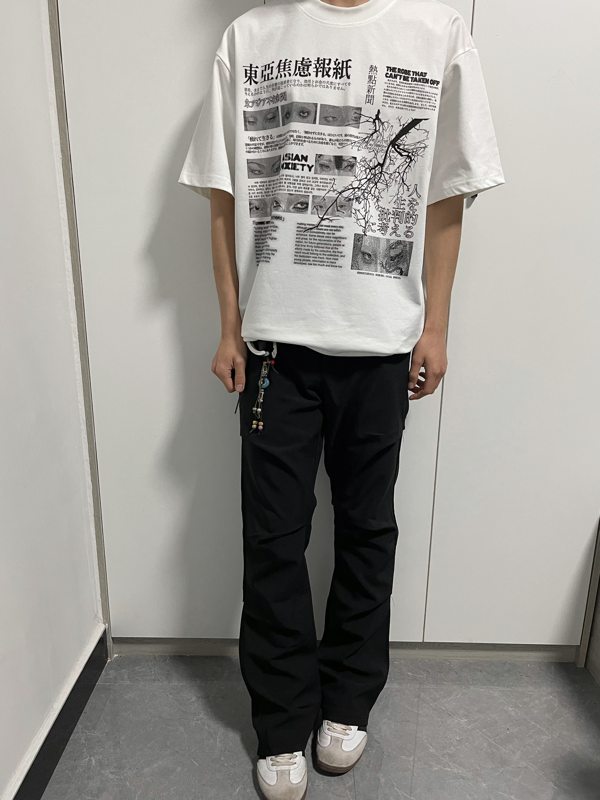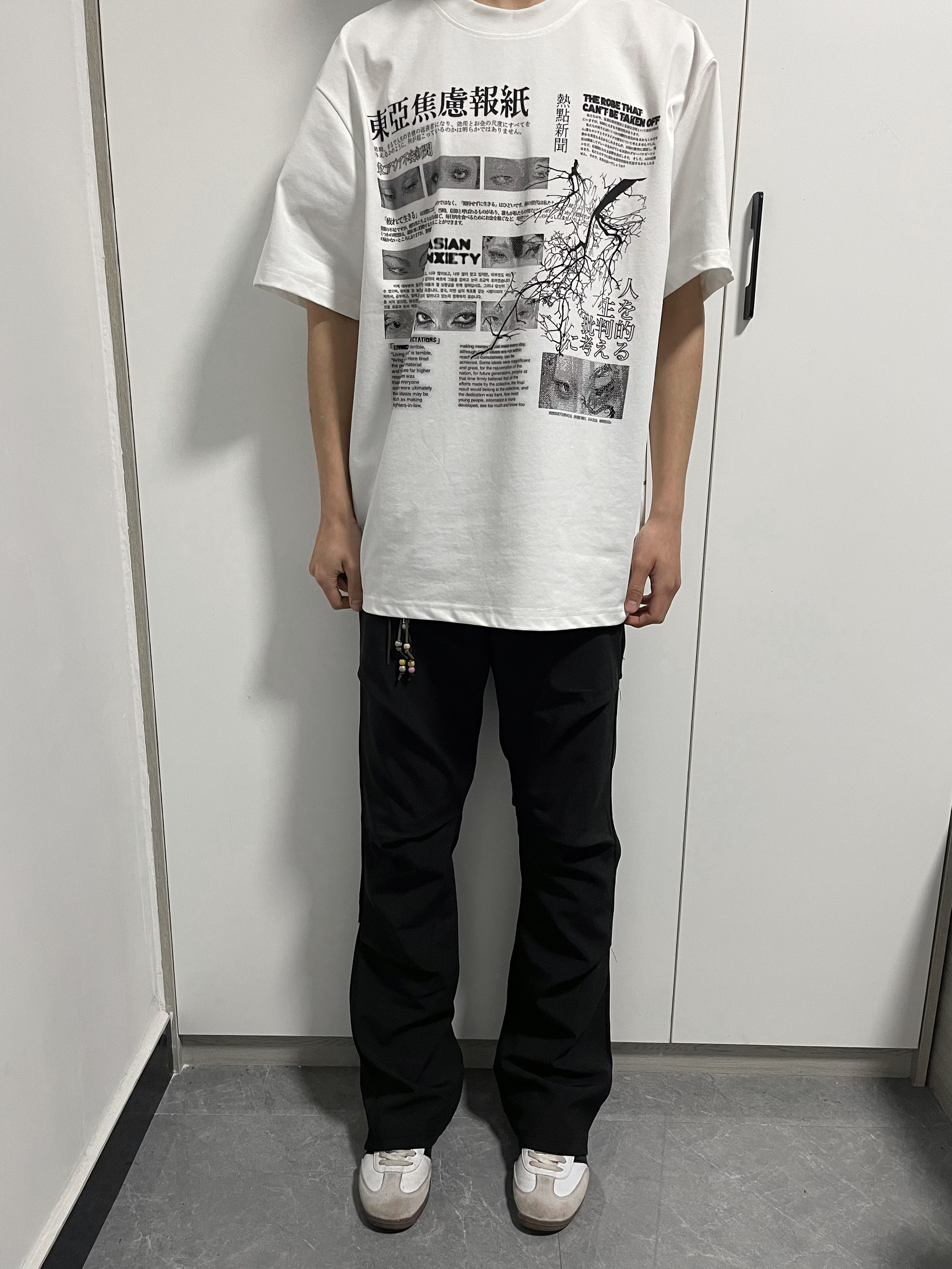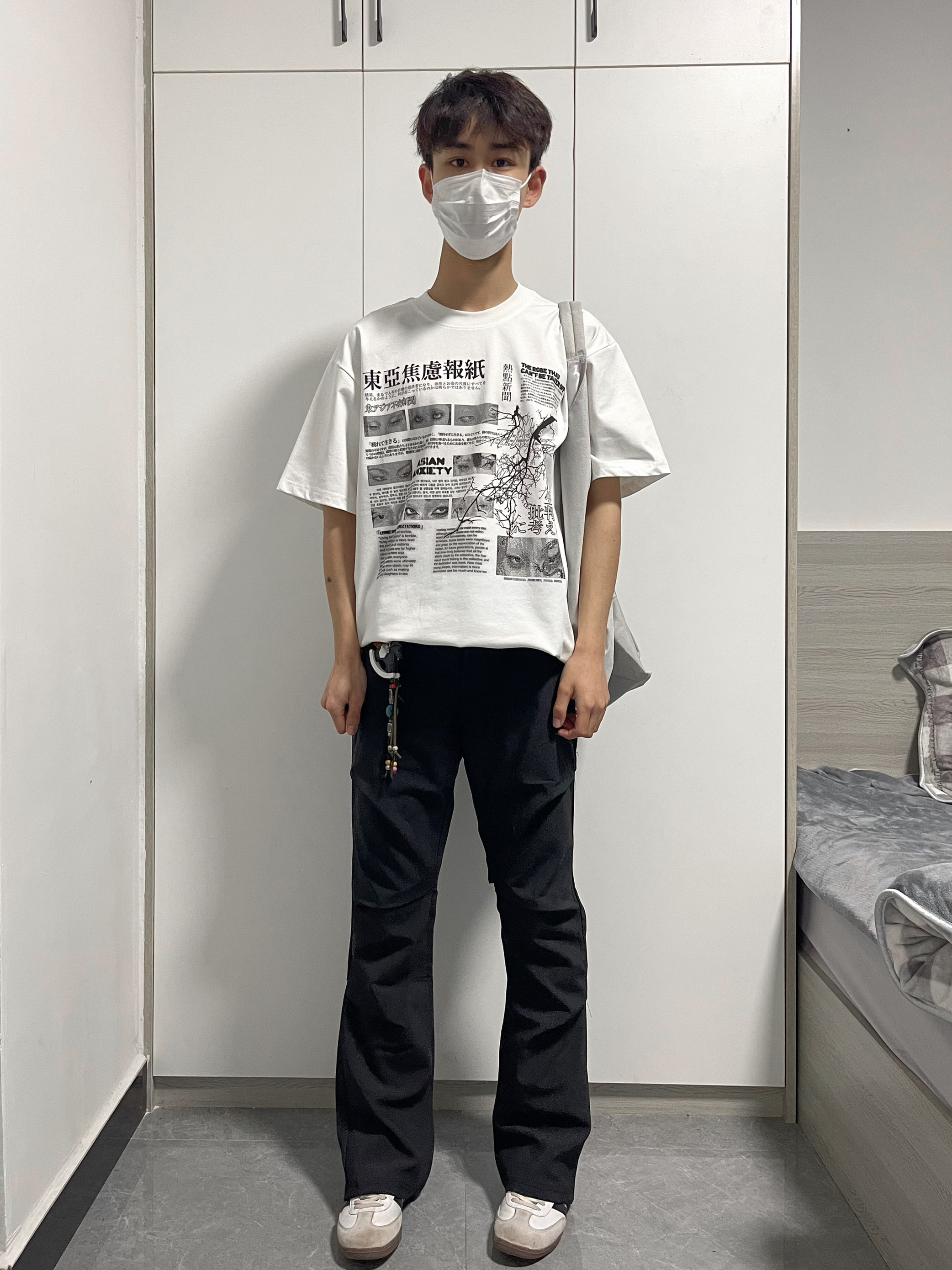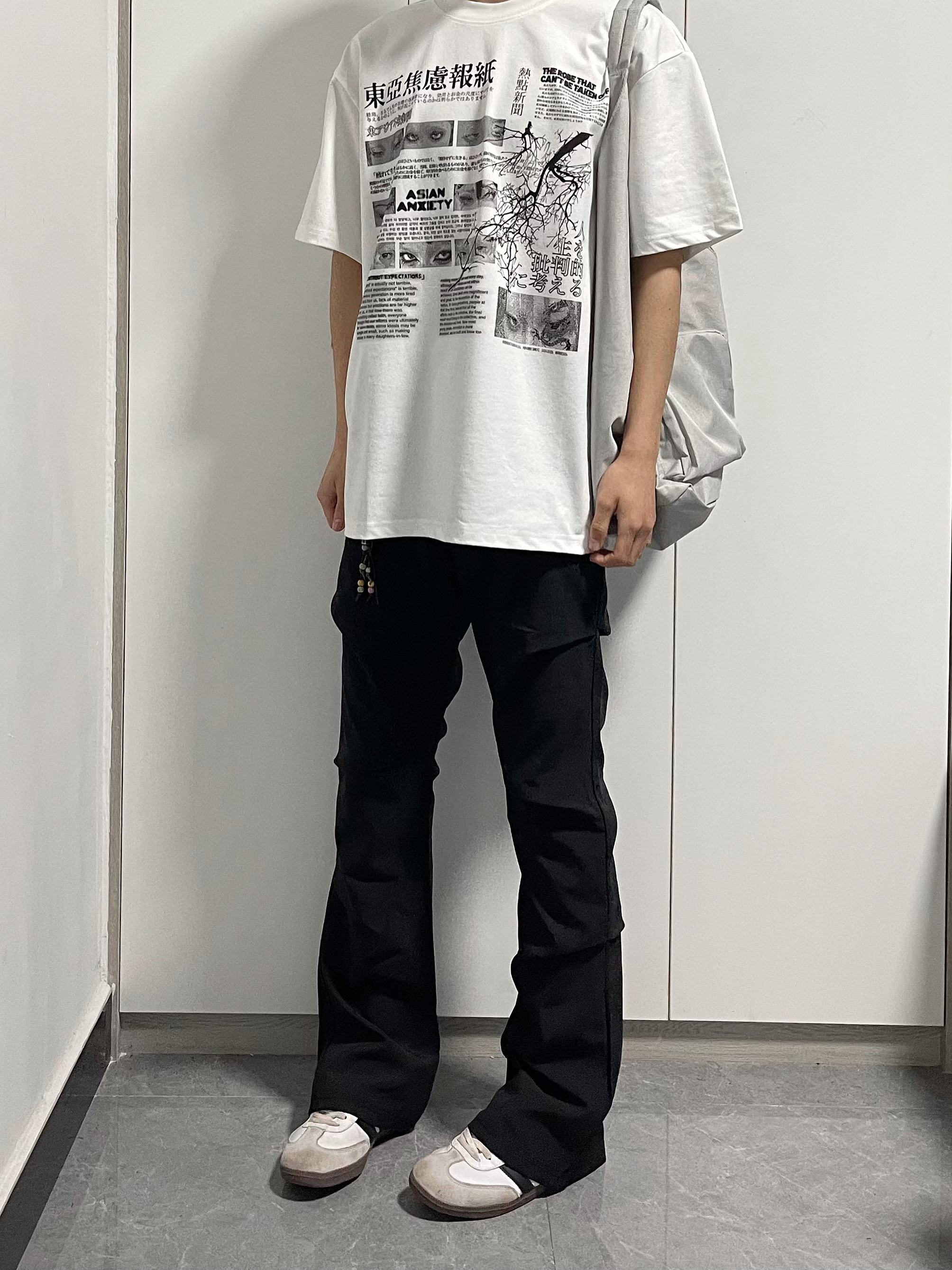 印花短袖搭配微喇裤,展现腿型搭配,显腿长比例。 搭配斜挎包干净出门。