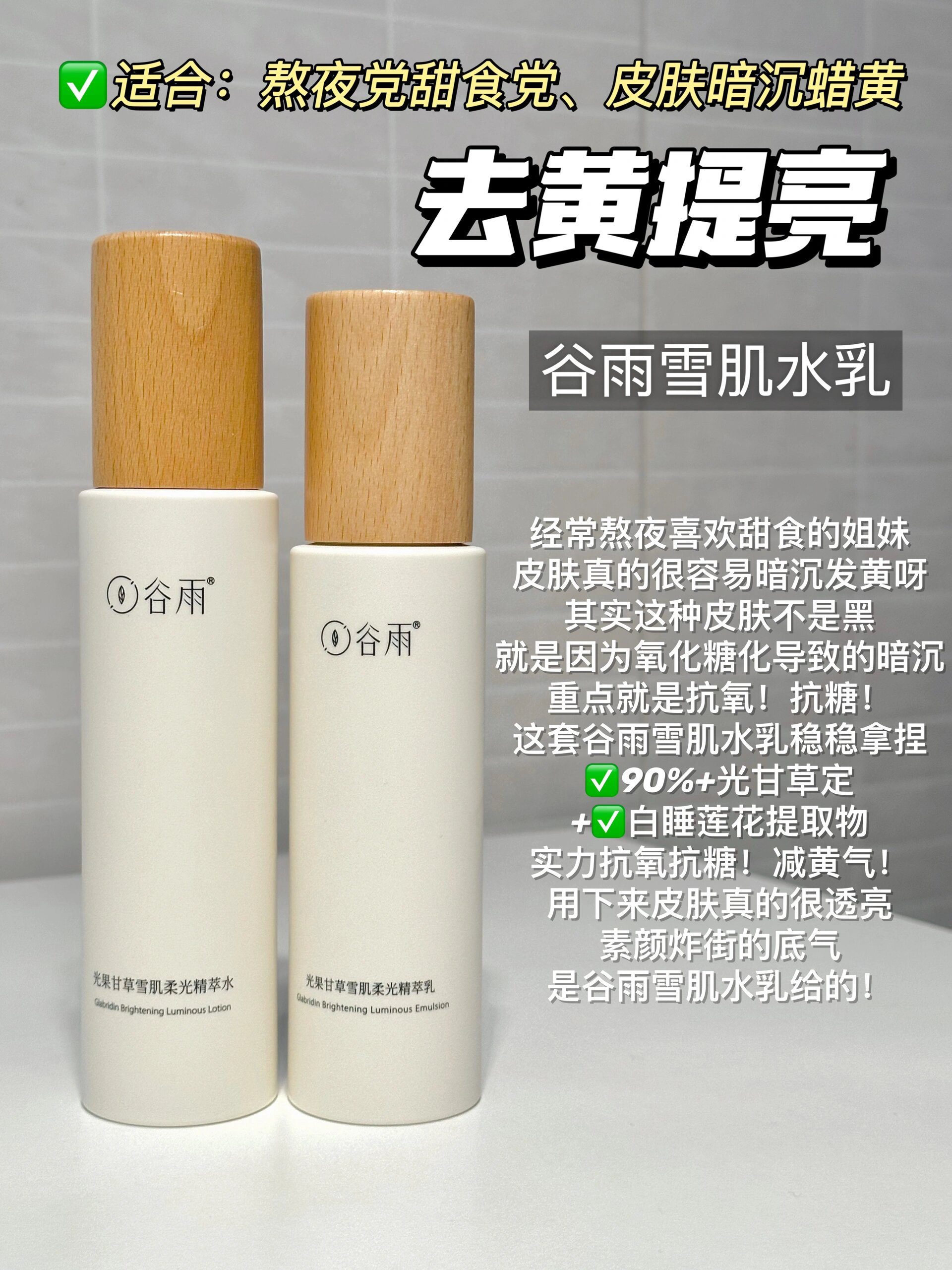 姐妹们!水乳又该囤起来了! 每次选水乳是不是都很头痛, 纠结到底哪个适合自己?用起来有效? 其实水乳需要按照自己的需求来选, 再根据自己的肤质对号入座, 买对不买贵!适合自己的才最重要! - ➡️去黄提亮-谷雨雪肌水乳 经常熬夜皮肤暗沉蜡黄的姐妹, 狂炫奶茶甜品皮肤糖化黄气重的姐妹, 你现在需要的是可以去黄抗糖化的水乳, 选这套真的没问题!稳稳拿捏! 从里到外全通路提亮的同时 协同抗糖化,让黄气无...