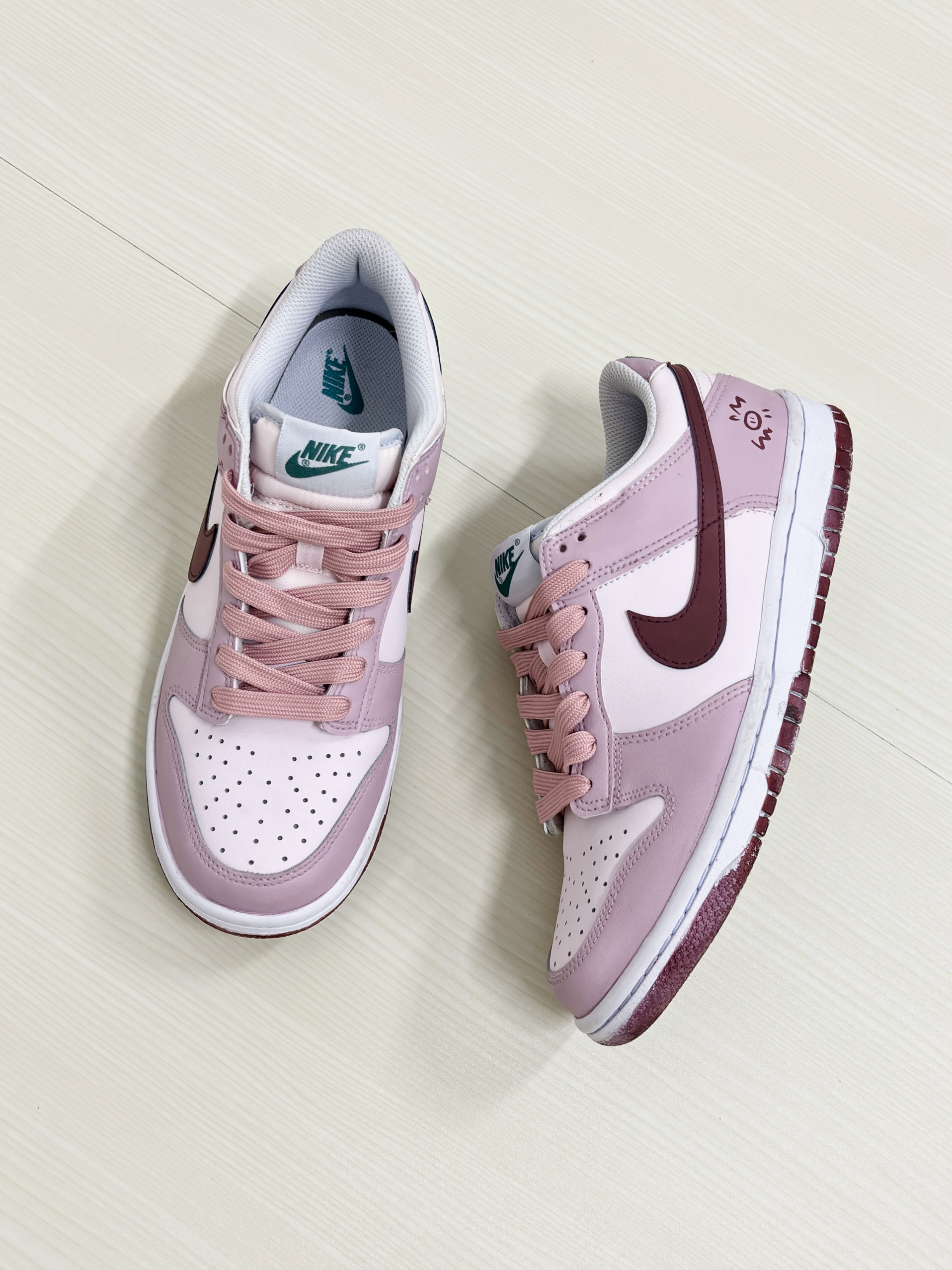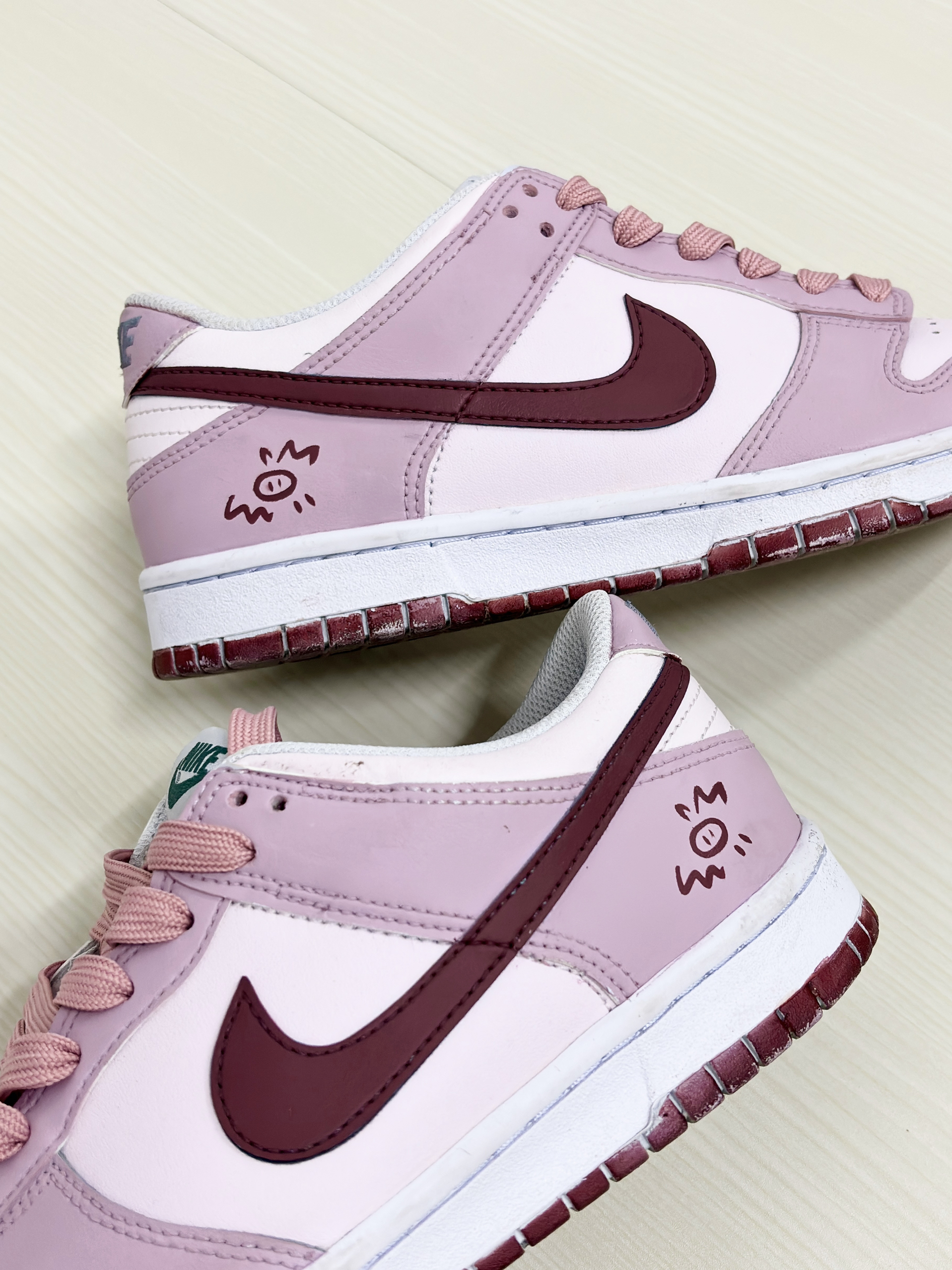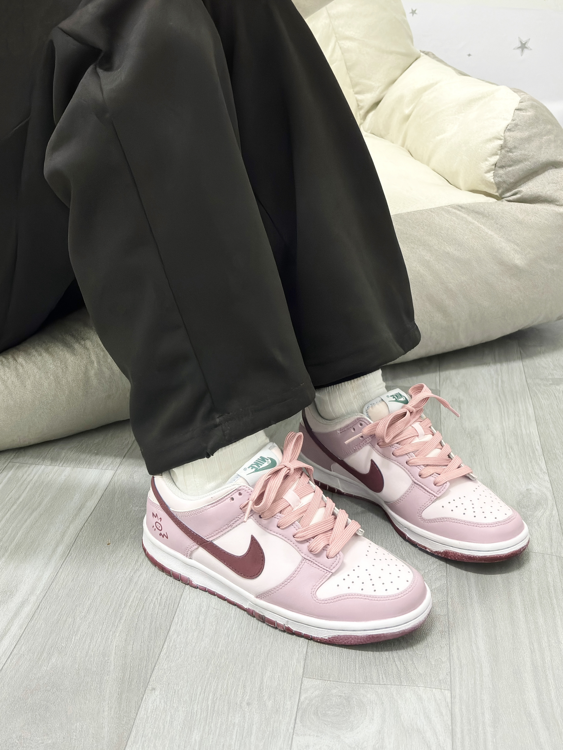 💁♂️:Hi~ 这里是大大纳mi~ 👟:定制球鞋 Dunk Low 草莓抱抱猪 这双是粉粉嫩嫩的草莓🍓色 搭配上酒红色swoosh 真的吼有甜妹的少女心呀💞 另外还有手绘🐷图案太可爱了叭! 搭配方面也不挑衣服 简单的休闲裤或裙装人都好看 尺码不偏码✅正常选择就可以!