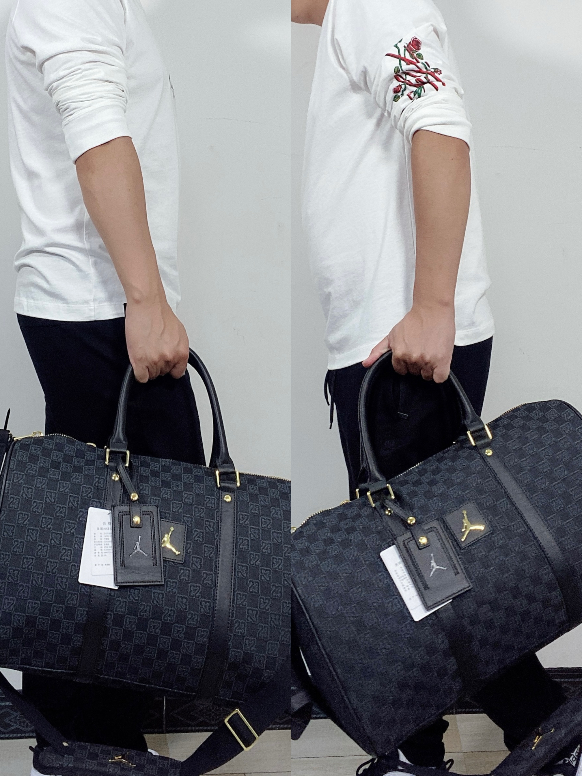 本篇笔记关联了Jordan 满印印花字母logo大容量耐用皮革顶部卷式双提手拉链开合运动收纳旅行包手拎单肩健身包 黑色 HA6466-011、Jordan Monogram 棋盘格正面徽标提花图案老花耐用织物满印拉链开合可调节肩带隔层行李单肩水桶手提包 黑色 FJ6787-011等商品,为用户提供真实的使用体验和购买参考。