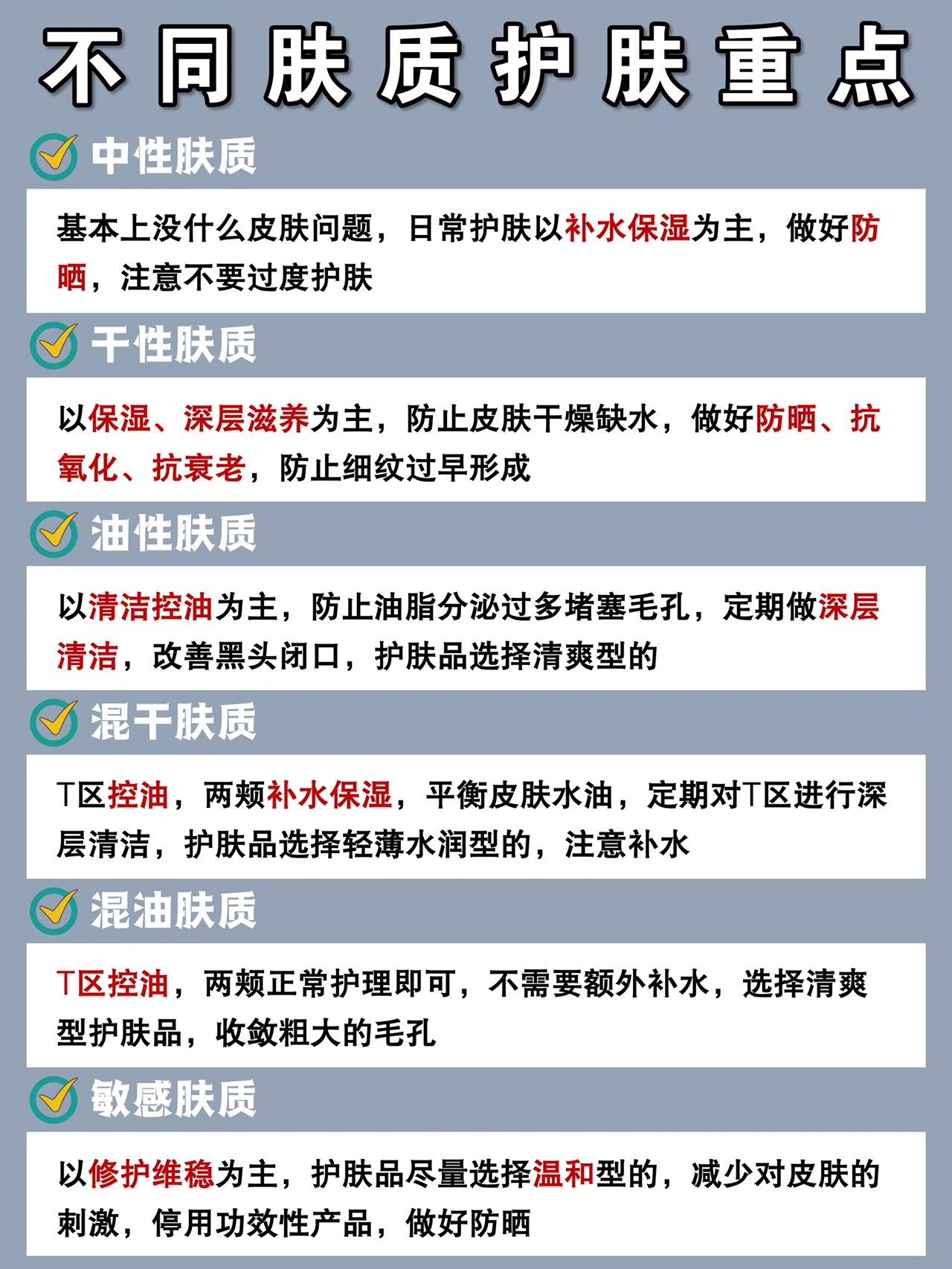 谁说男生就可以不用护肤 大漏特漏! 男生卷起来就没女生什么事了! 当然了,大多数男生对护肤还是一知半解 可能连自己是什么肤质都没搞清楚 那👆上面这份肤质自测指南可要好好看看喽! - 护肤的第一步就是先搞清楚自己是什么肤质 分享一个简单的测试方法👇 晚上睡觉前洗完脸之后,不涂护肤品上床休息,第二天早晨起床后,观察皮肤的出油情况 ✅中性肤质:鼻子、前额、下巴、双颊都不干不油或四个以上部位不干不油 ✅干...