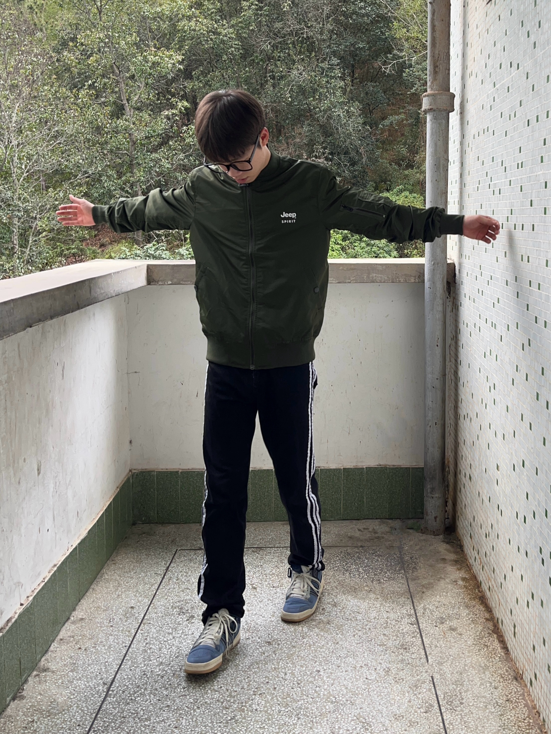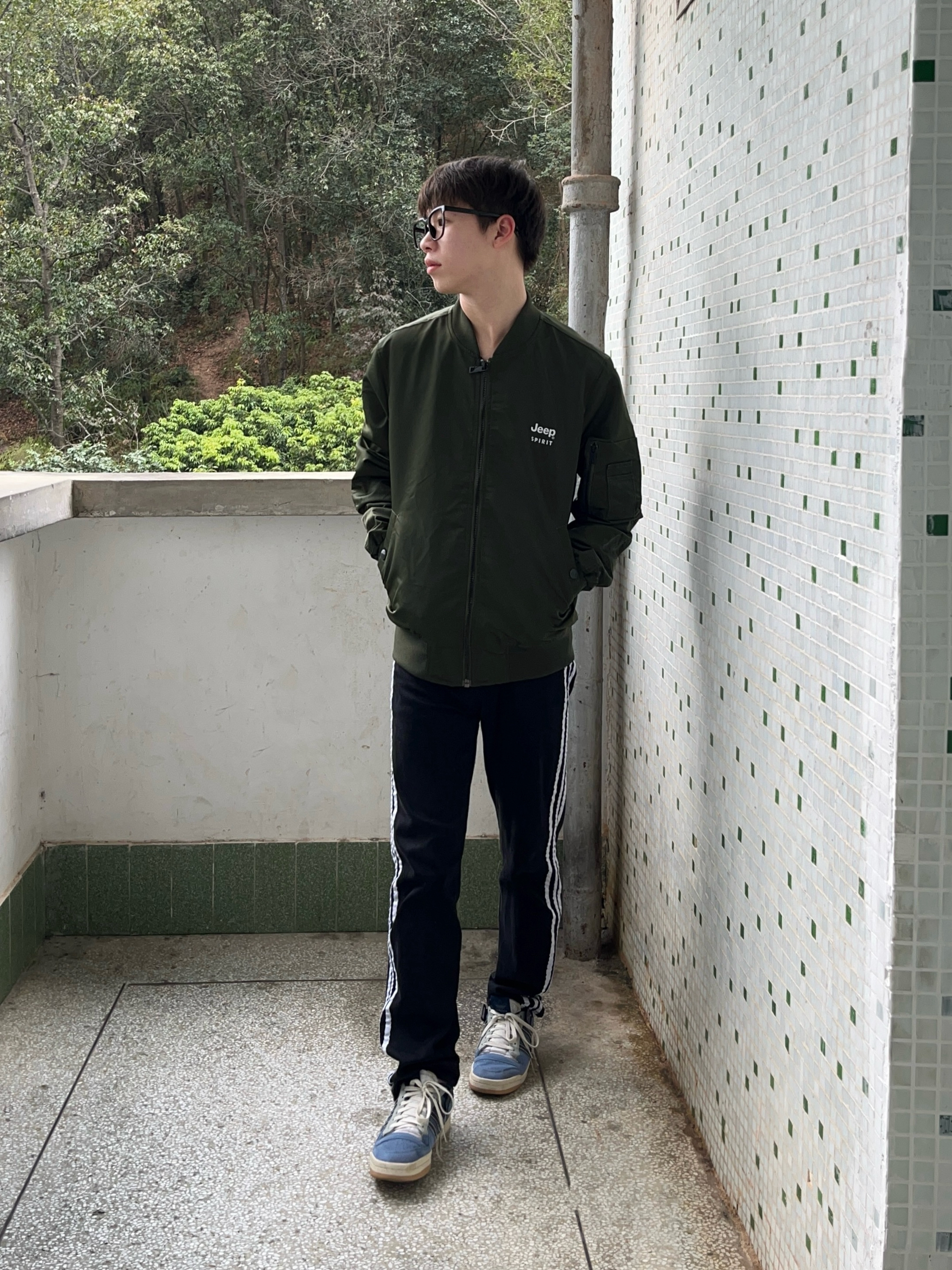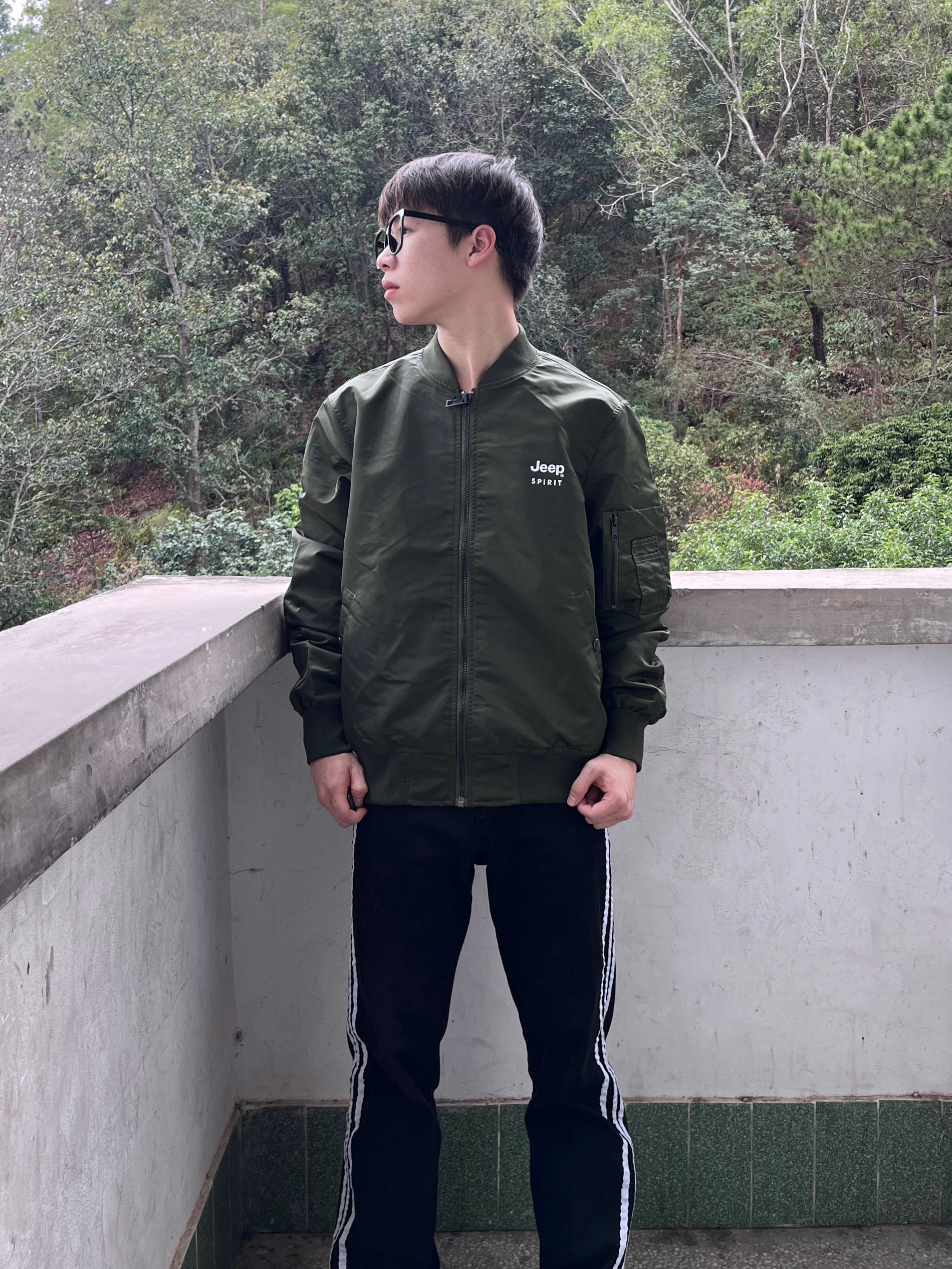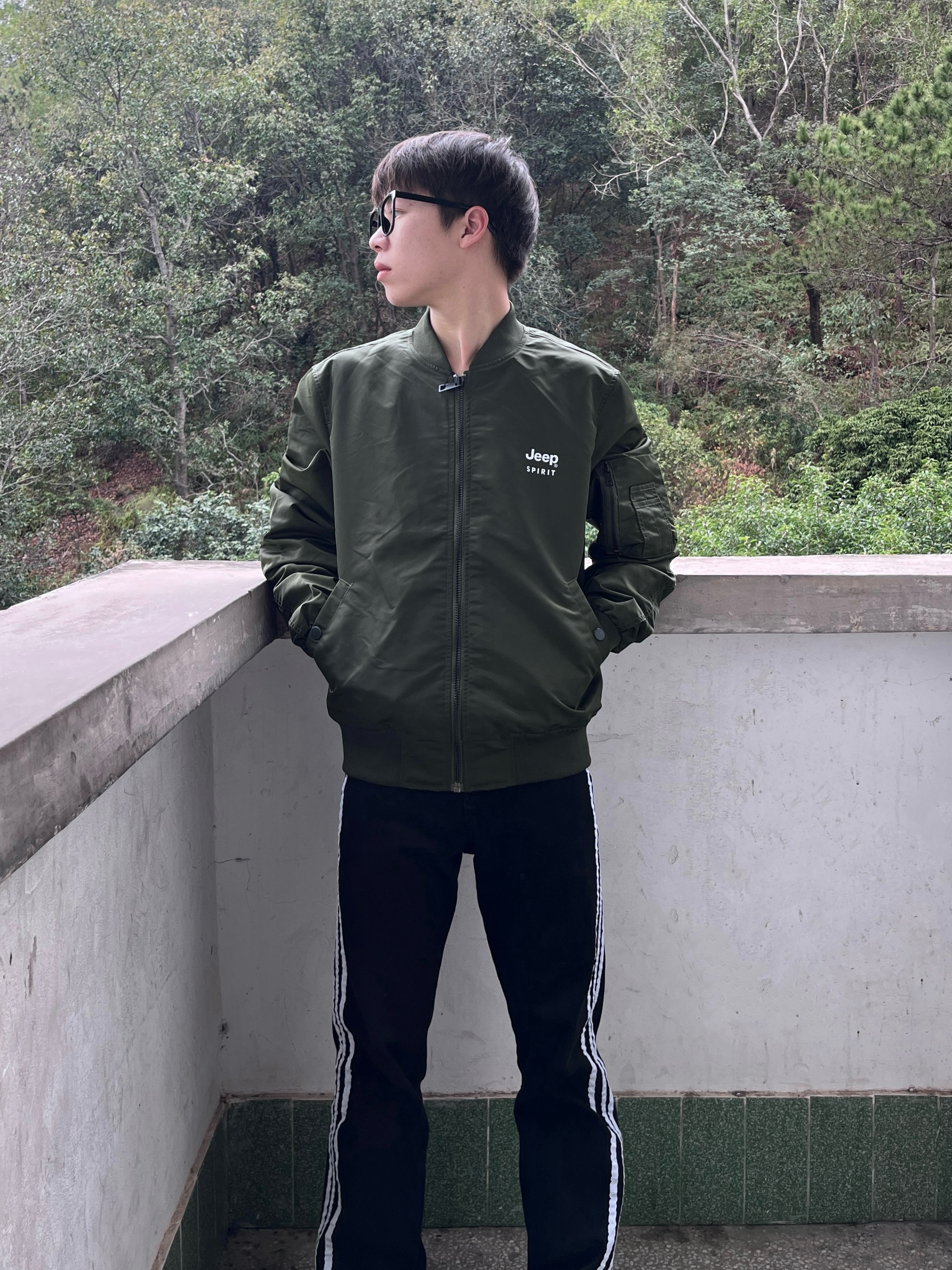 今日份穿搭分享look👀 衣服是 JEEP SPIRIT 家的军绿色飞行夹克 颜值美式复古 棒球领设计和字母印花logo图案都很有特色 再搭配一条黑白条纹直筒款 版型宽松显瘦 最后一双经典百搭板鞋点缀 一套搭配下来 出门轻松搞定穿搭