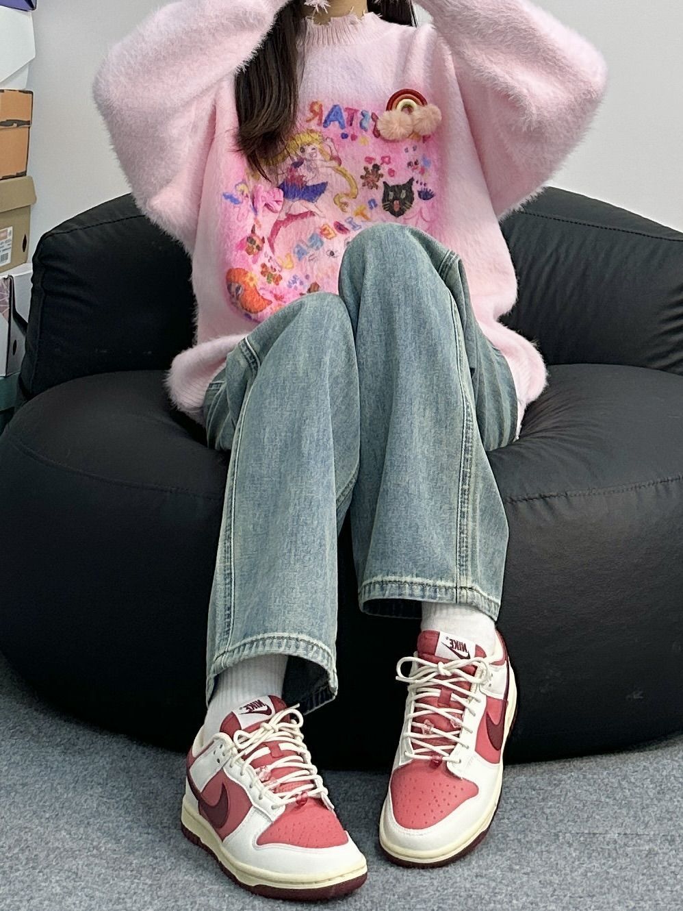 粉色上衣也太搭酒红色啦 女孩子应该很难拒绝这样的穿搭风格吧 尤其是这双Dunk后跟还有樱花图案 上脚搭配牛仔裤还挺可爱 但是脚感略微偏硬呢~ 尺码选择正码就好啦