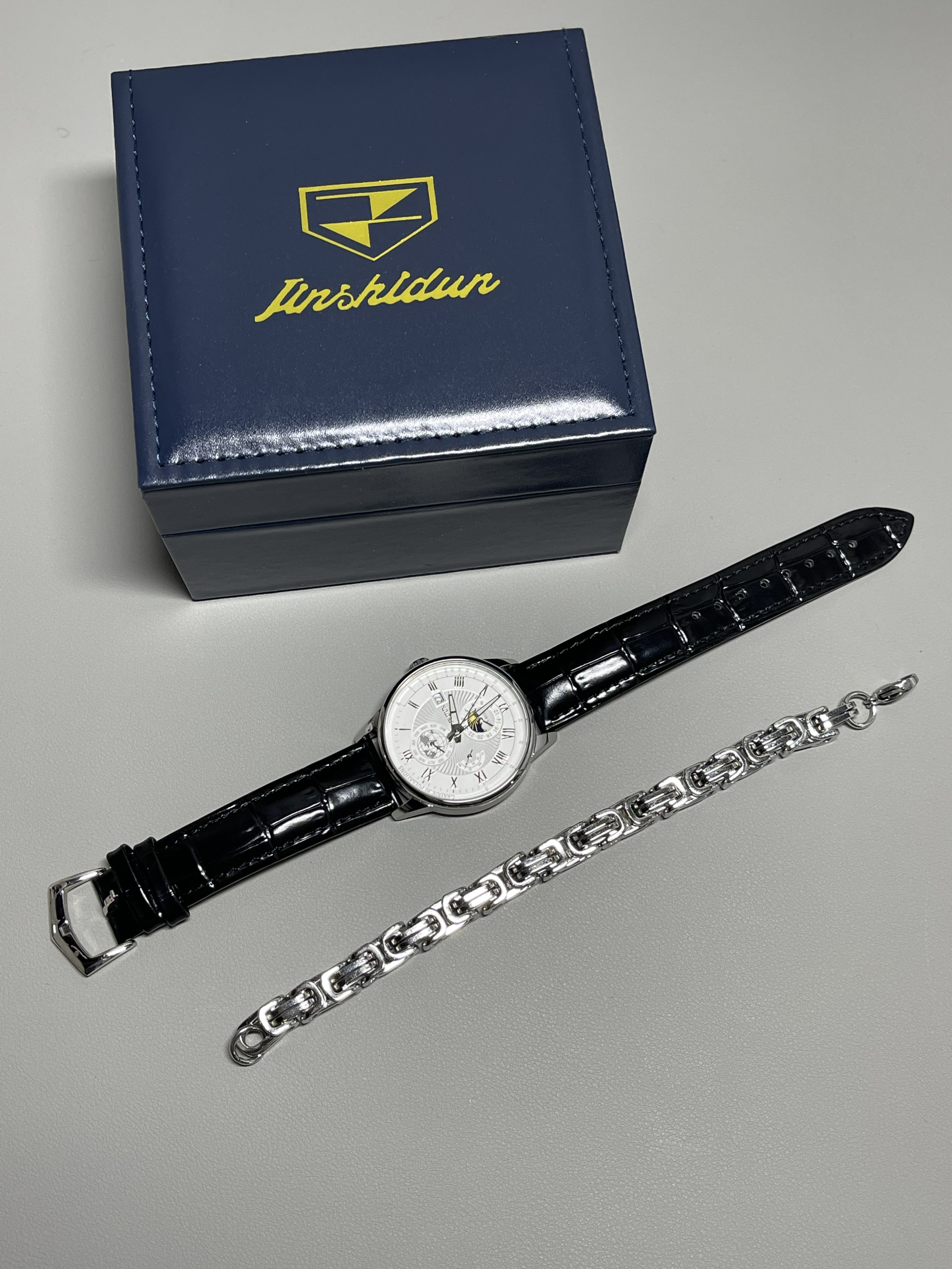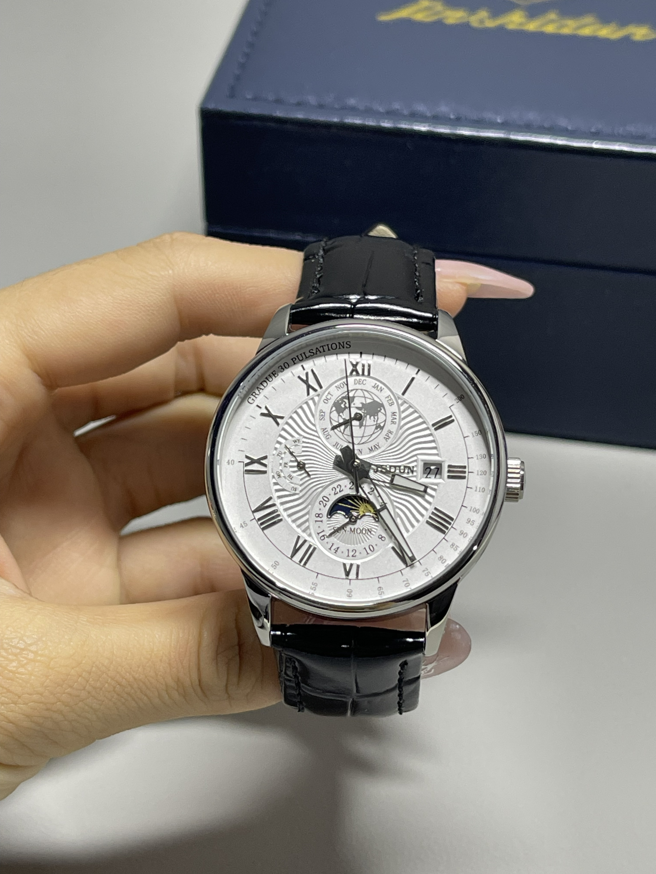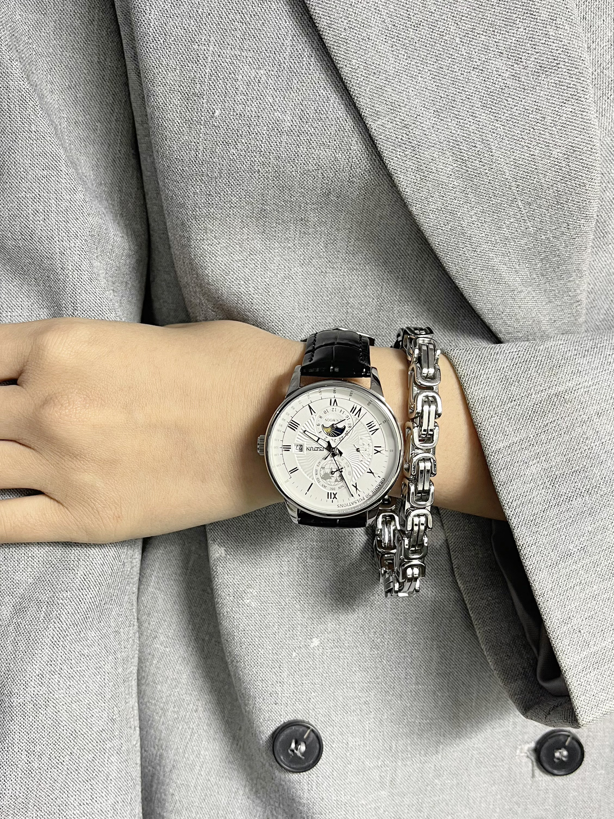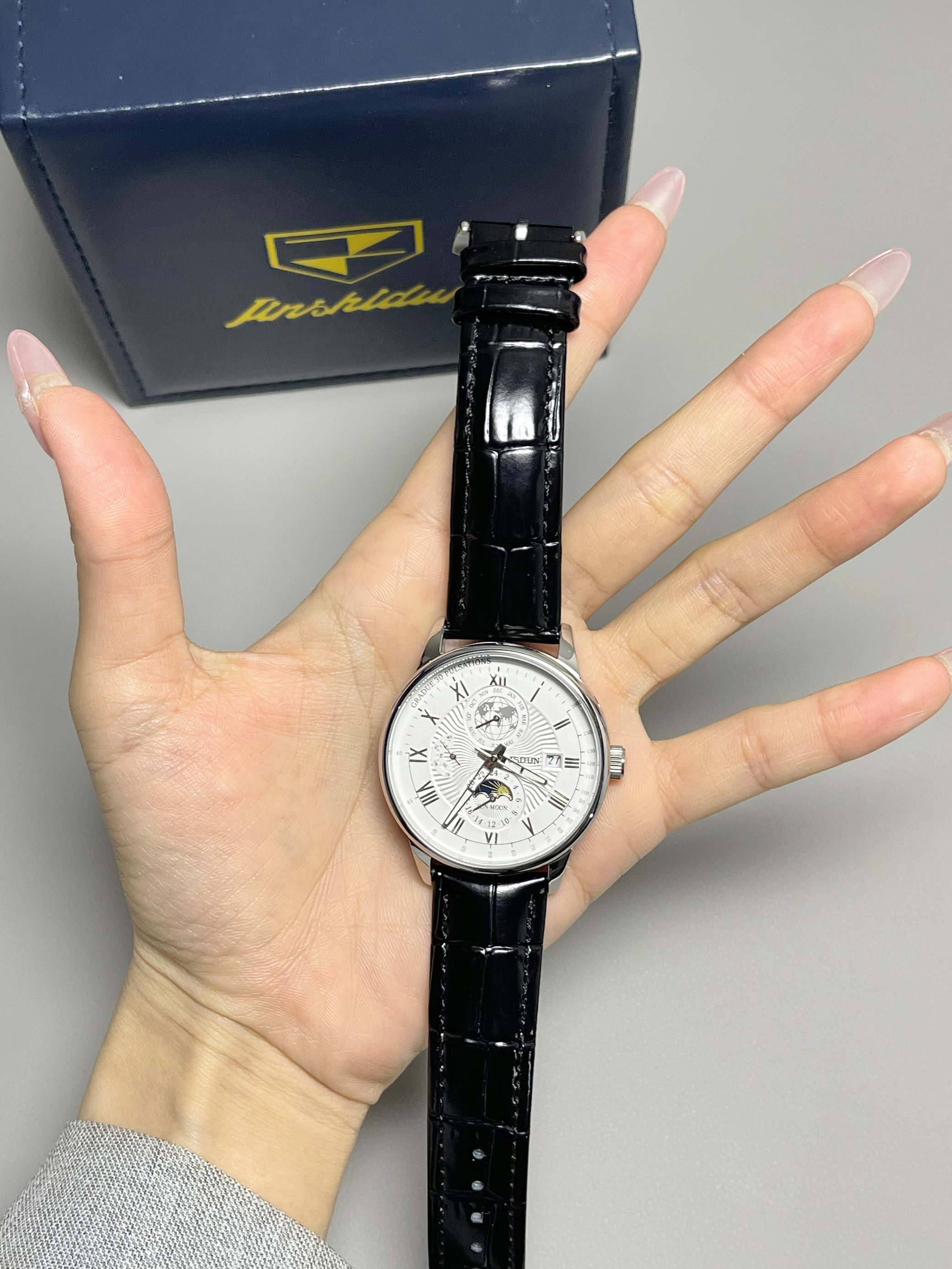机械腕表大气精致,黑色的皮表带摸起来手感很舒适 特别喜欢表盘里的白天和黑夜的设计 会跟着时间变动不一样的画面,太神奇了 性价比很不错