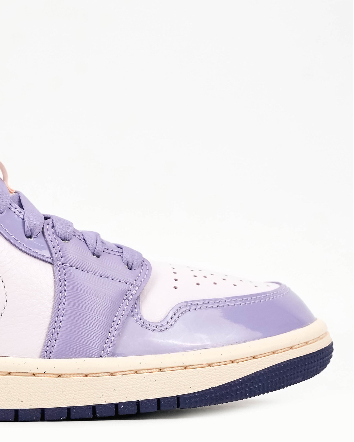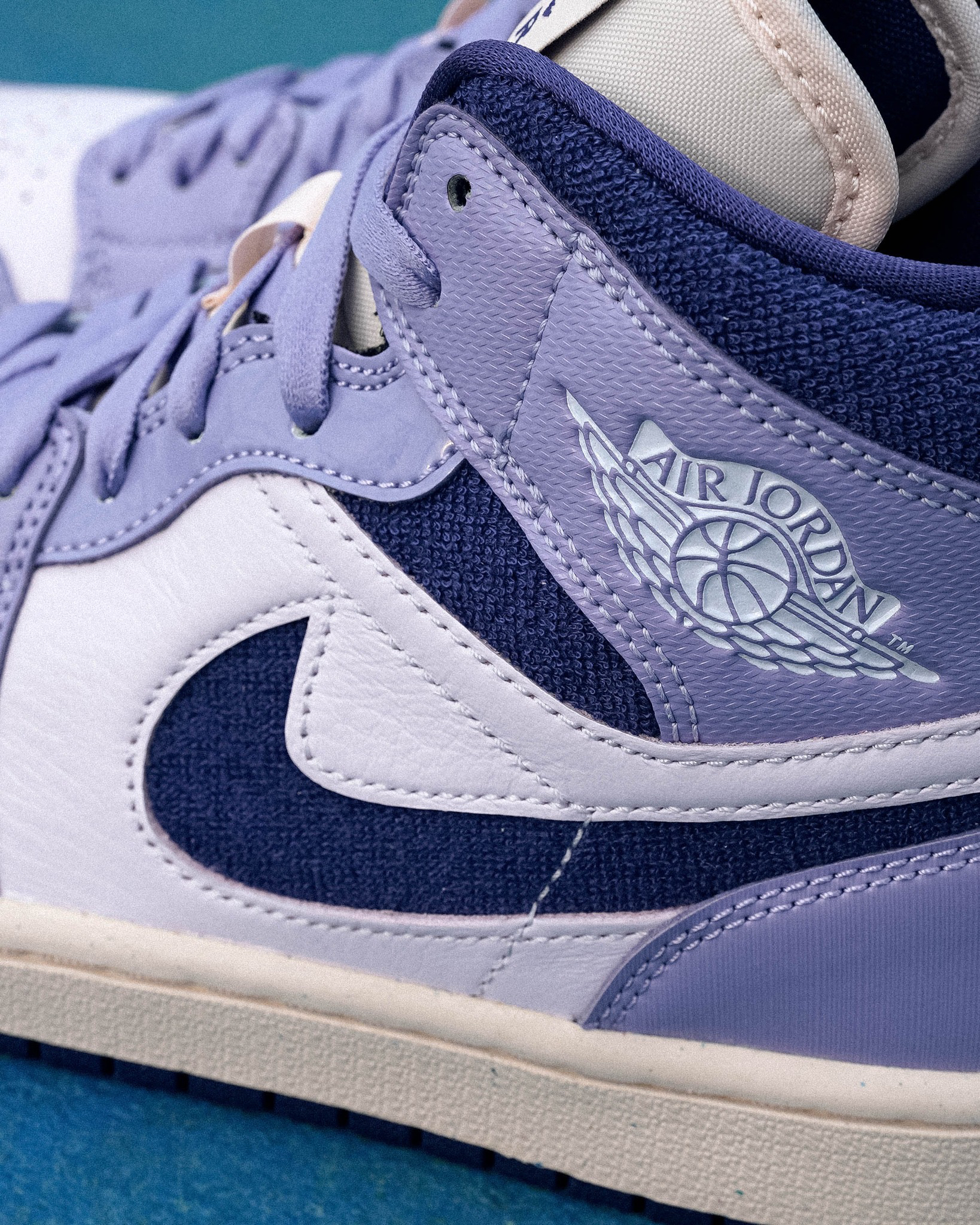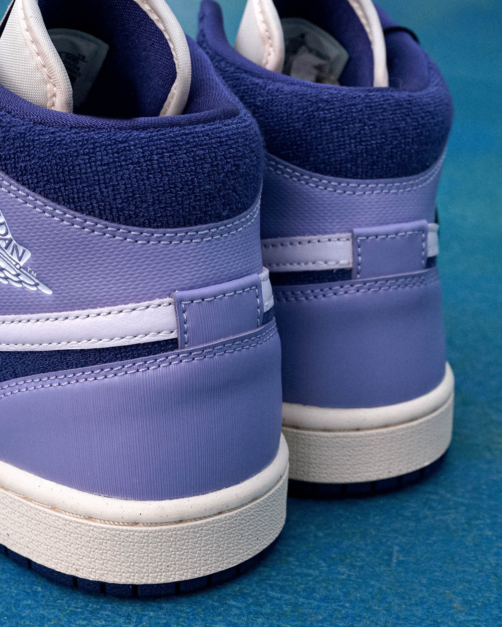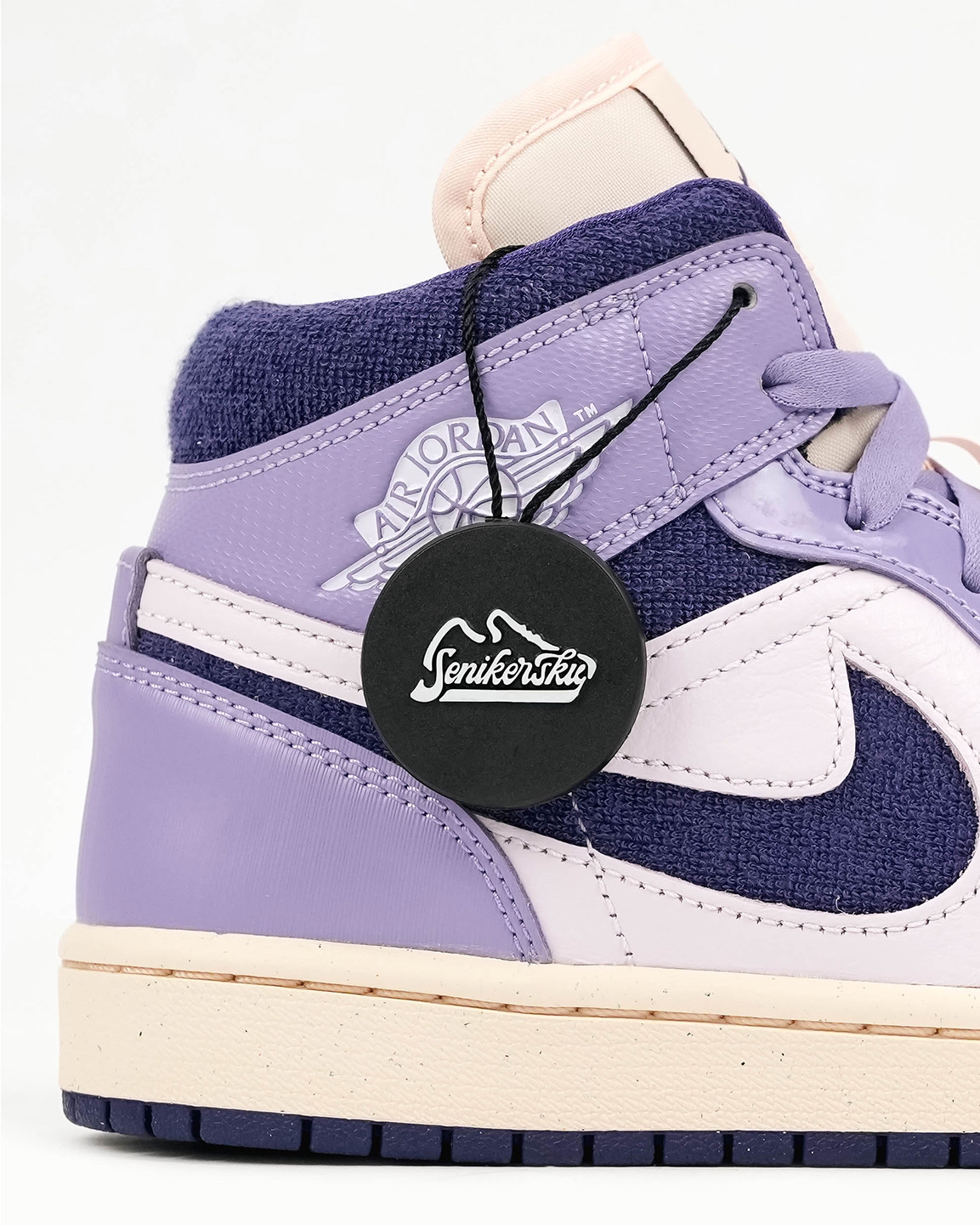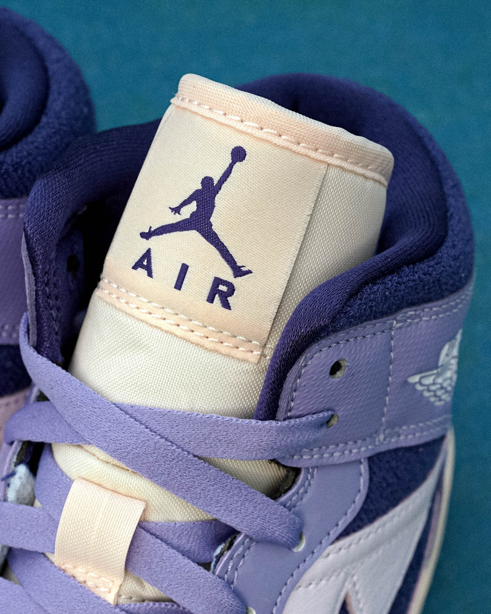 秋季时尚穿搭应该有它 鞋款以天空紫色、裸 葡萄紫色和番石榴粉色,中帮Air Jordan1设计,以紫色材料的混搭装扮,鞋款领采用纺织面料,两侧 Swoosh采用镂空设计,其他细节包括深紫色橡胶外底
