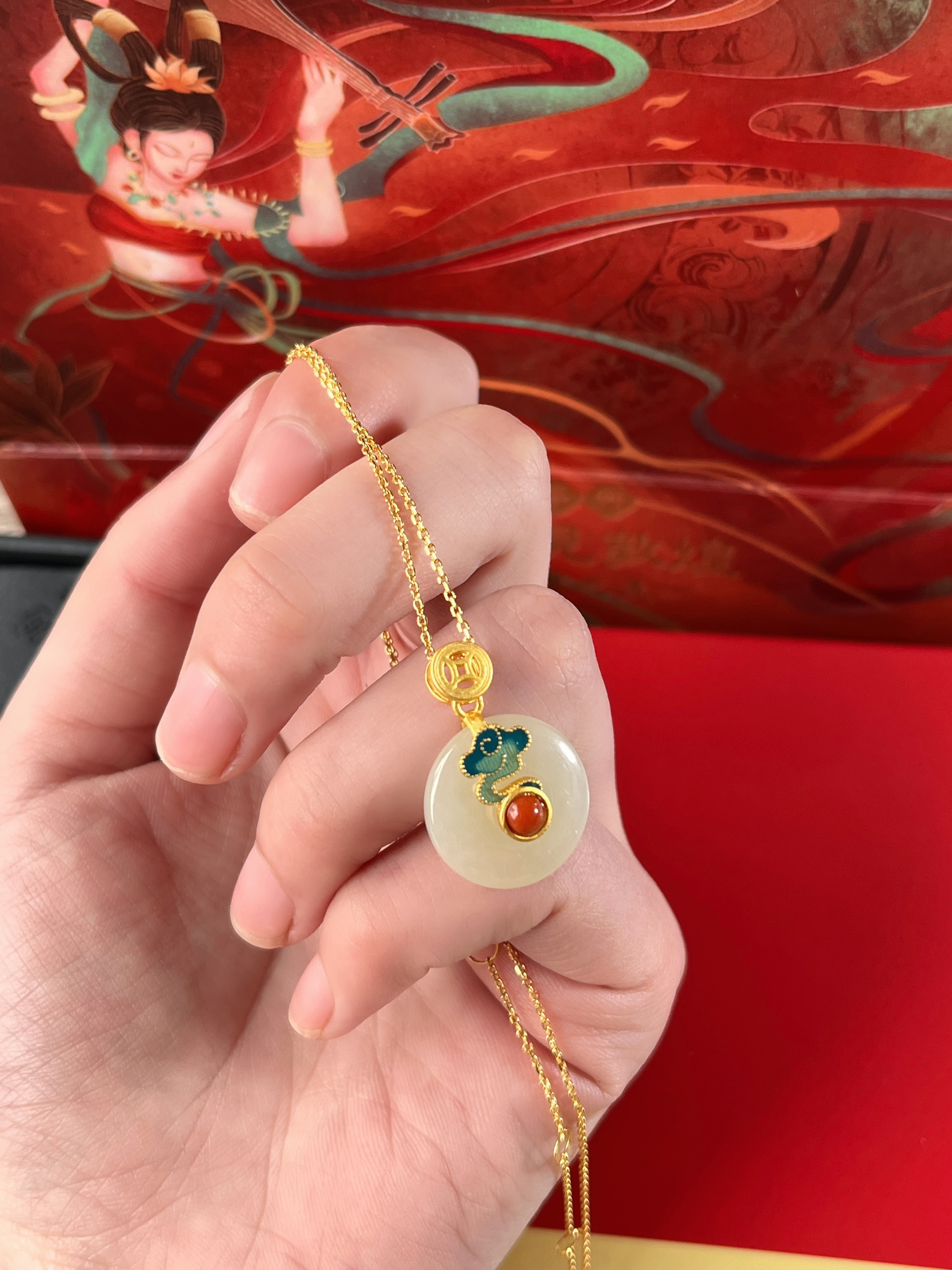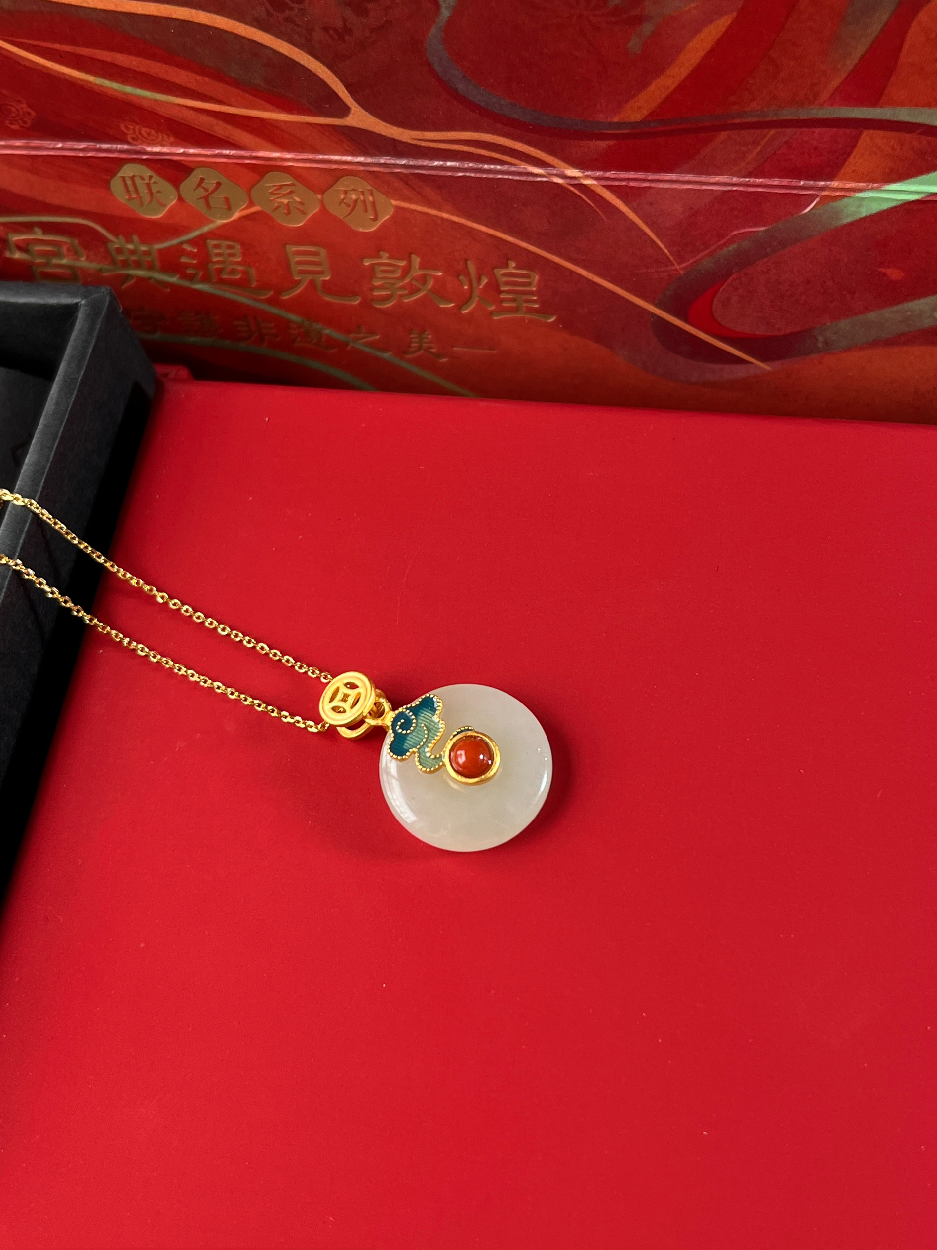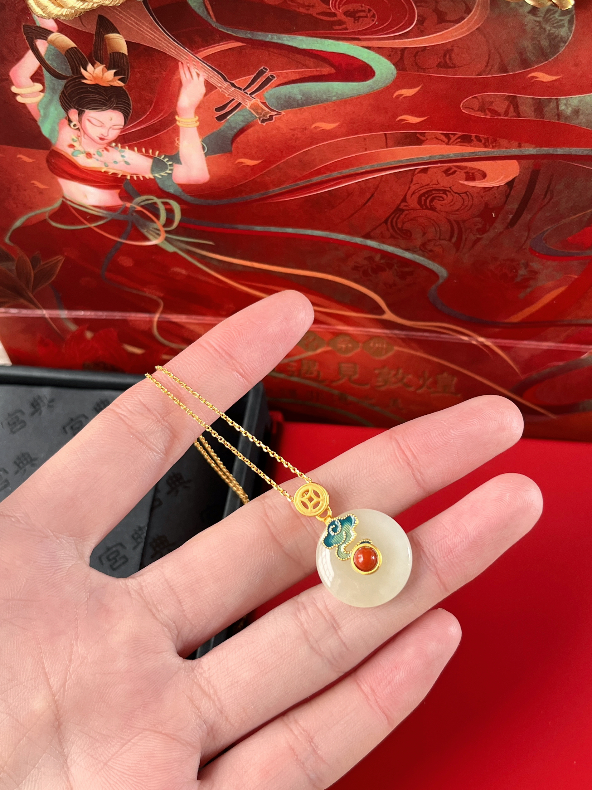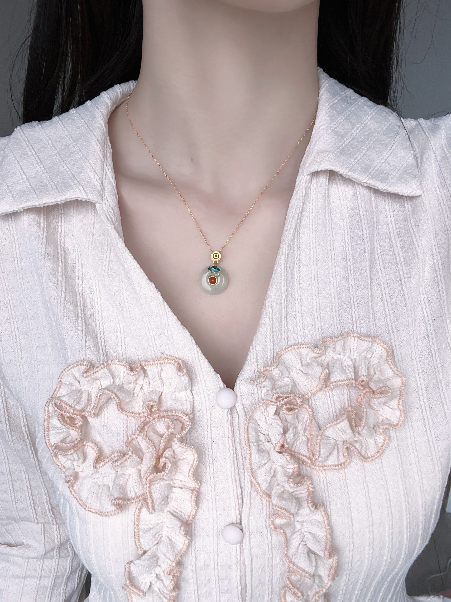 夏天又到了锁骨的时候了 脖子不能空空的 今天分享这款的项链 和田玉平安扣 搭配祥云彩绘很是贵气 质地细腻温润 和田玉寓意着平安顺遂 希望今后都顺顺利利的~