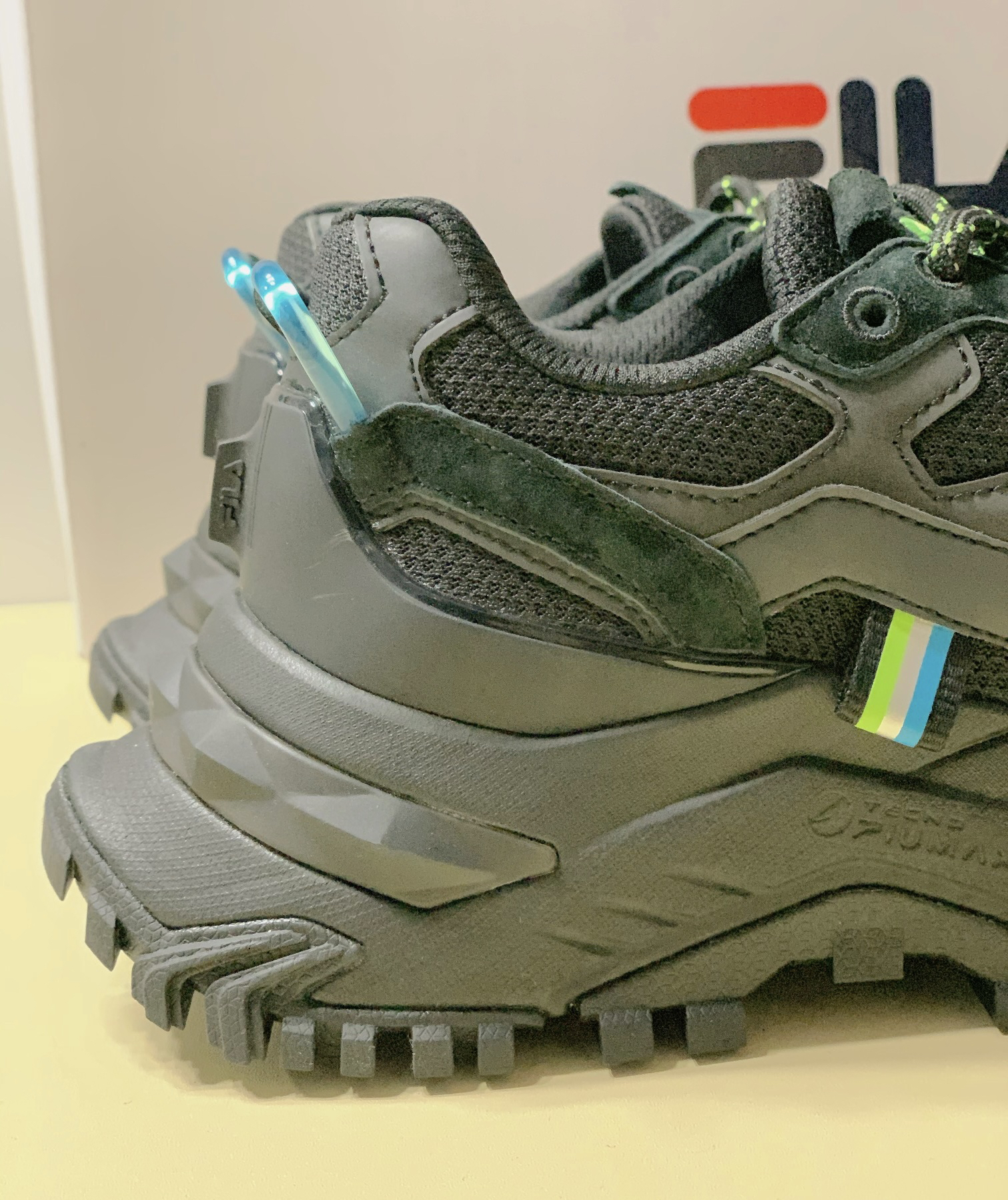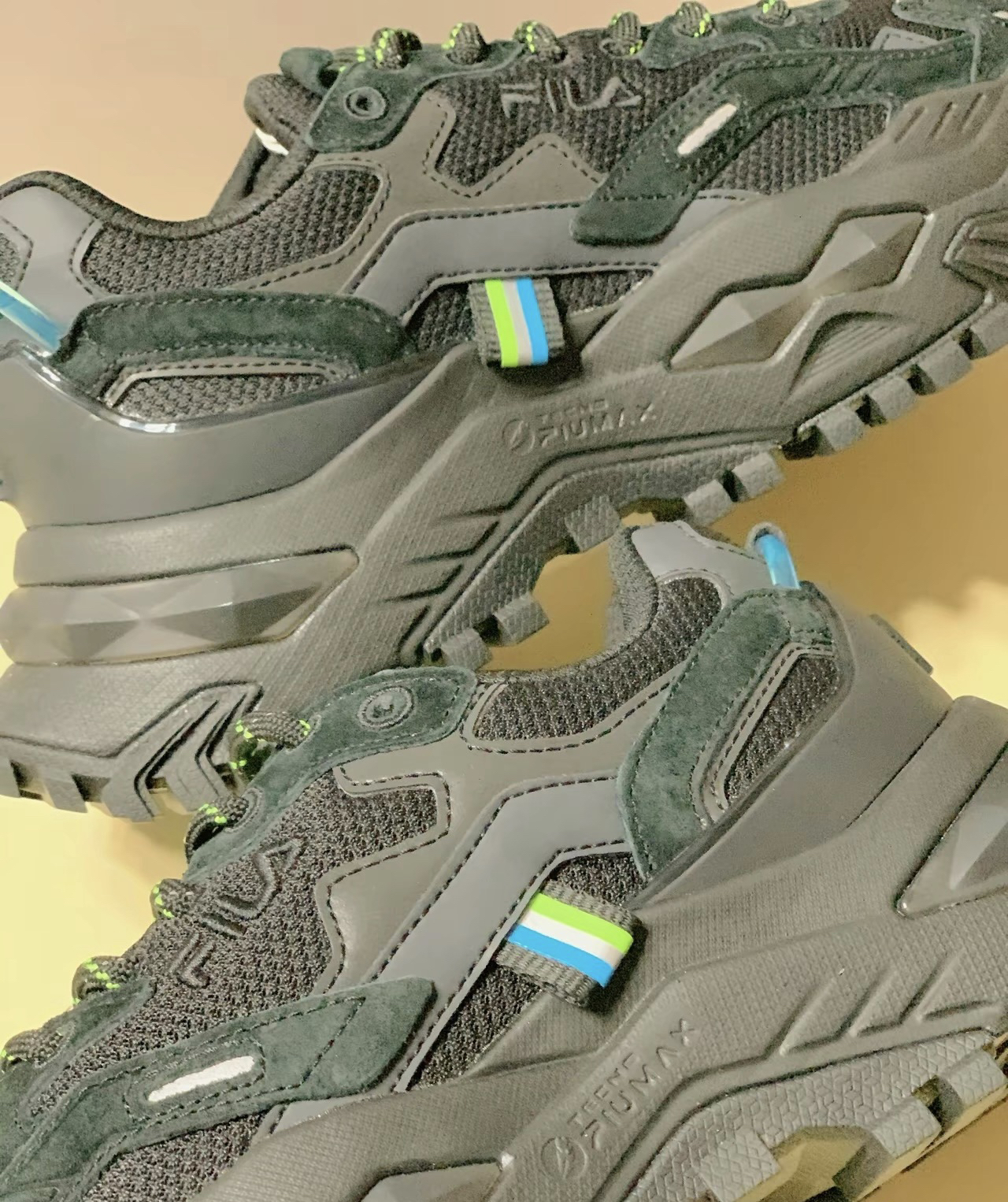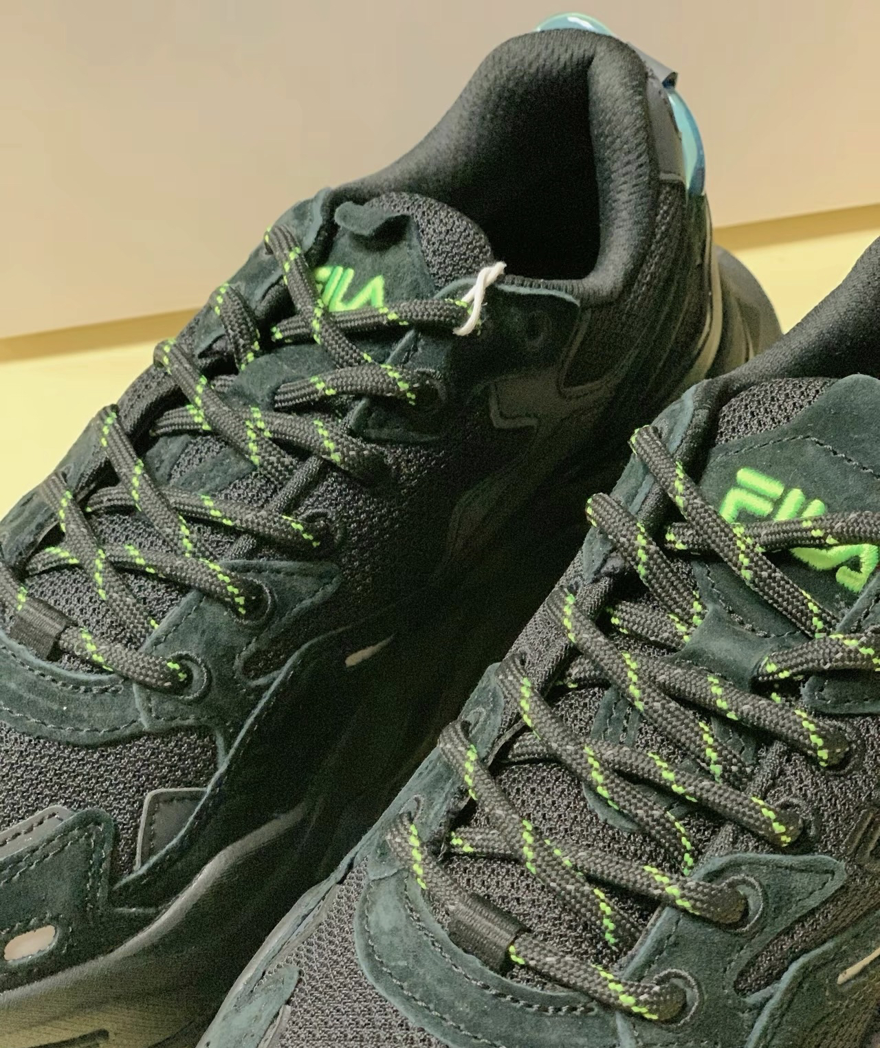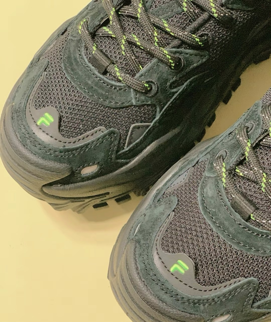 鞋身为黑色,鞋带为黑绿色相见,鞋头上方有个 F的字母,鞋舌上也是绿色的10g0,黑色里透露 着一些荧光绿,这配色真的很帅气 鞋底为超强增高设计,而且属于老爹鞋,毫不夸张地说,这鞋底至少得增高了四五厘米吧,在于 不用怕别人说个子矮了