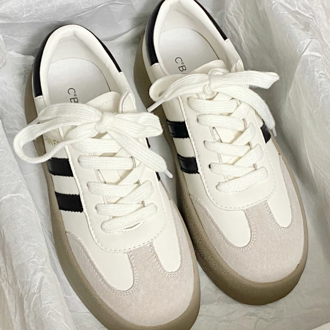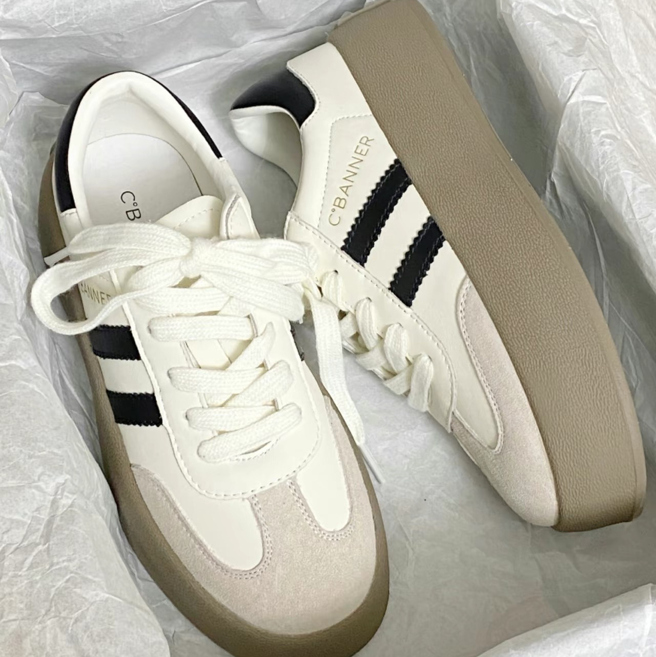 厚底德训鞋居然能这么好穿!!!! 脚感软乎乎的 要是有男码就好了~ 七夕情人节礼物就可以搭情侣鞋了 黑白配色尊滴好好看固個 而且大厚底设计显得小个子比例嘎嘎好~ 麂皮拼接设计也蛮显质感的 鞋码比较标准 也贼拉百搭