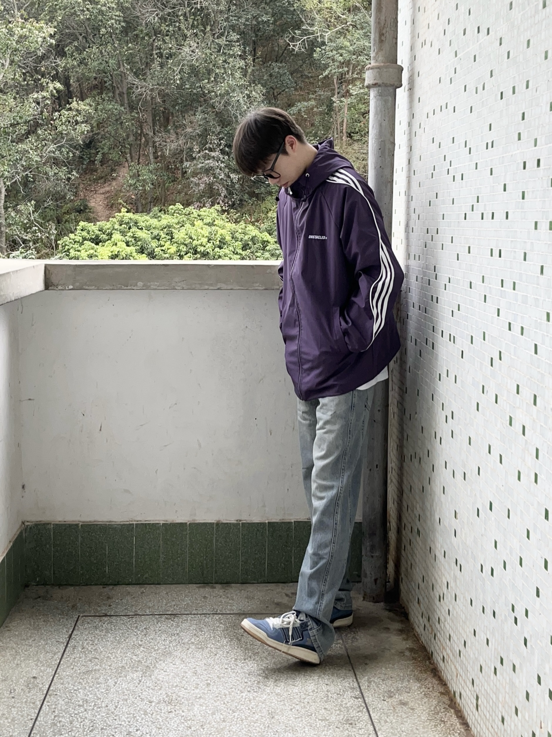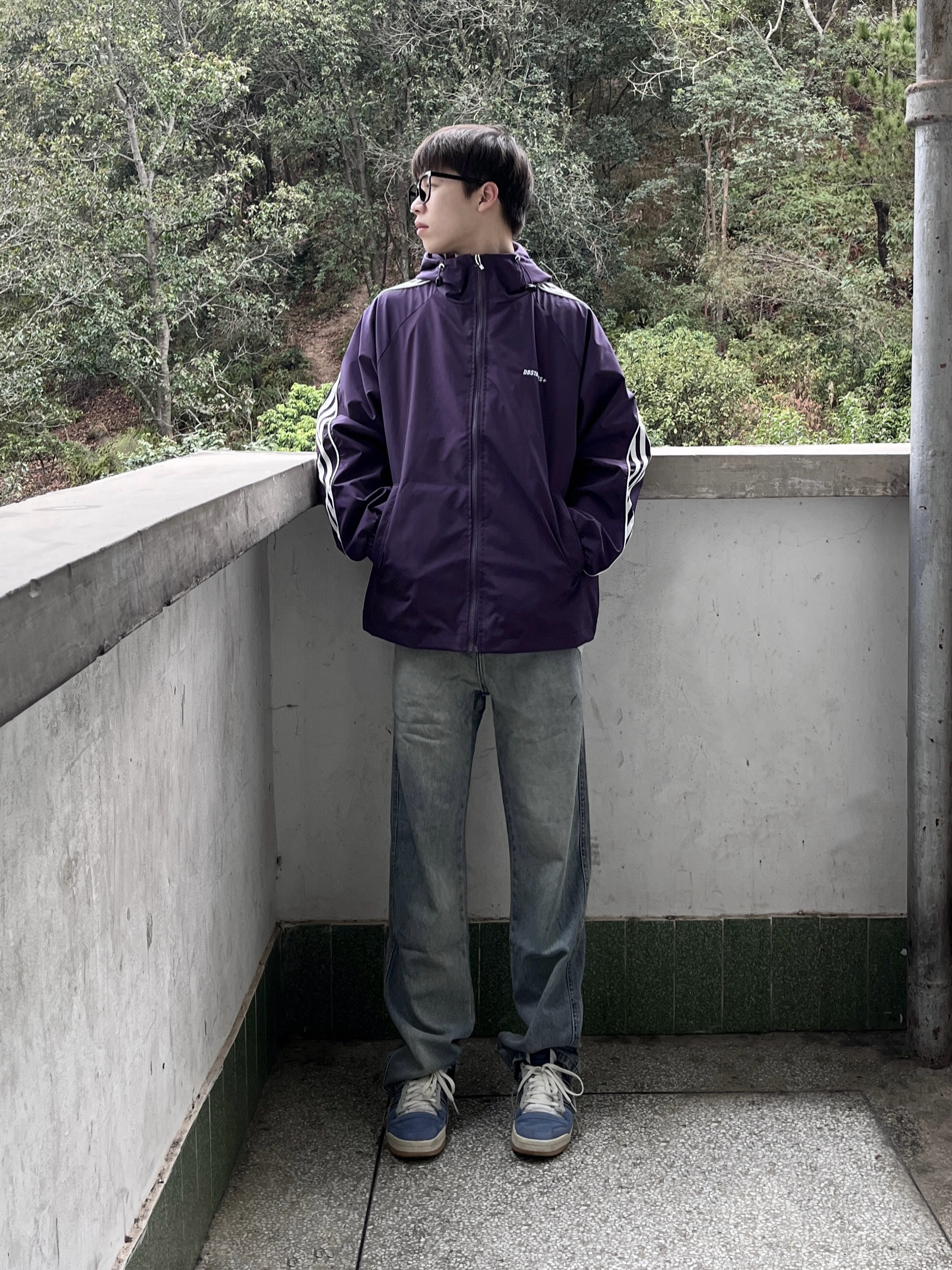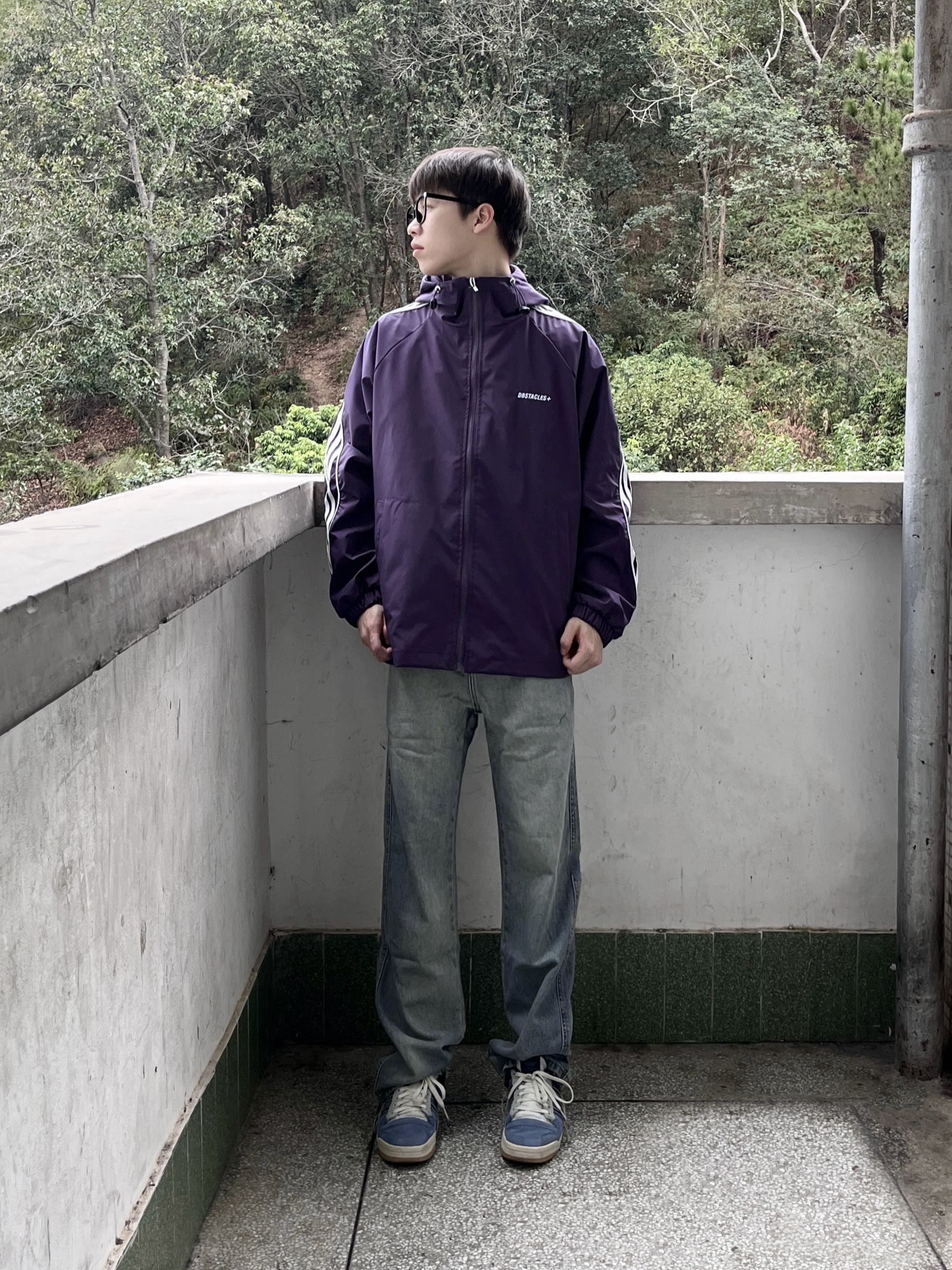 今日份穿搭分享look👀 衣服是紫色的户外山系风冲锋衣 防风防水防污三合一 面料也很舒适 再搭配一条浅蓝色做旧牛仔裤 版型宽松直筒 穿上后很显腿型 最后经典板鞋点缀 脚感柔软透气 一套搭配下来 百搭又好看
