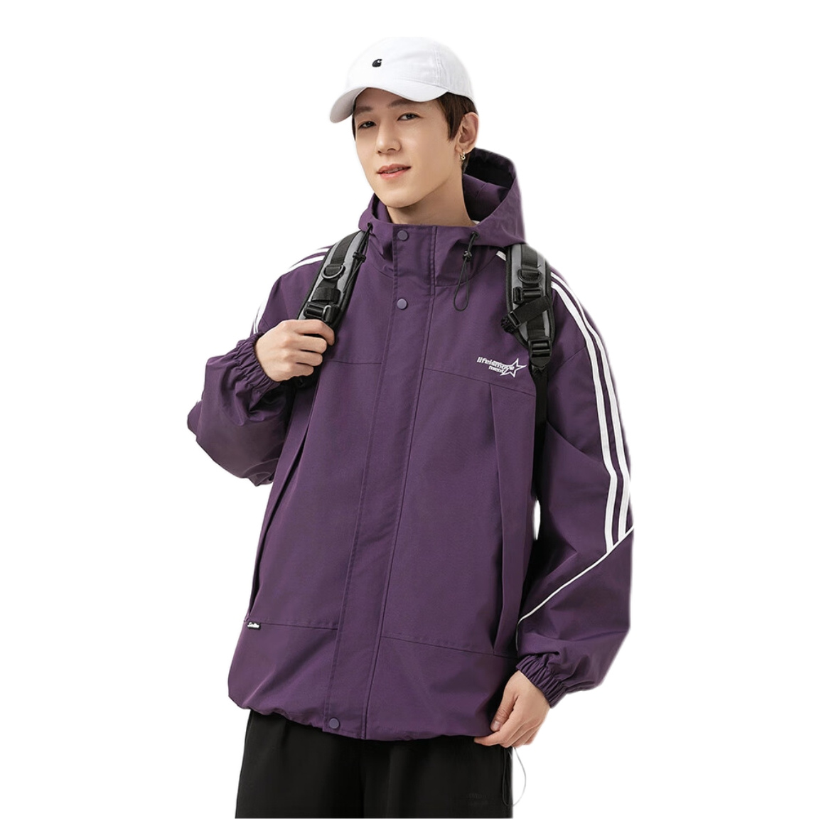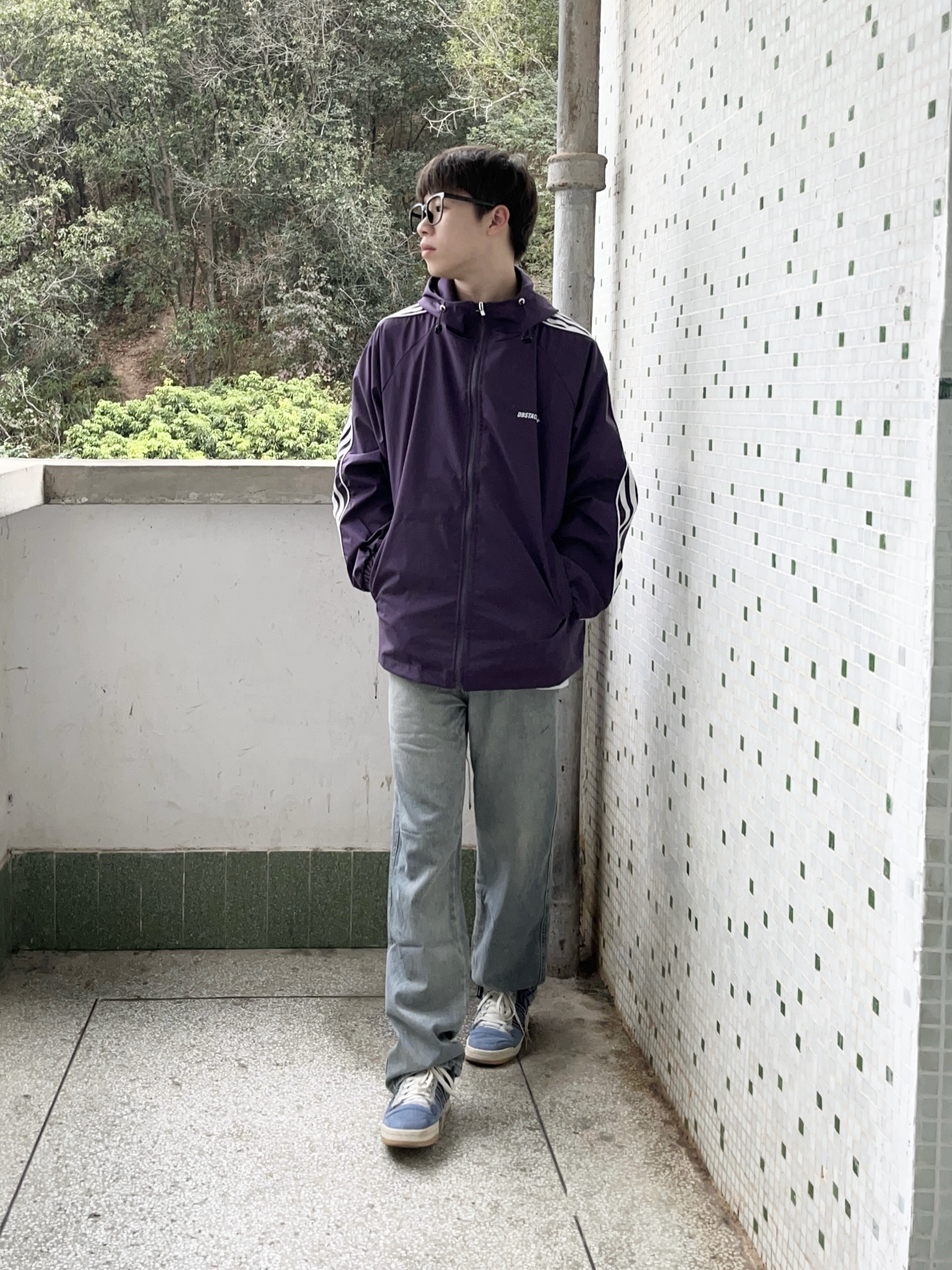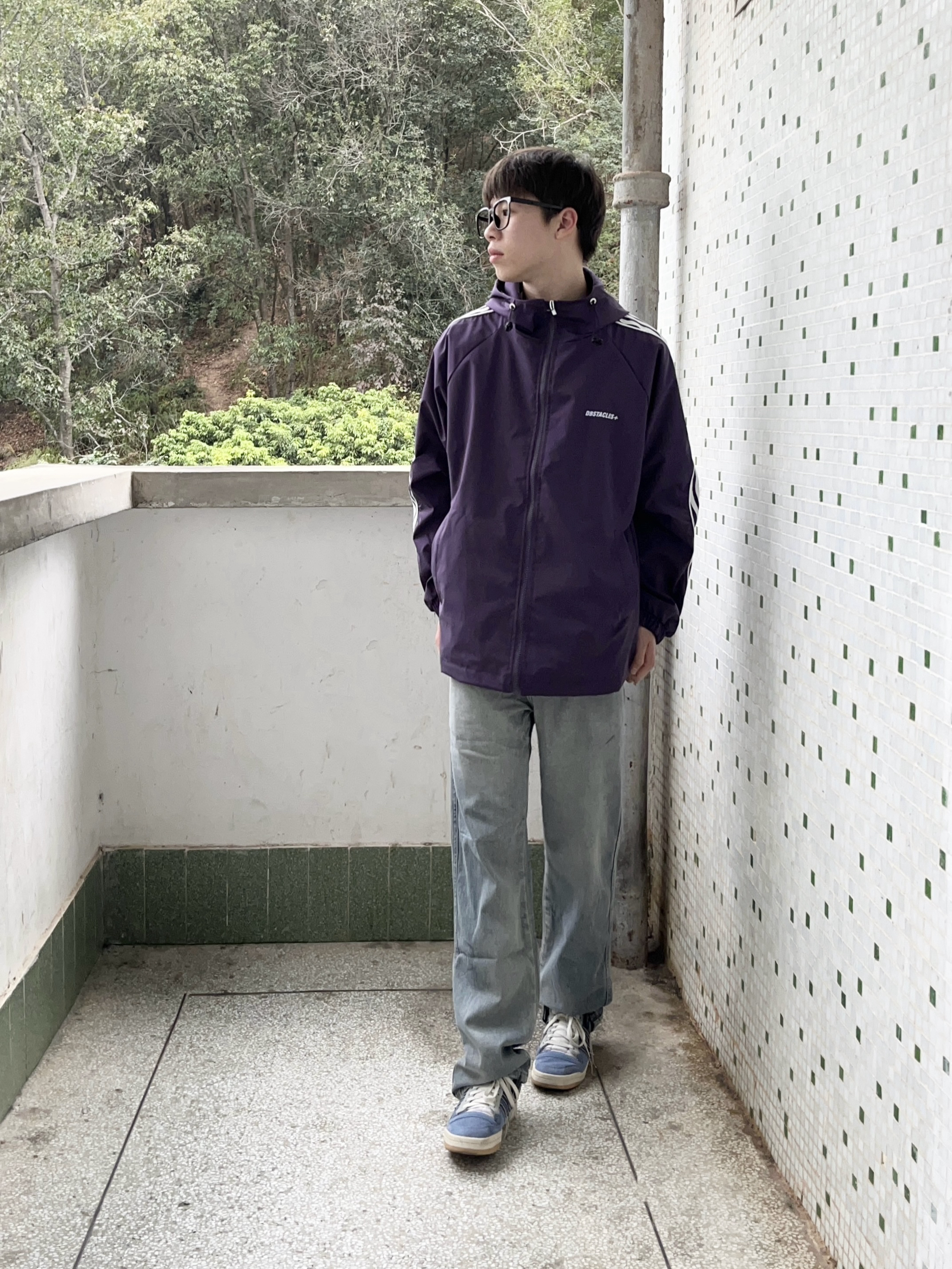 今日份穿搭分享look👀 衣服是紫色的户外山系风冲锋衣 防风防水防污三合一 面料也很舒适 再搭配一条浅蓝色做旧牛仔裤 版型宽松直筒 穿上后很显腿型 最后经典板鞋点缀 脚感柔软透气 一套搭配下来 百搭又好看