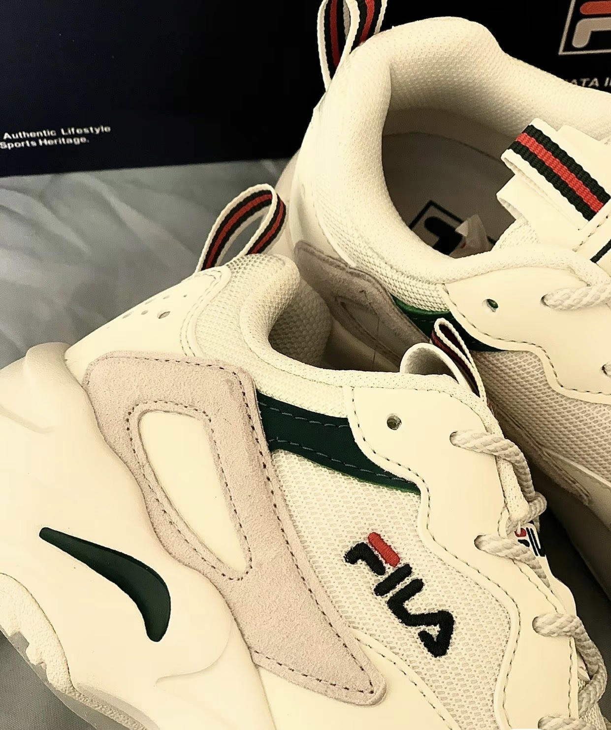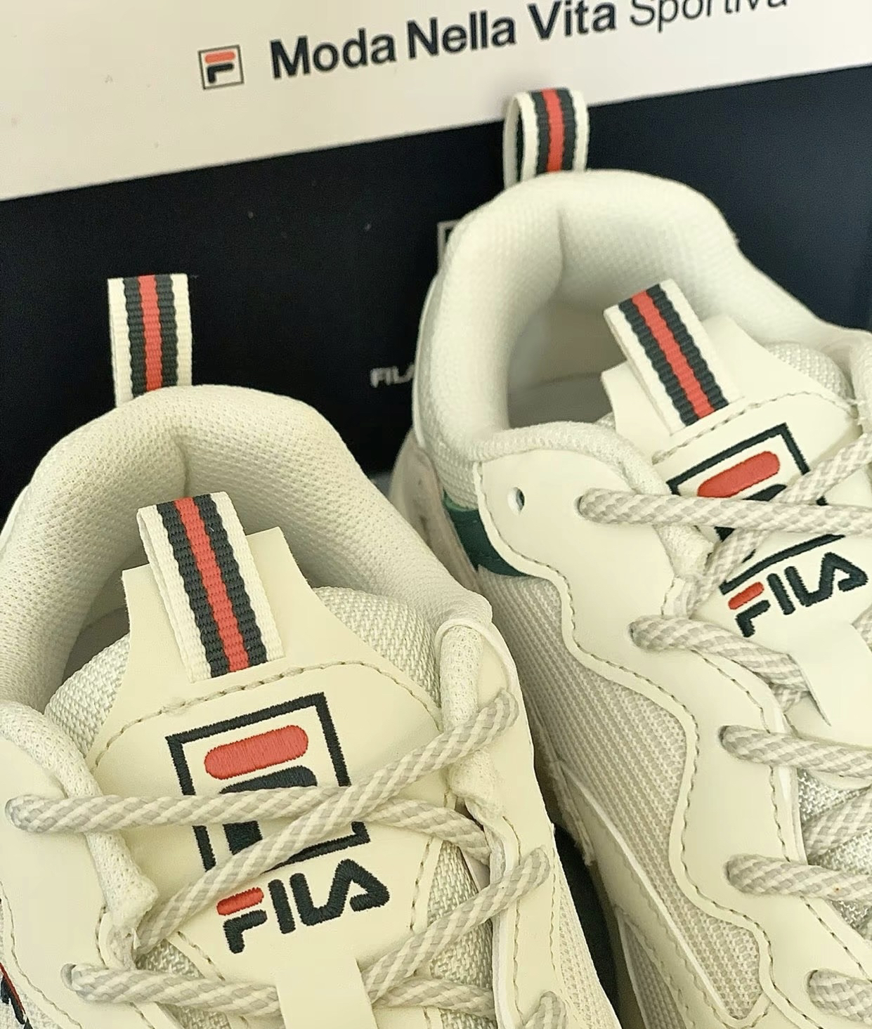 鞋子整体采用了麂皮和织物拼接材质,轻盈透气!米色的鞋面搭配灰色/红色和绿色,暗色 系列,层次感分明,鞋侧绿色的Fila 字样,特别醒目,复古感十足 鞋舌和鞋后跟处加入了亮色的鞋提和Fila Logo设计,厚厚的鞋底,增高3CM完全不成问题整体颜值特别好看! 型四季百搭,老爹鞋型男生女生都可以轻松驾 驭