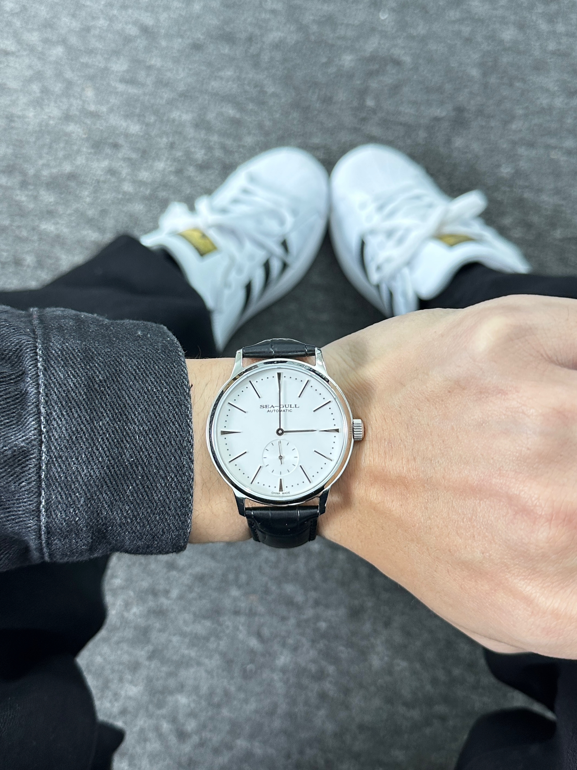 👔:内搭纯棉白色长袖,外穿黑色牛仔夹克,上身帅气有型还百搭; ⌚:全自动机械表,表带是柔软真皮,戴挺舒服的,也不会割手,白色表盘简约时尚,走时挺准的,带了半个多月了,目前还没有出行误差; 👖:水洗做旧牛仔裤,黑色直筒宽松款,平时可以搭配街头美式或者休闲风都OK; 👟:低帮小白鞋,经典款贝壳头,包裹舒适百搭款;