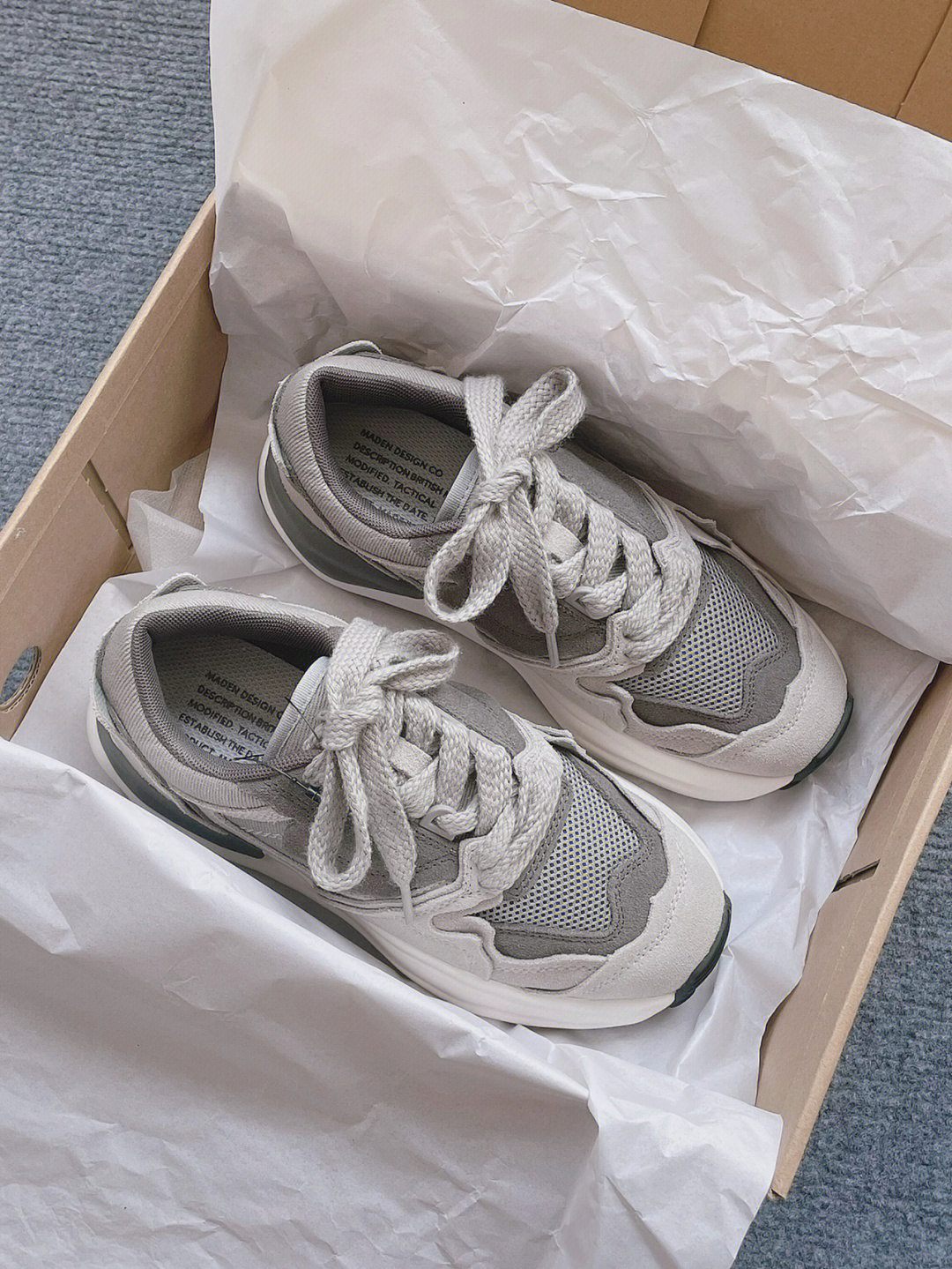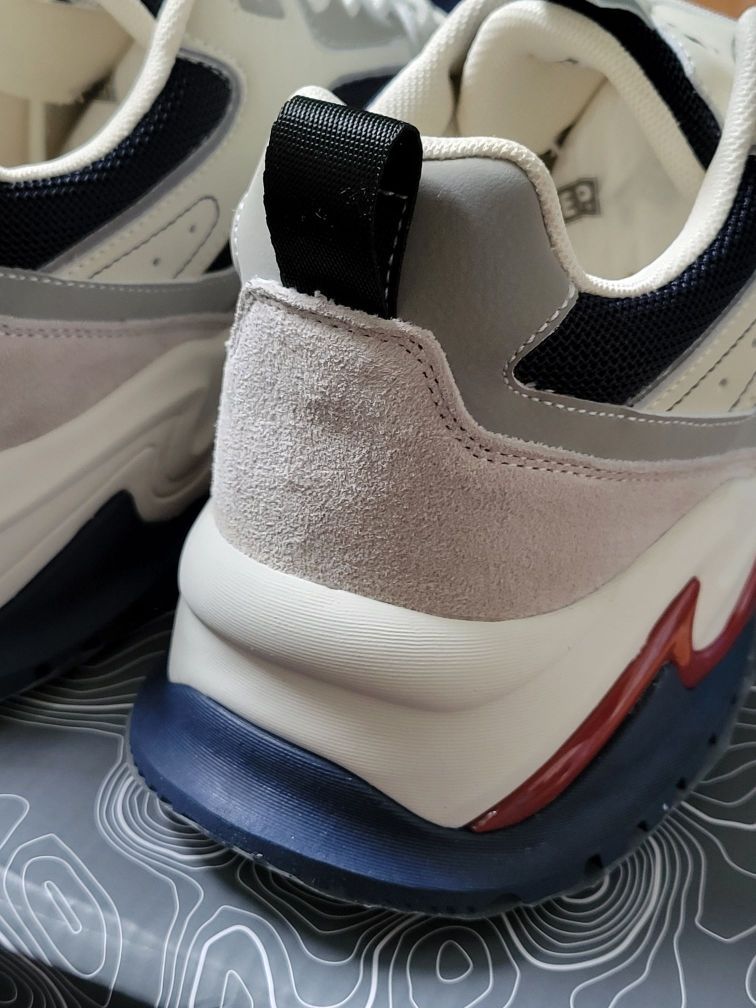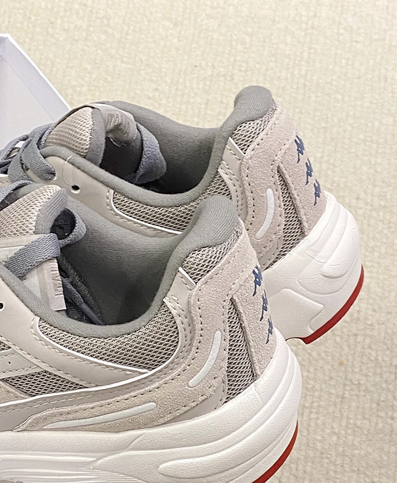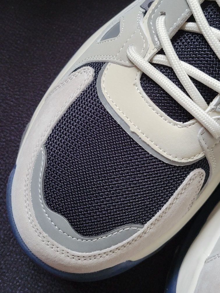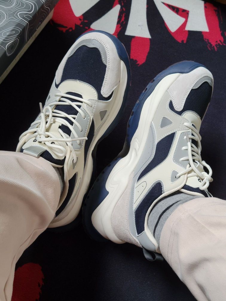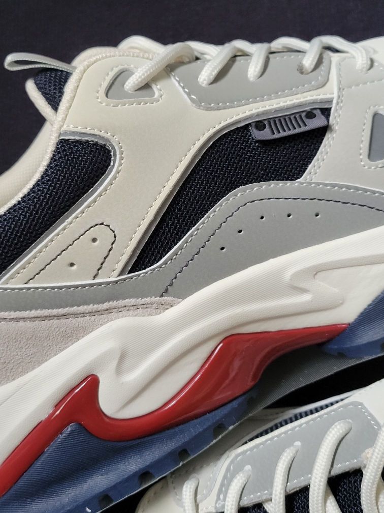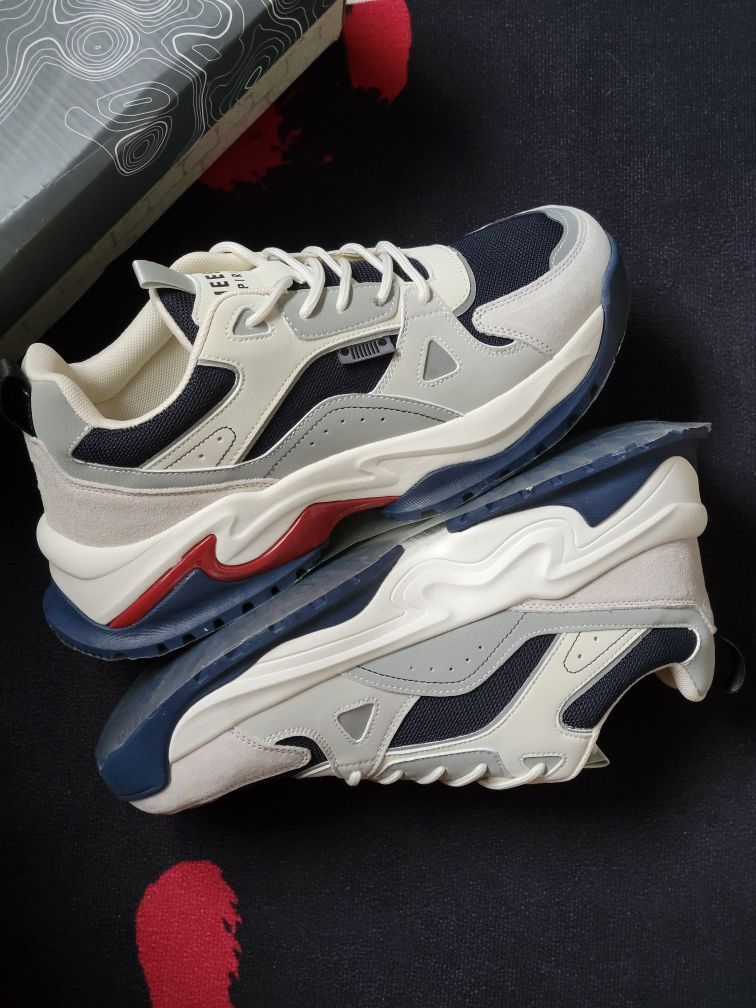 吉普休闲鞋整体简约低调的灰色调搭配红蓝点缀,多材质拼接鞋面有层次感🚀,鞋头织物面增加了透气性,穿着更舒服透气🍃 中底有点厚像老爹鞋,带有4cm左右的増高,上脚变大长腿❗橡胶鞋底防滑耐磨,尺码个人感觉偏小,平时运动鞋穿44.5码的这双45码刚好能穿😬 平时搭配束脚裤或者宽松一点的直筒休闲裤来穿很好看✔️