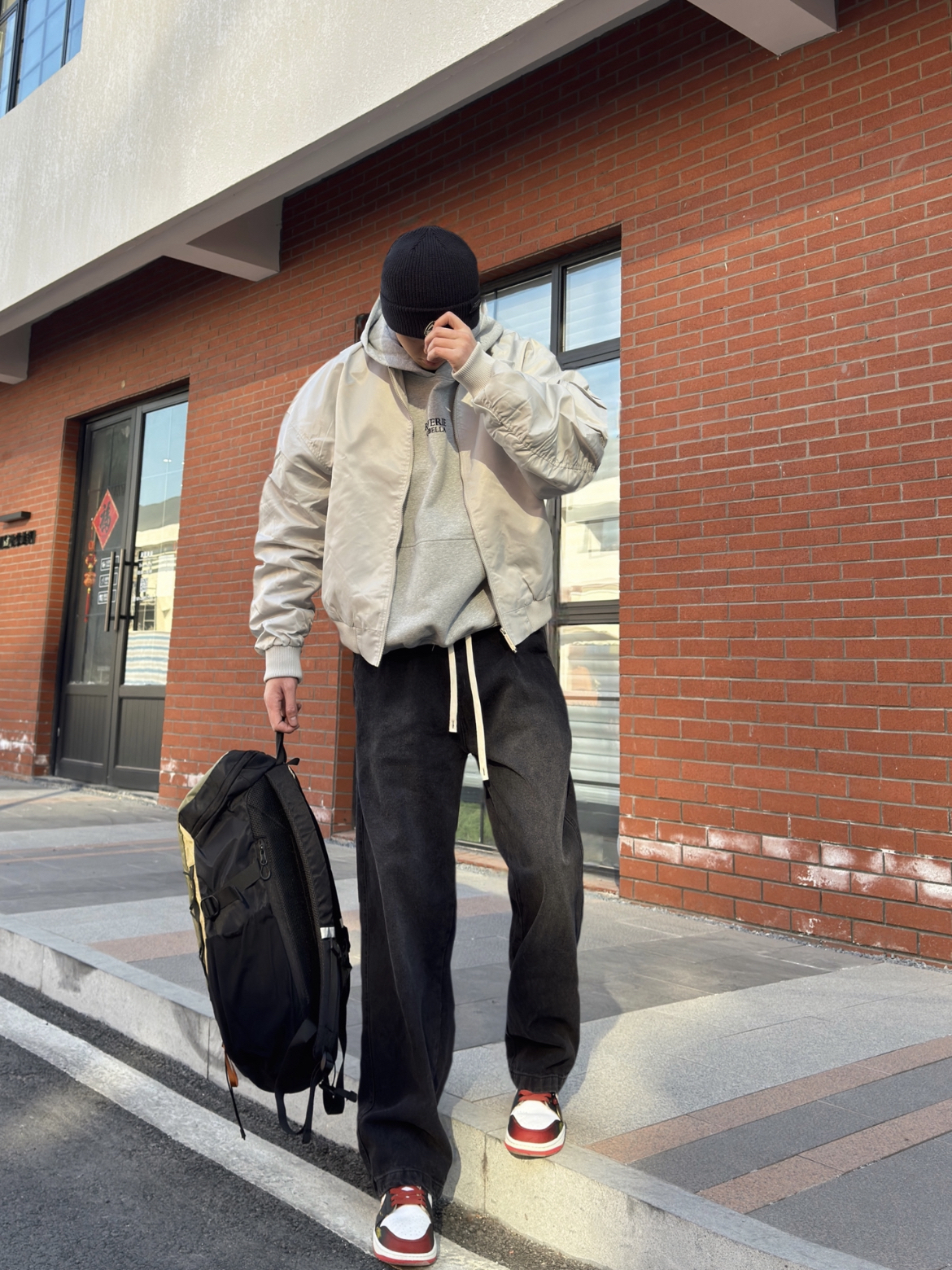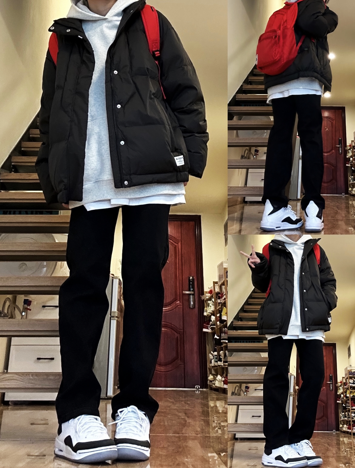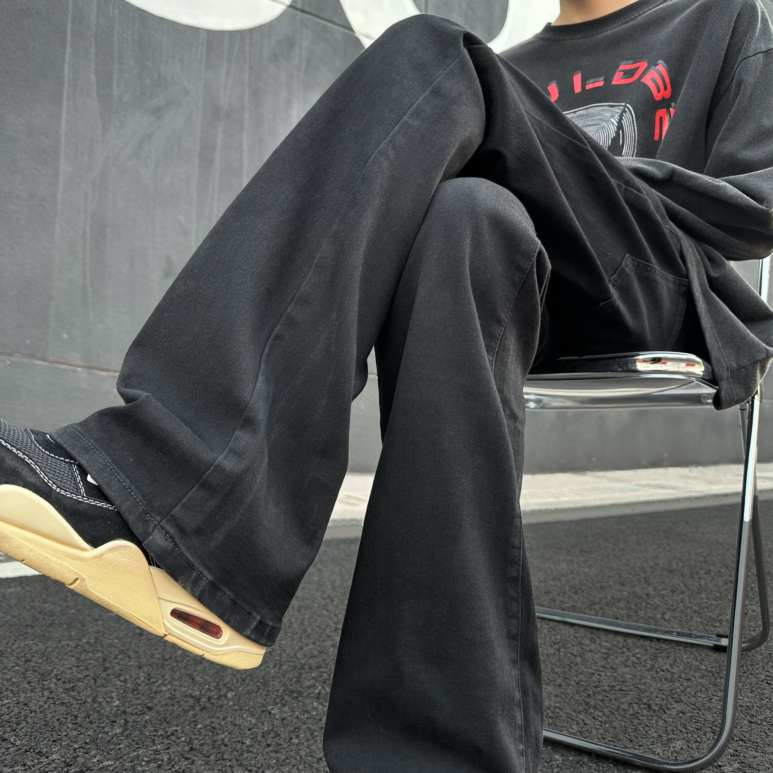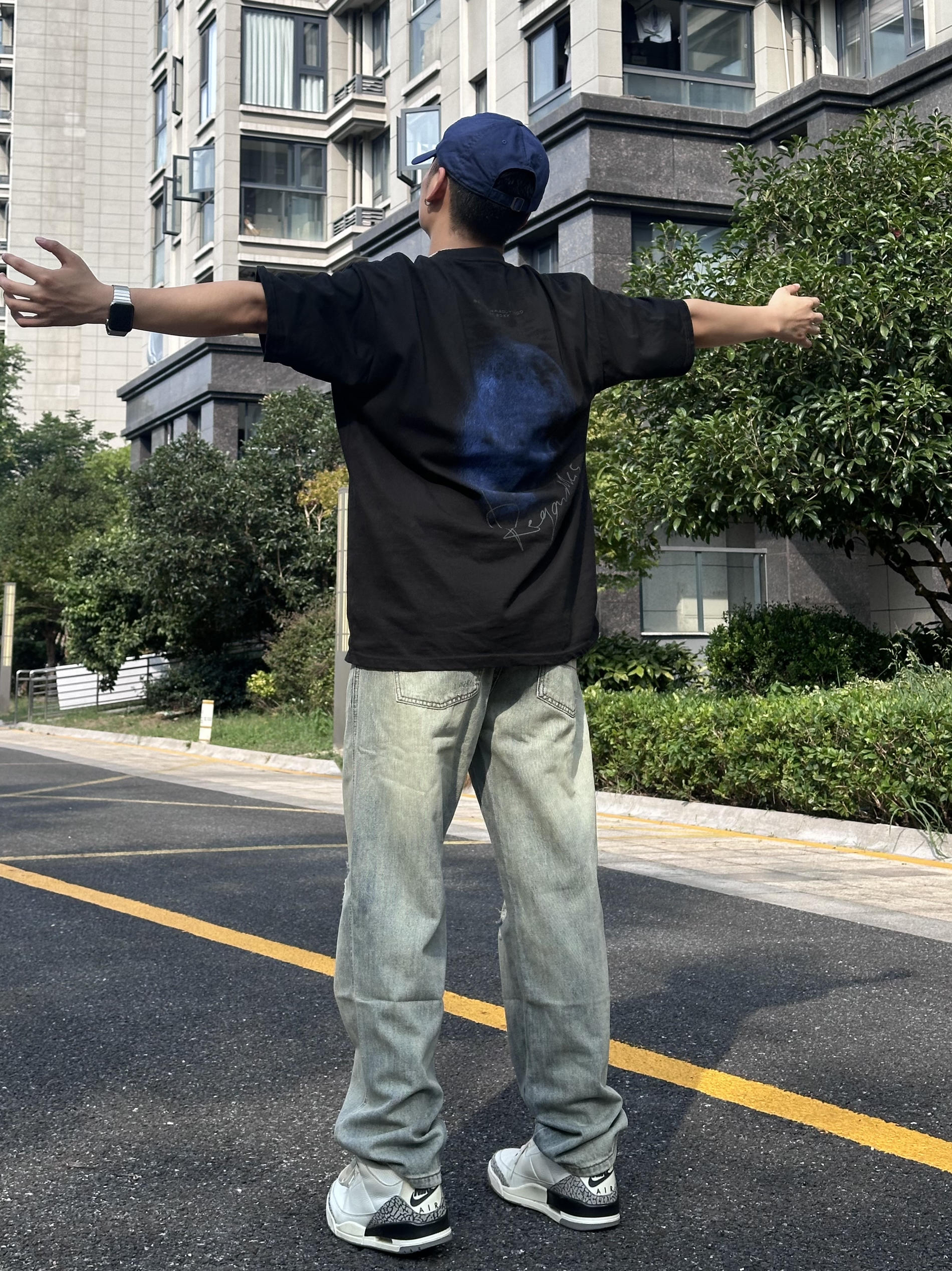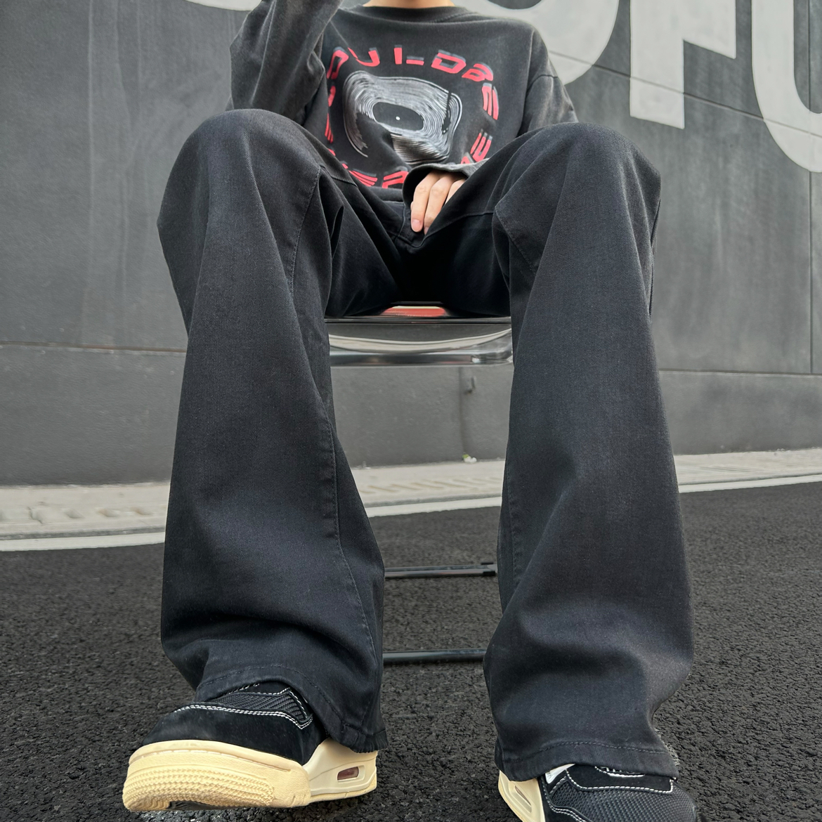 今日份整体主打黑色高街穿搭,上身搭配了一件黑灰色T恤,下身搭配黑色水洗牛仔裤,直筒休闲的款式,简约就能get的时髦感
