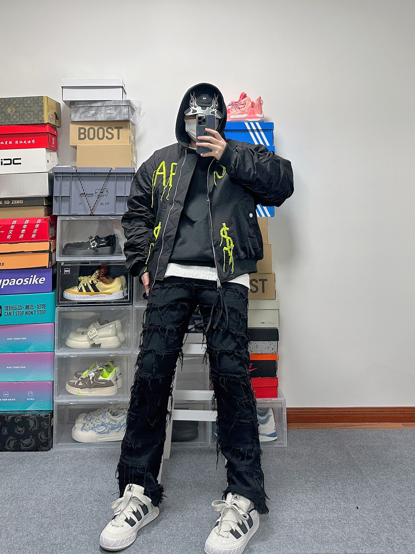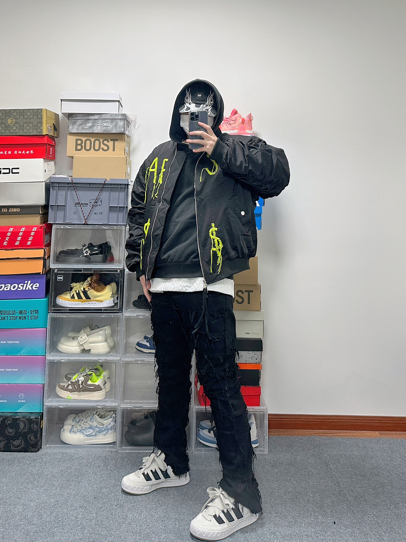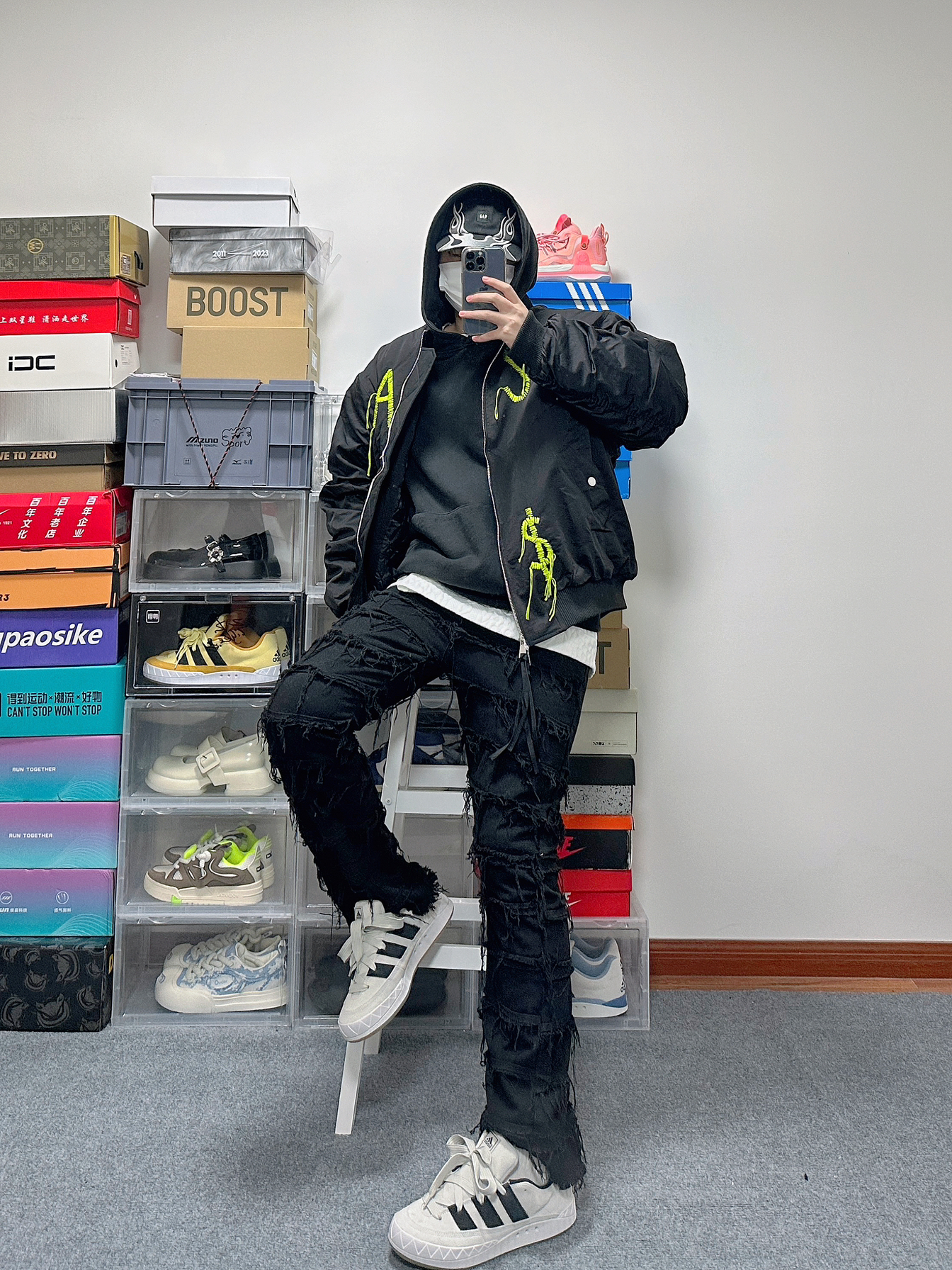 高街和Vibe的风格真的是帅哥风格 这么穿说不帅都是假的 上衣是飞行员夹克 版型很正上身看起来很有型肩膀看起来很宽 涂鸦设计也是挺有意思的 给本身全黑色系的穿搭增加点缀 内搭了一件黑色卫衣和白色打底 叠穿的层次感很Nice 裤子破坏拉花不仅呼应叠穿 而且版型上还可以修饰腿型 最后鞋子是Adiads的鲨鱼面包鞋 脚感着实还不错 上脚也很好看
