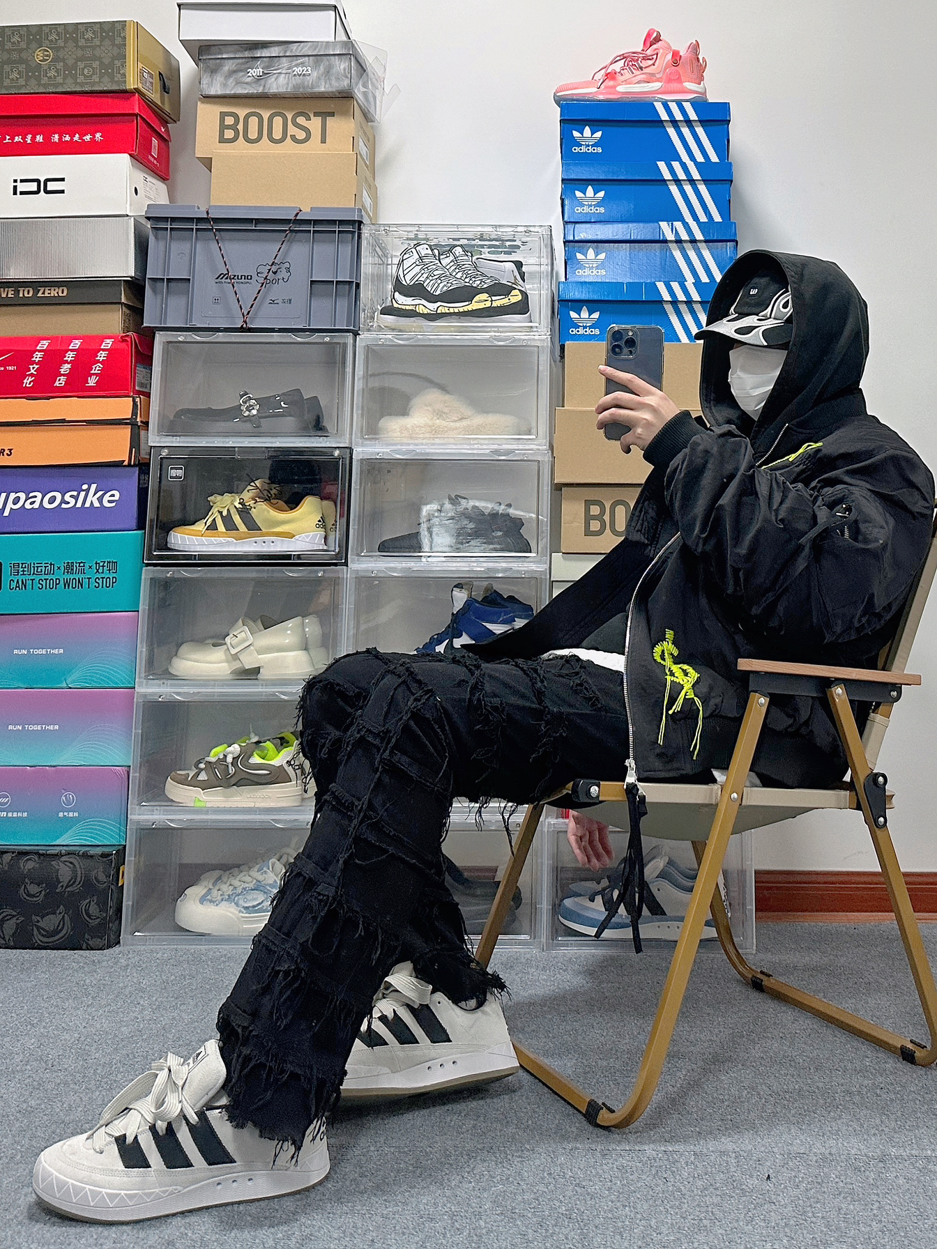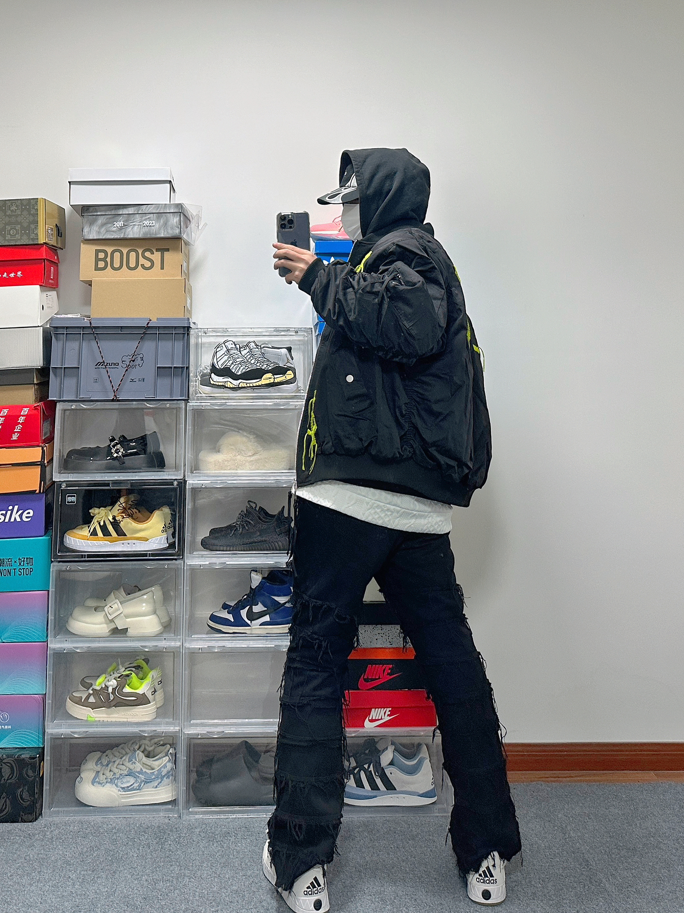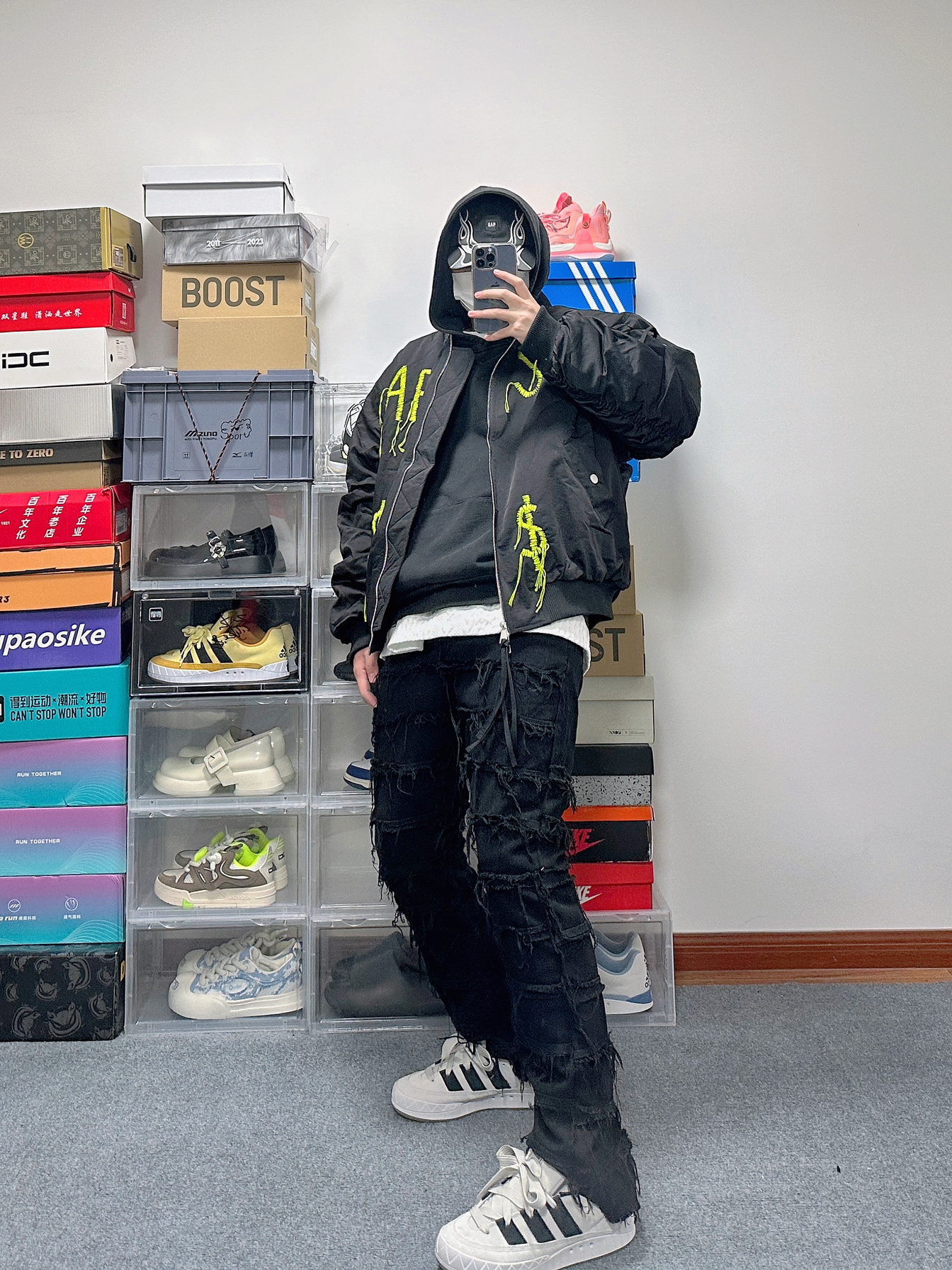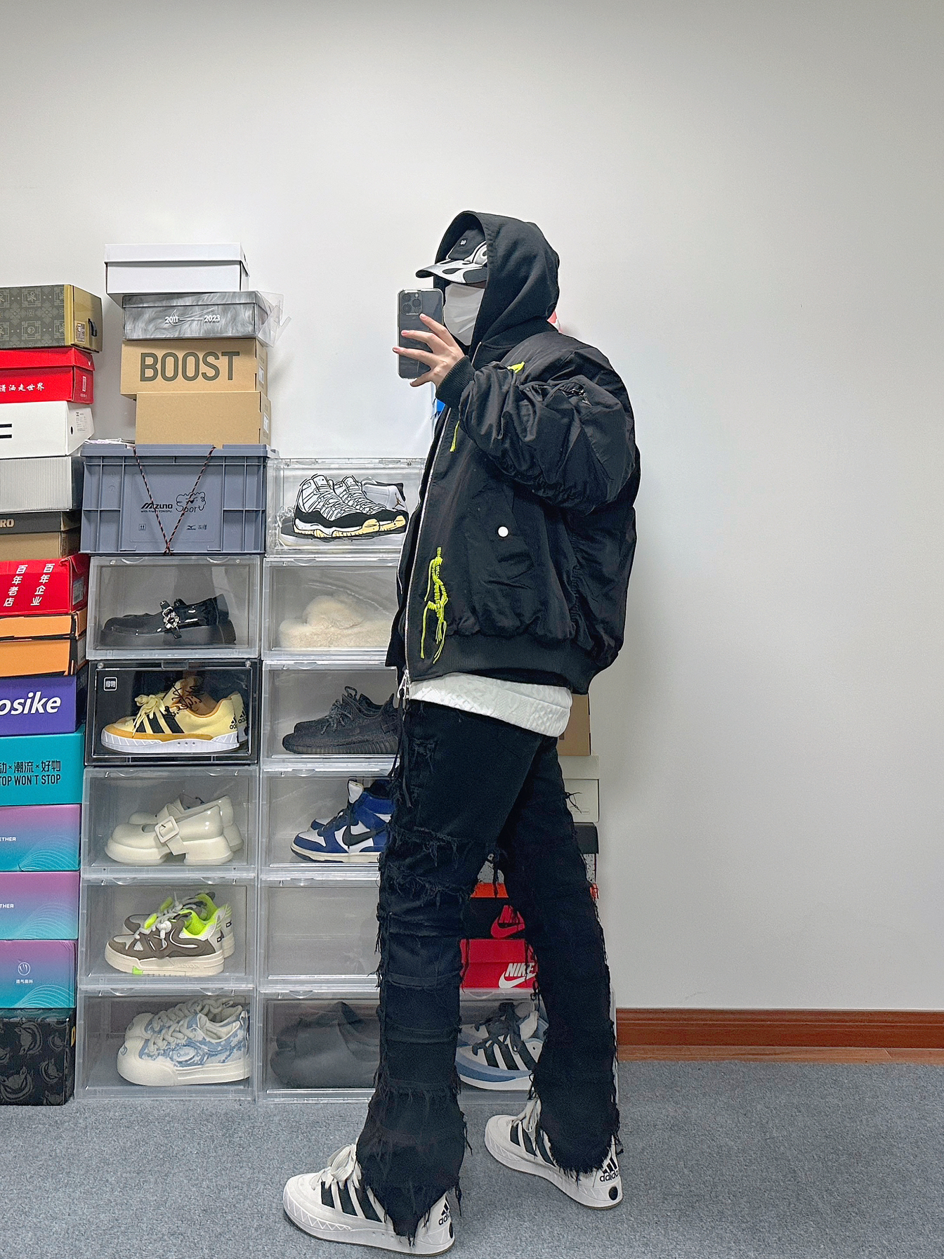 高街和Vibe的风格真的是帅哥风格 这么穿说不帅都是假的 上衣是飞行员夹克 版型很正上身看起来很有型肩膀看起来很宽 涂鸦设计也是挺有意思的 给本身全黑色系的穿搭增加点缀 内搭了一件黑色卫衣和白色打底 叠穿的层次感很Nice 裤子破坏拉花不仅呼应叠穿 而且版型上还可以修饰腿型 最后鞋子是Adiads的鲨鱼面包鞋 脚感着实还不错 上脚也很好看