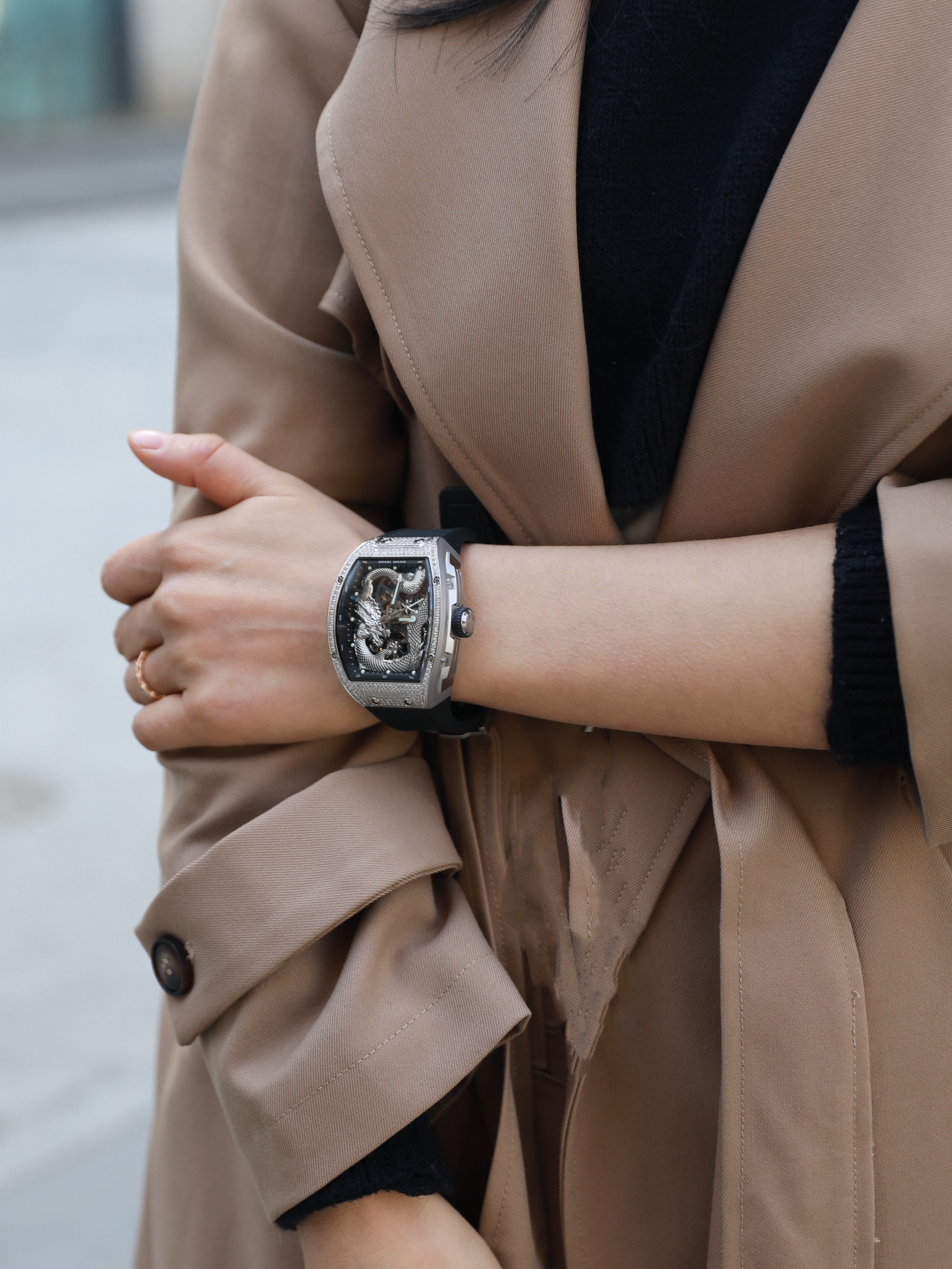 龙腾四海,重磅出场~ 今天霸气色加持,米色的风衣加彼赛BEXEI 家龙年限定的腕表 气场10米好不好😂 路人回头率超高! 这款酒桶型的造型,自动机械 还有夜光功能,最可圈可点的 就是龙款表圈内两条盘旋的龙 天呢,作为中国人,根本抵挡不了这神兽 寓意超好👍而且正值龙年 蛮有收藏的价值呢 礼盒还是一如既往的有质感 送礼也是不会出错的选择哦