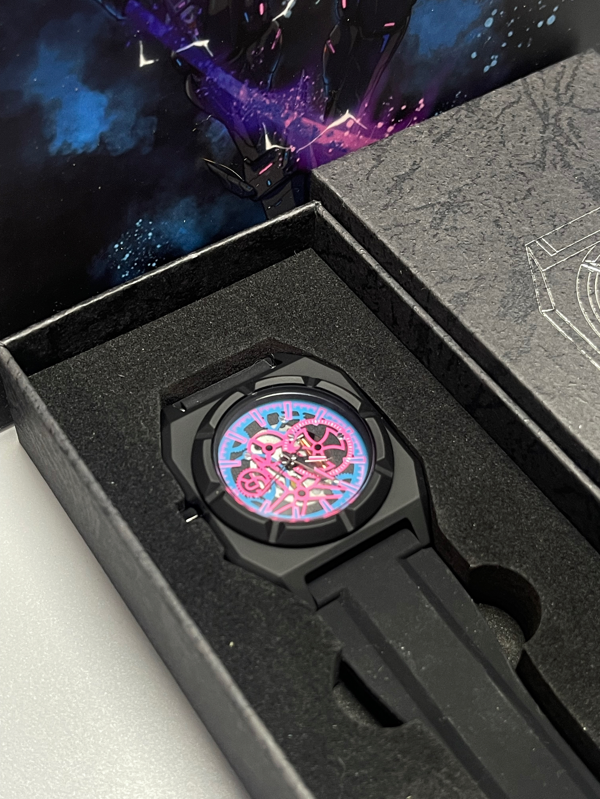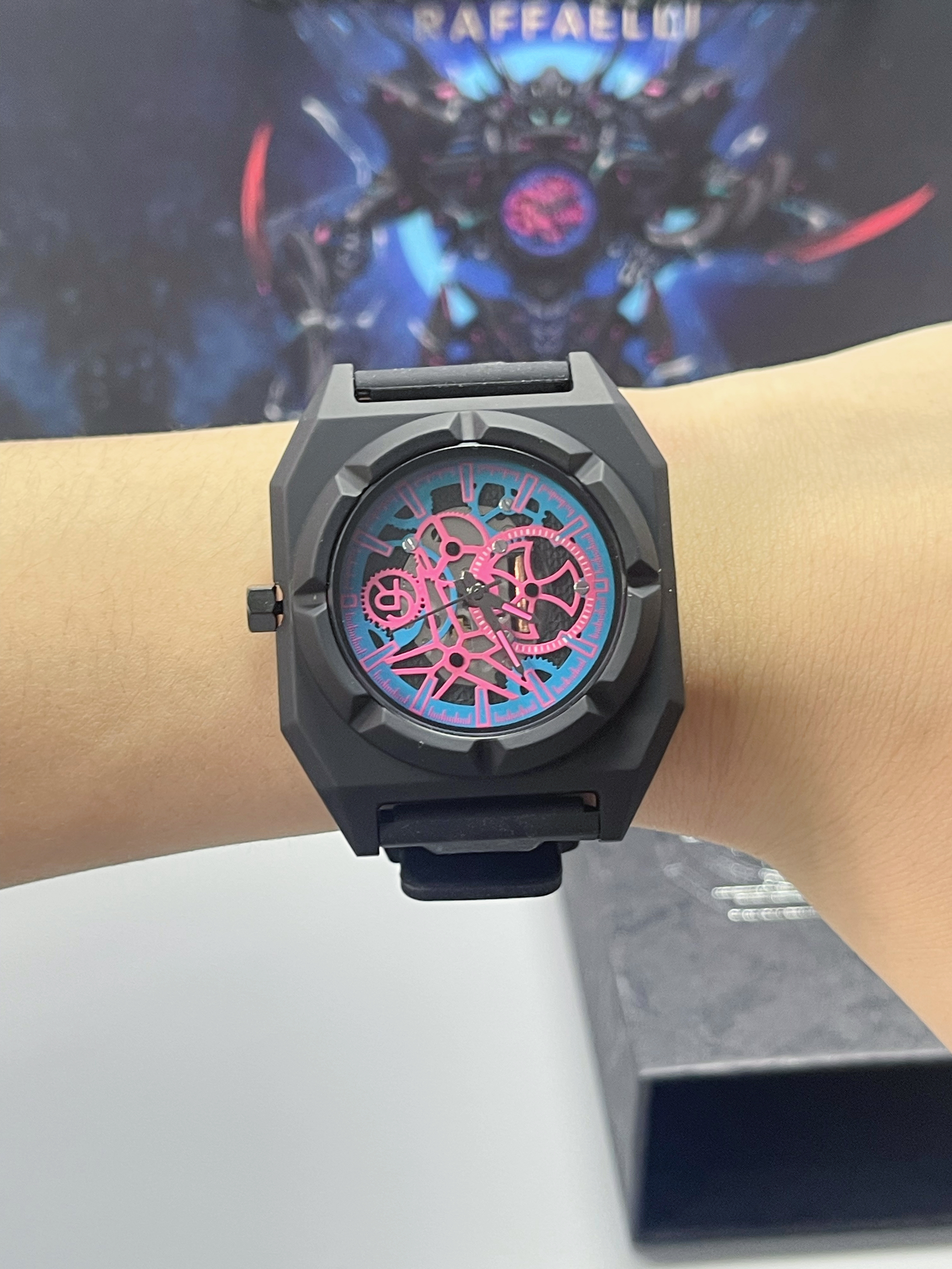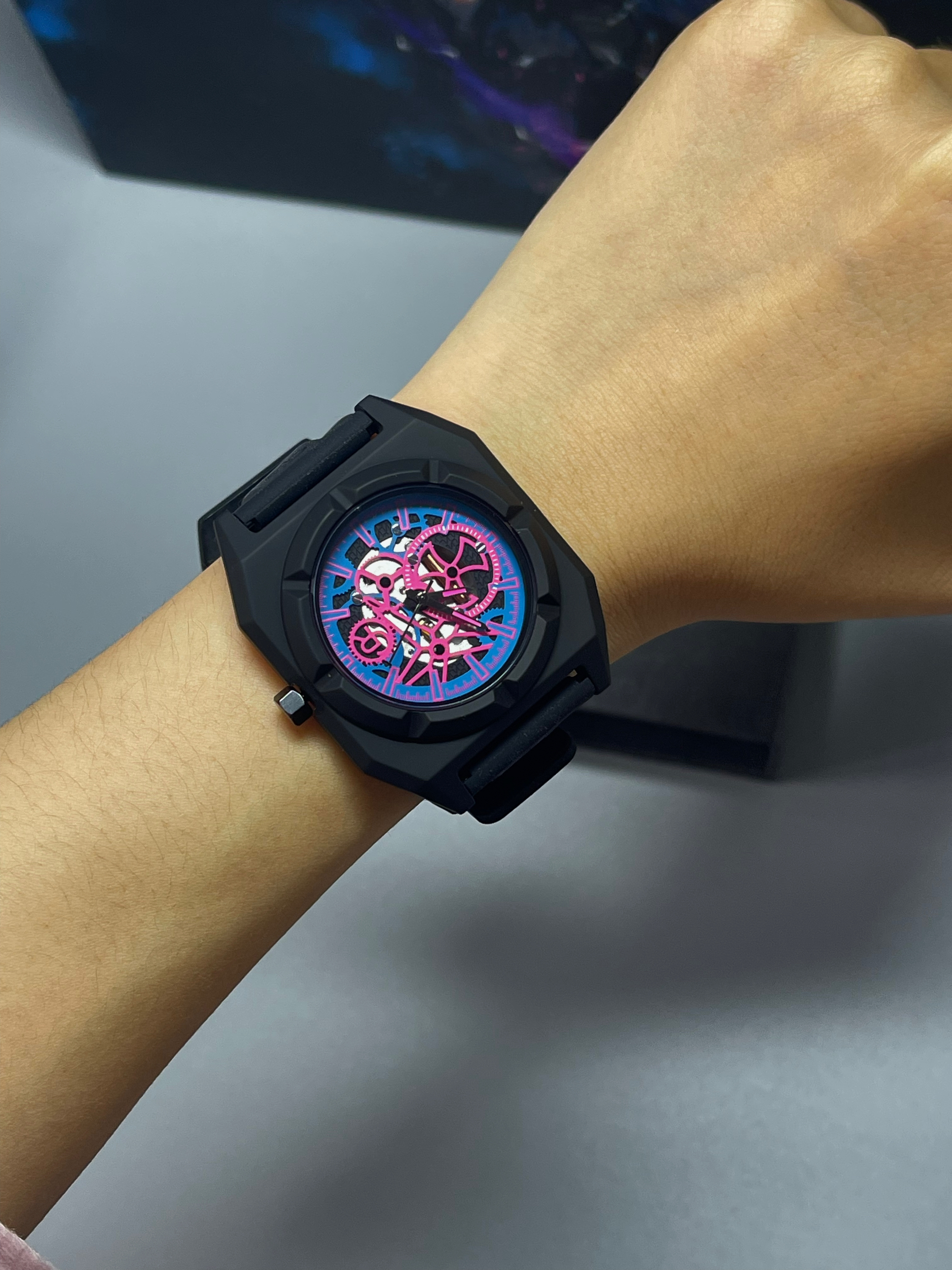这款手表有点酷到我了!哇颜值真的好可 黑色为主的表身看上去有点小酷 粉蓝的撞色设计一下子就吸引到我了 柔柔软软的表带,上手hin舒服的哇 礼盒包装hin高级有档次~