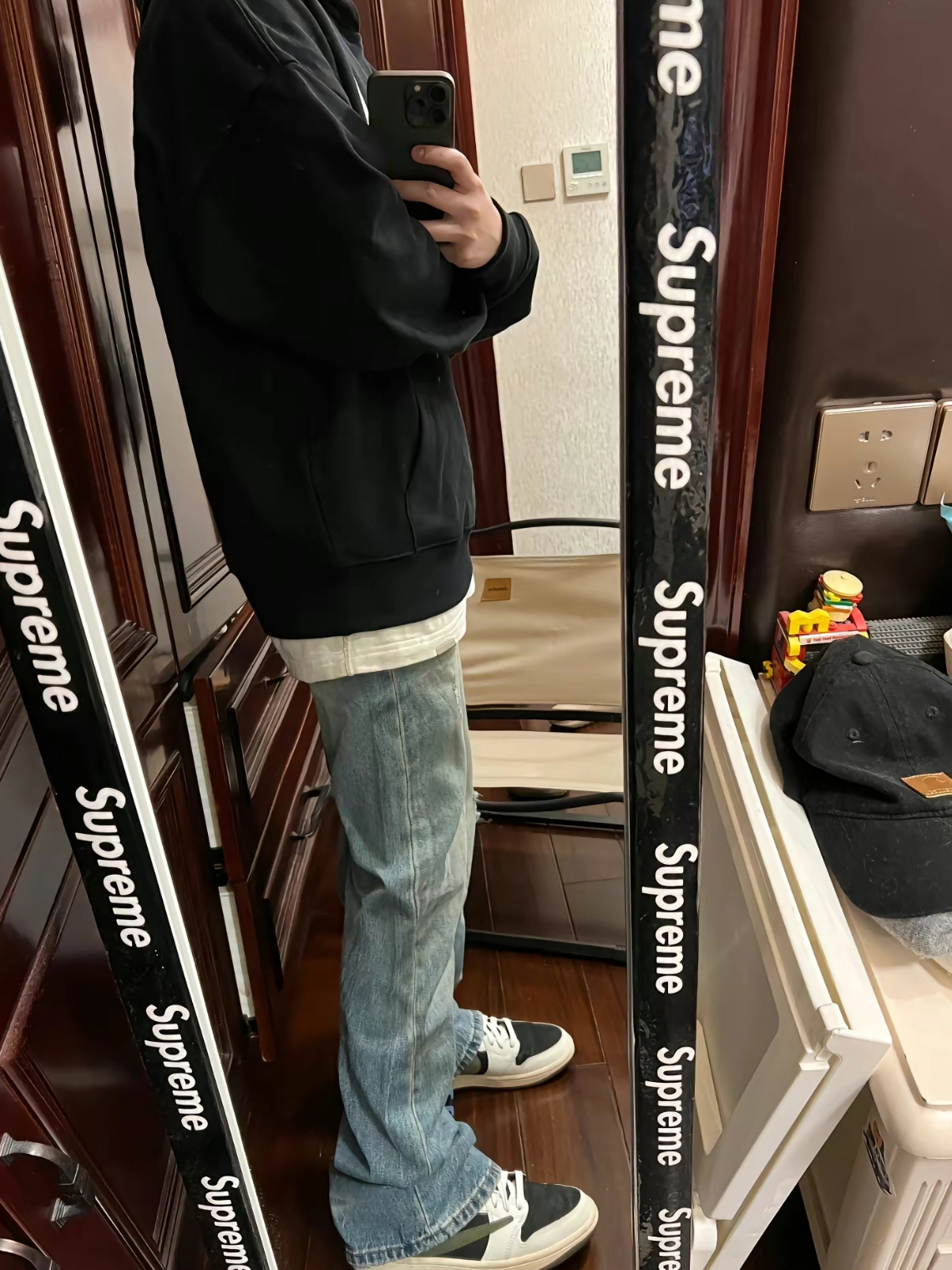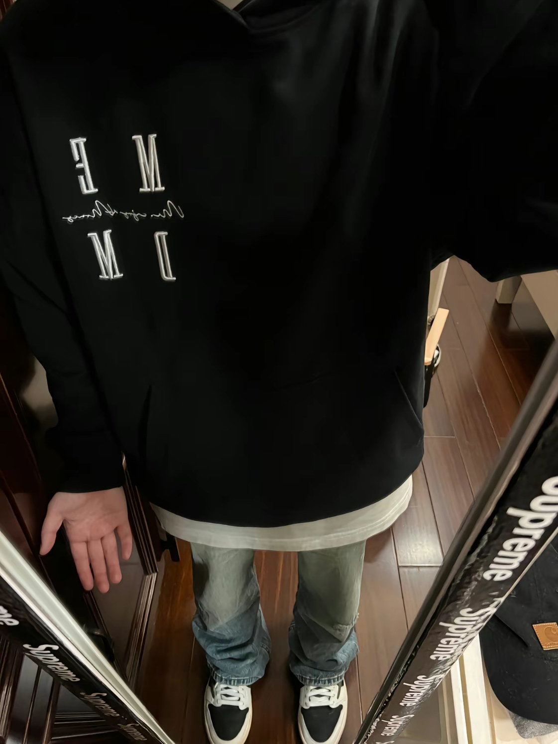 今日上身一件黑色色字母卫衣,搭配一条简约水洗蓝牛仔裤穿MEDM卫衣果然还是很香的,秋冬氛围感爆棚衣服的版型比较宽松,面料也很糯叽叽摸起来很舒服,不管是单穿还是穿在里面都绝美喜欢的兄弟们可以冲